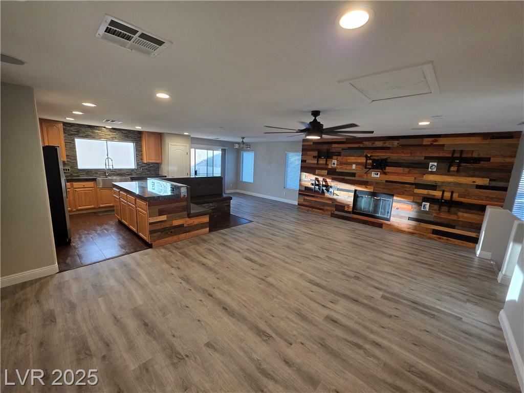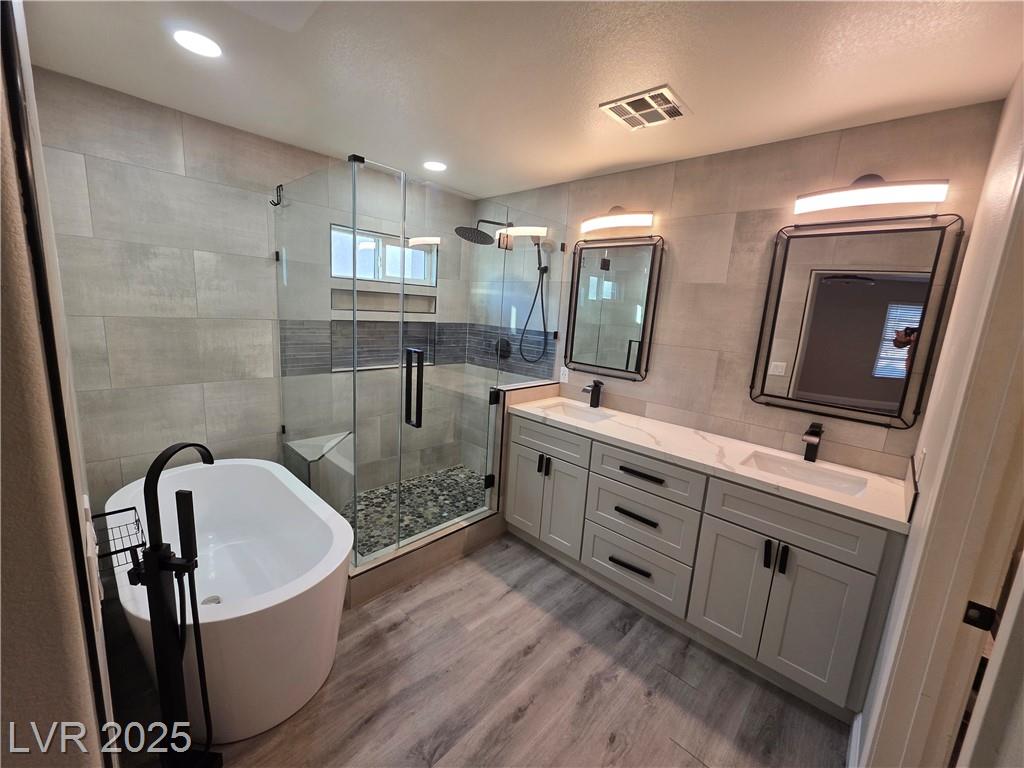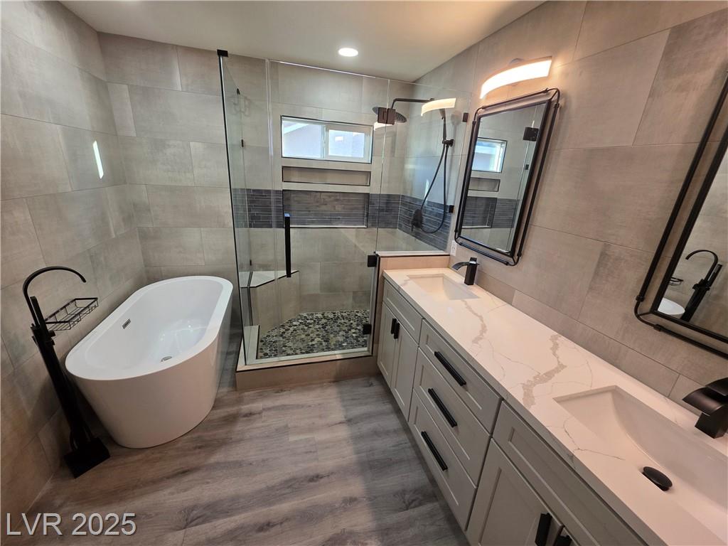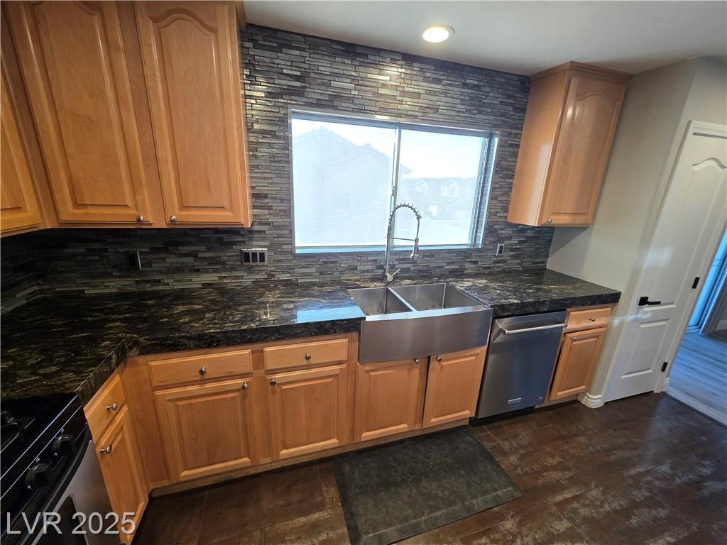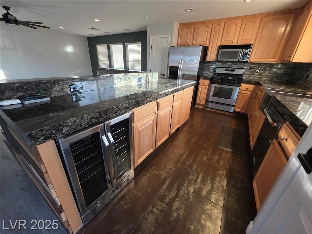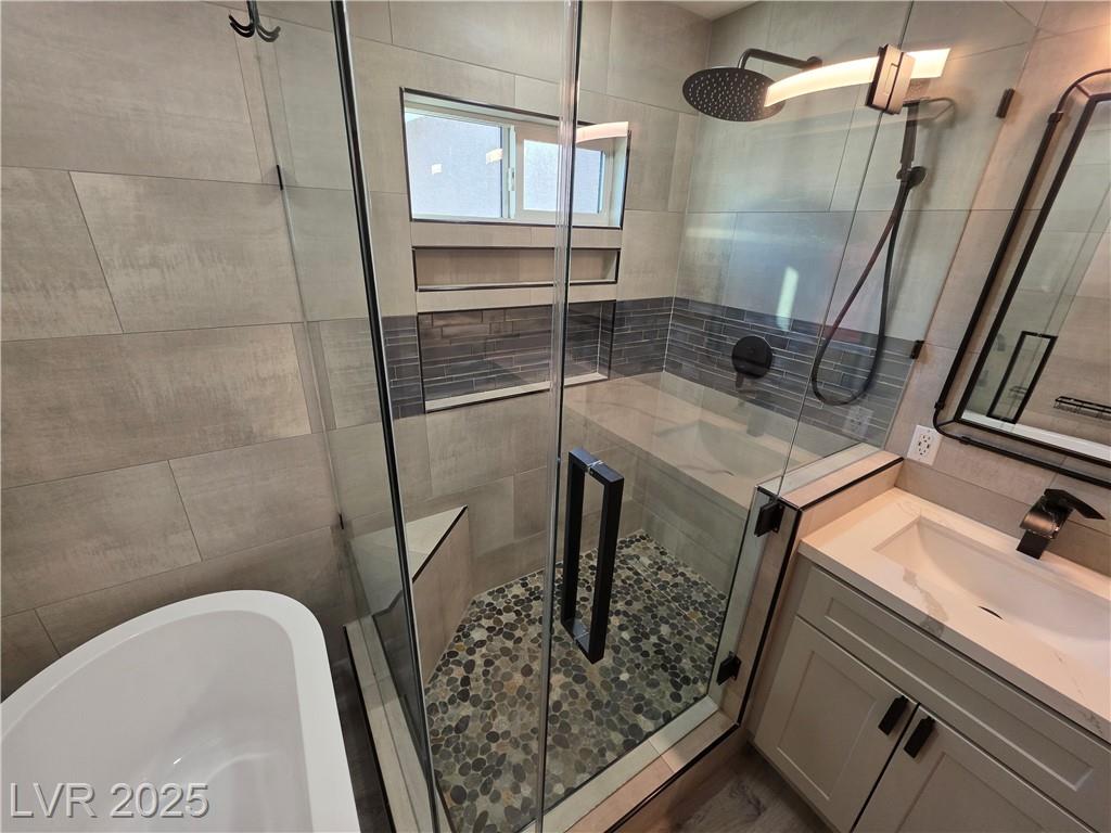 Highly upgraded Henderson/Silverado Ranch area corner lot home offering 4 bedrooms & 2.5 bathrooms. This lovely renovated split-level home offers so many nice options. Beautifully upgraded kitchen offers all stainless steel appliances, extra cabinets in a friendly L-shaped configuration, wine fridge, farm-style sink & added eating area overlooking the huge living area able to accommodate up to 5 tv's. There is even a balcony overlooking the backyard. Rolladen shutters and upgraded ceiling fans throughout ! The huge Primary Bedroom closet has California Closets offering lots of possibilities. The Primary bathroom with farm-style door, separate garden style tub, stunning walk-in shower and dual sinks. Don't miss. Downstairs offers another large family room, 3 nice-sized bedrooms and a great entertaining backyard. Great use of concrete, synthetic grass and desert landscaping highlight the area with a covered patio. Don't miss this stunner. Lots of parking possibilities being on a corner!