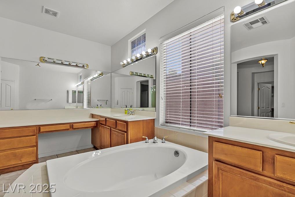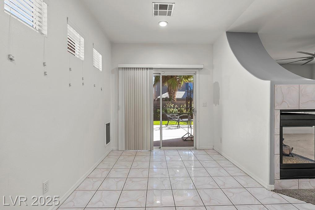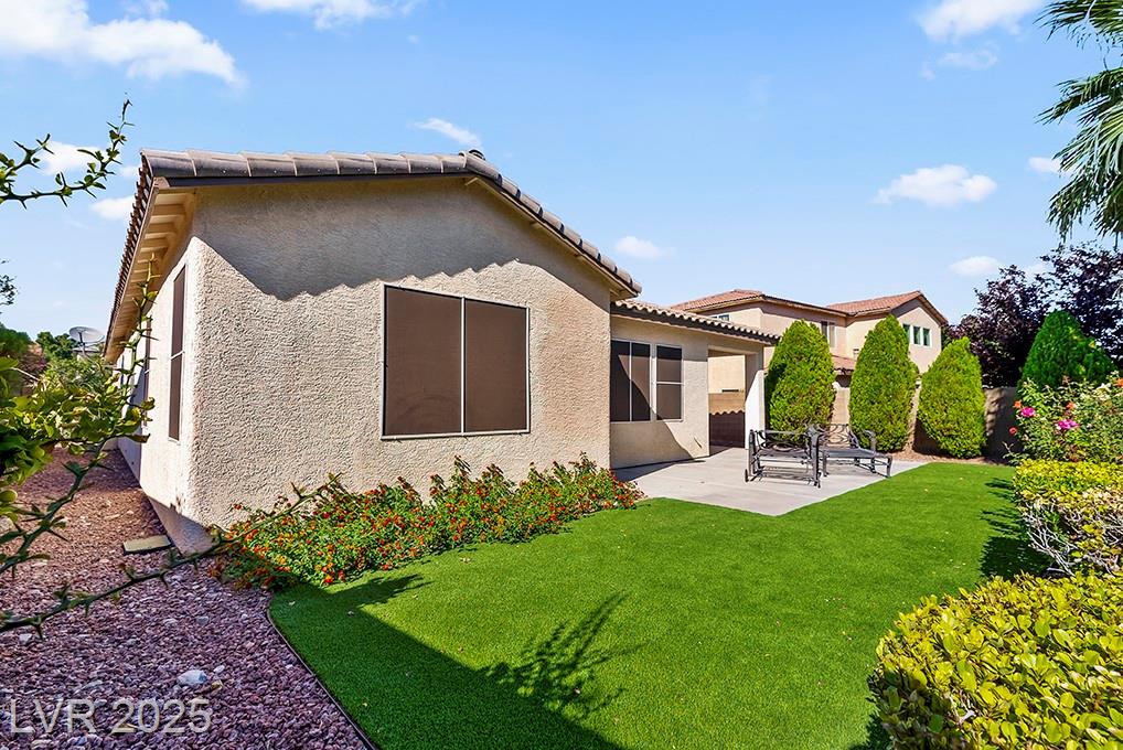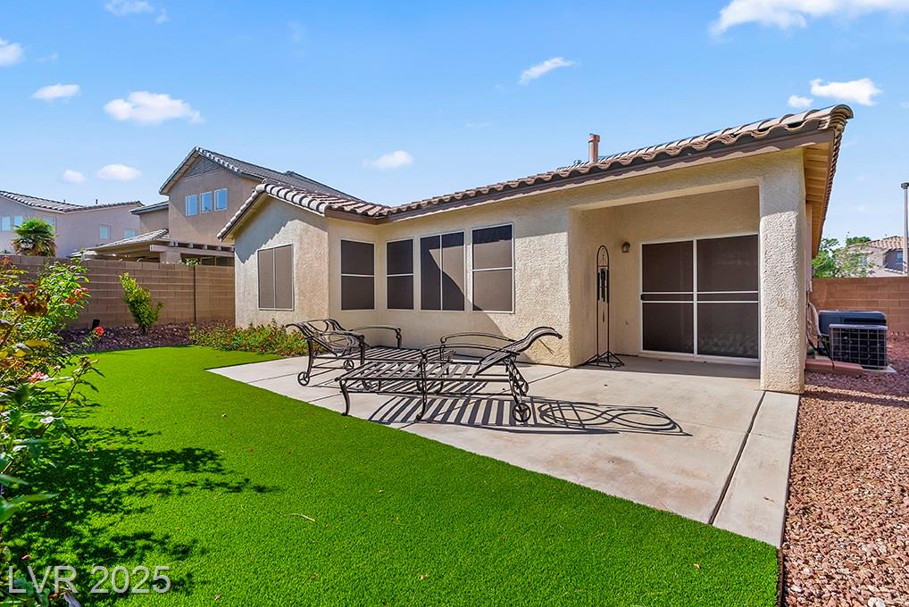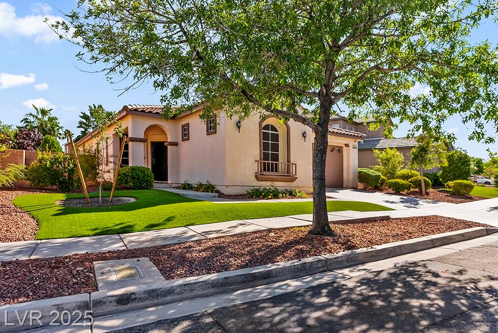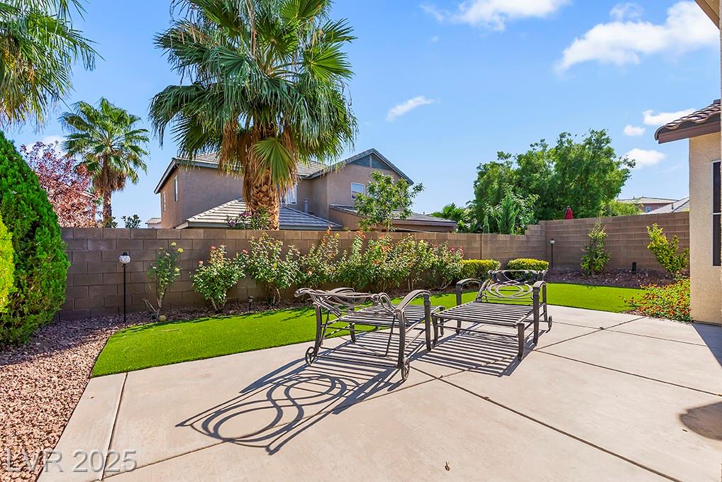 This single-story, three-bedroom, three-bath Summerlin home offers over 2,100 sq. ft of living space just minutes from Downtown Summerlin. Highlights include a circular interior entry, formal living room, bright kitchen with dining area, family room with fireplace, spacious primary suite featuring walk-in closet, ensuite bath with soaking tub and separate shower, dual sinks, lighted vanity, a large backyard featuring a covered patio, mature landscaping, rose garden, and lemon tree—ideal for entertaining or relaxing. In addition to its inviting living spaces and desirable location, this home provides an attached two-car garage, and a laundry room with shelving. Enjoy the comfort of central air and heating throughout the year, as well as energy-efficient windows for added convenience. Whether you're hosting gatherings or seeking a peaceful retreat, this property combines practicality with charm, making it an ideal choice for those looking to enjoy all that Summerlin South has to offer.
