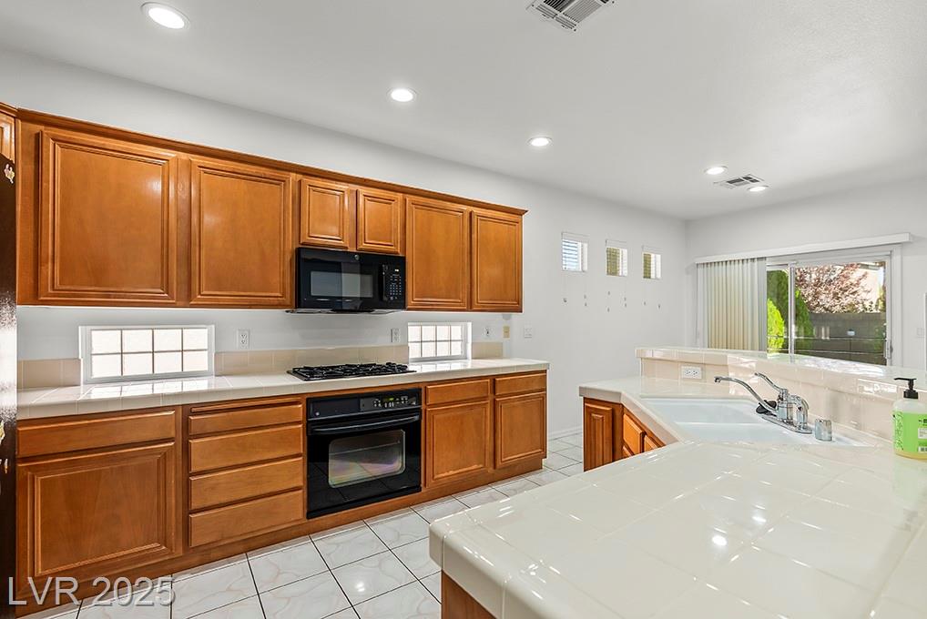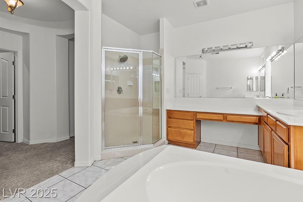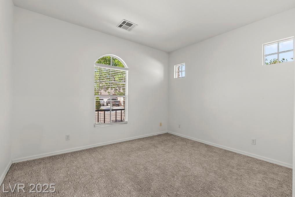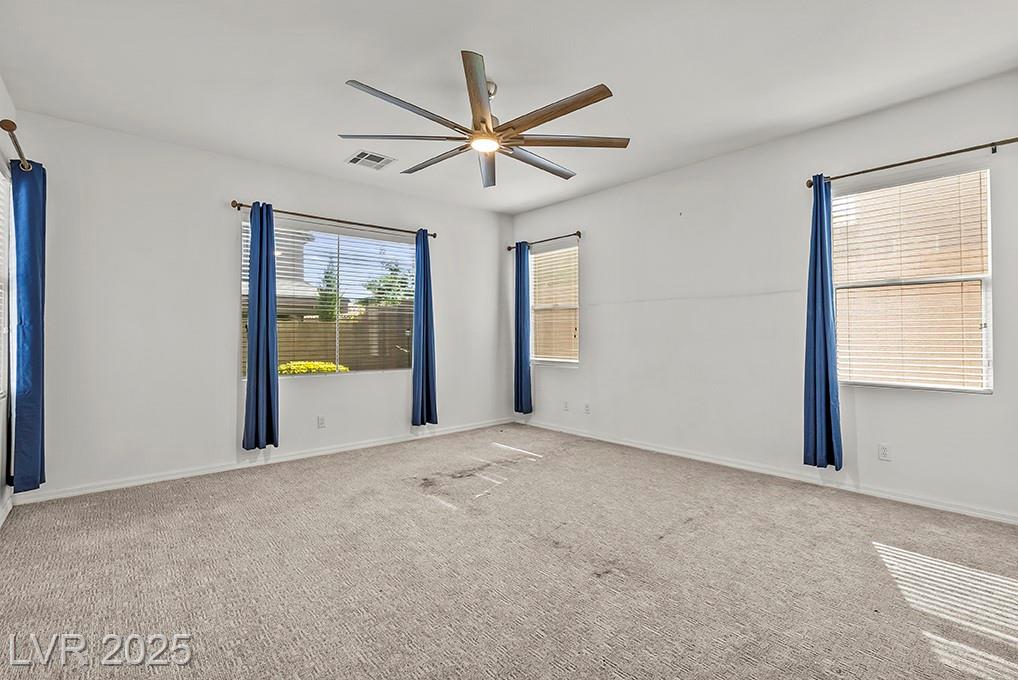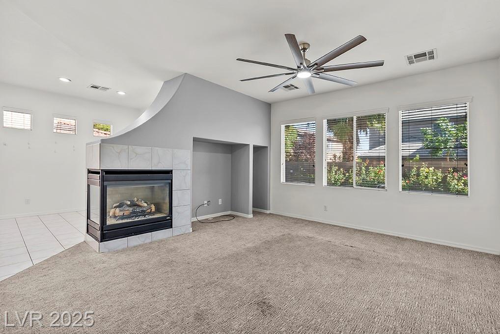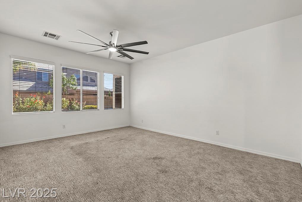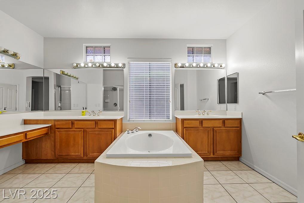 This single-story, three-bedroom, three-bath Summerlin home offers over 2,100 sq. ft of living space just minutes from Downtown Summerlin. Highlights include a circular interior entry, formal living room, bright kitchen with dining area, family room with fireplace, spacious primary suite featuring walk-in closet, ensuite bath with soaking tub and separate shower, dual sinks, lighted vanity, a large backyard featuring a covered patio, mature landscaping, rose garden, and lemon tree—ideal for entertaining or relaxing. In addition to its inviting living spaces and desirable location, this home provides an attached two-car garage, and a laundry room with shelving. Enjoy the comfort of central air and heating throughout the year, as well as energy-efficient windows for added convenience. Whether you're hosting gatherings or seeking a peaceful retreat, this property combines practicality with charm, making it an ideal choice for those looking to enjoy all that Summerlin South has to offer.