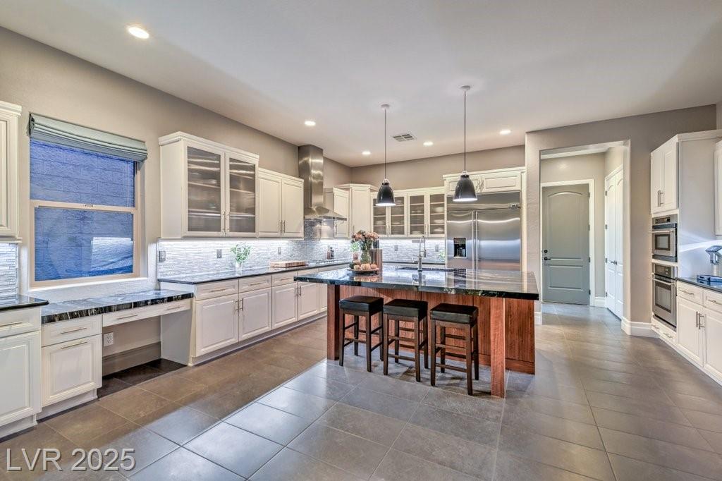No expense was spared in this remodeled over-the-top, captivating home. Gourmet kitchen with stainless steel appliances, 2 built-in ovens, 5-burner cooktop, built-in refrigerator, trash compactor, high function granite counters, and island with breakfast bar. The extended formal living and dining room are a highlight of the home featuring 4 paneled center split Pella slider creating a seamless indoor-outdoor living. The primary retreat has French doors, luxury vinyl plank flooring, walk-in closet, spa-like bathroom with walk-in shower. Large secondary bedrooms have a jack and jill bath. A versatile office with glass door entry. Luxurious amenities include new plumbing fixtures, RH lighting, large format tile flooring, frameless glass showers, new cabinetry, quartz bathroom countertops, double glass door entry and more. Multiple outdoor entertaining areas include a gated front courtyard and an extraordinary backyard featuring lush greenery, heated spool, covered patio, and fruit trees.
