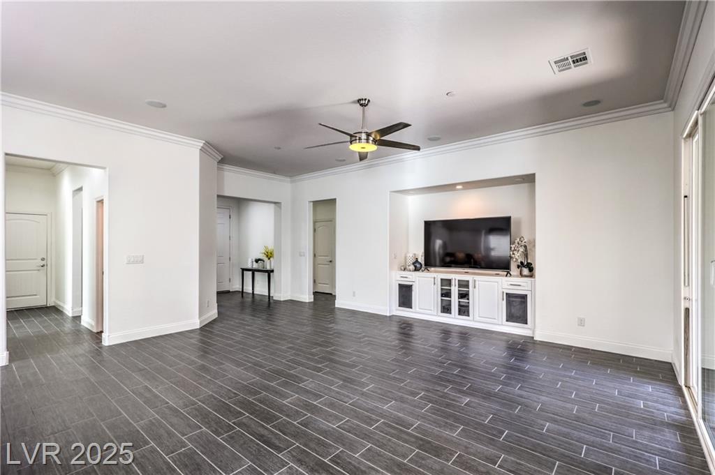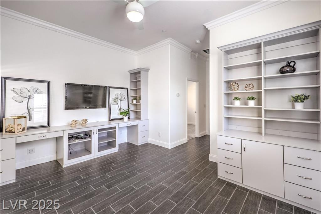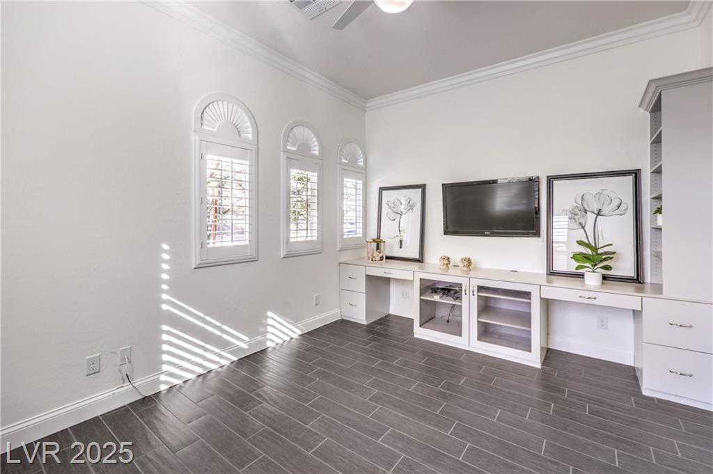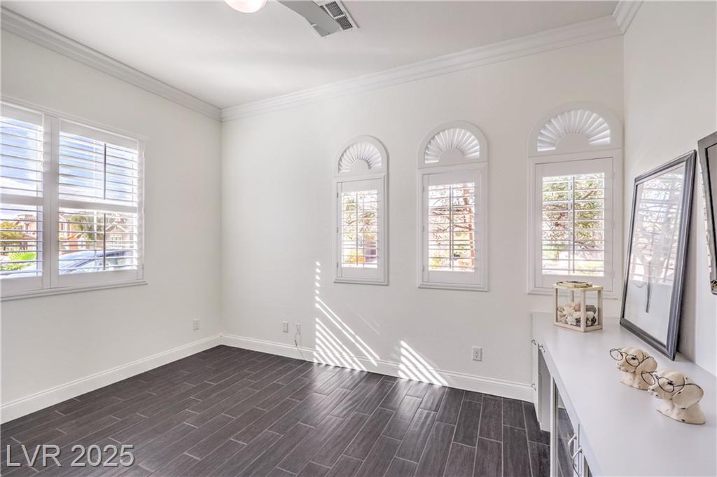 This home has it all! Just refreshed with a light, modern paint palette throughout—and the price has just been reduced! Offering Incentives! This immaculate 2,549 sq ft single-story home features 3 bedrooms, 4 baths, and 2 versatile dens—perfect for a home office, guest suite, or gym. One bedroom with ensuite bath and adjacent den creates an ideal Next Gen-style setup. Enjoy 10' ceilings, crown molding, plantation shutters, and wood-look tile throughout the main living areas. The gourmet kitchen boasts a large island, granite and quartz counters, stainless appliances, white cabinetry, and a walk-in pantry. The primary suite is separate for privacy and offers a spa-like bath. Gated front courtyard, pavered drive, tankless water heater, RO system, and ample storage. Backyard with mature landscaping, paver patio, extended covered patio, and roll-out awning—perfect for relaxing or entertaining. Stylish, spacious, and move-in ready!