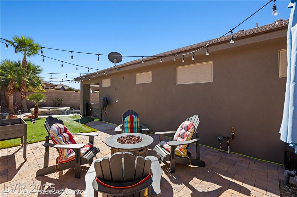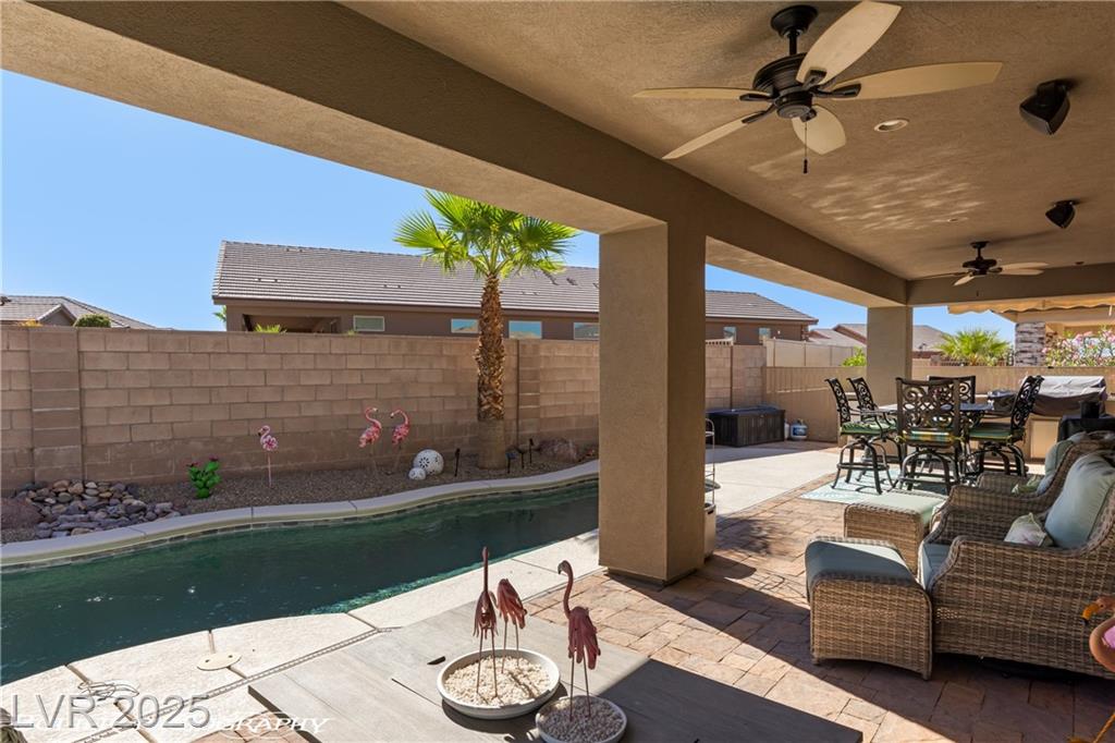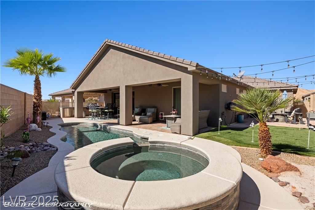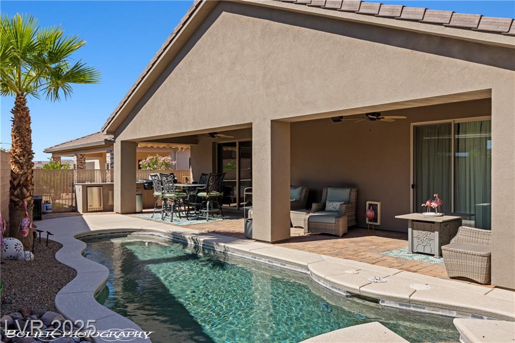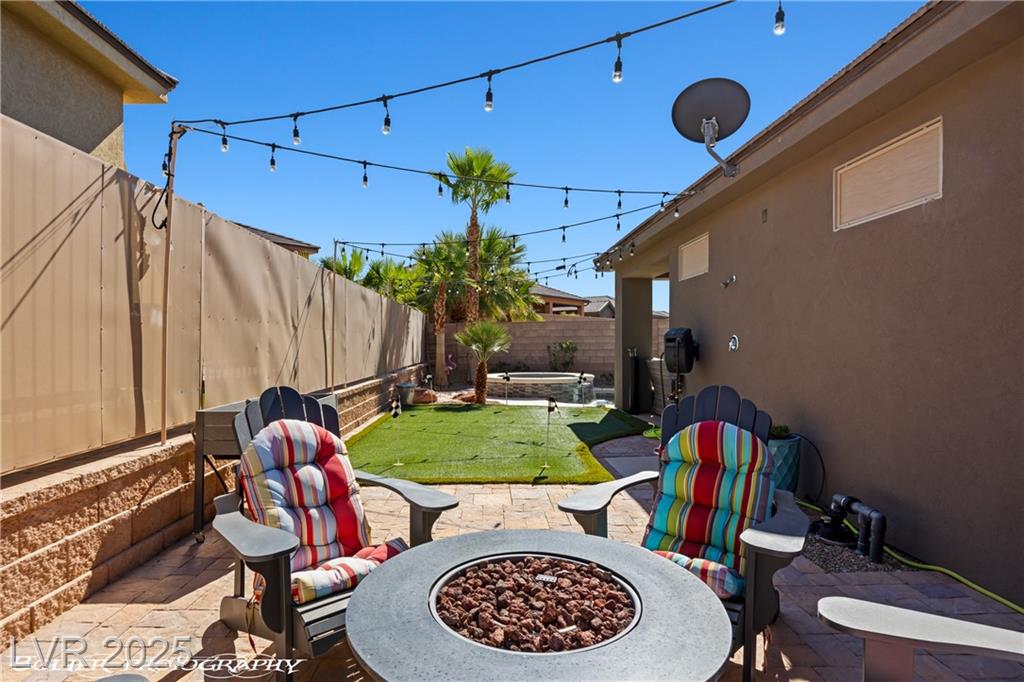 Welcome to Royal Vistas, one of Mesquite’s premier gated communities. Built in 2018 by the original owner, this immaculate 3-bedroom plus den, 2.5-bath home blends modern design with resort-style living. The open floor plan features high ceilings, natural light, and a gourmet kitchen with granite counters, stainless appliances, upgraded cabinetry, large island, and walk-in pantry. The primary suite offers dual vanities, walk-in shower, and spacious closet. Step outside to your private oasis with a sparkling pool, outdoor kitchen, fire pit, and putting green—perfect for entertaining or relaxing under desert skies. Outdoor furnishings are included and indoor furnishings may be available. Complete with a two-car garage, this home shows true pride of ownership. Experience the best of Mesquite living in the gated comfort of Royal Vistas.