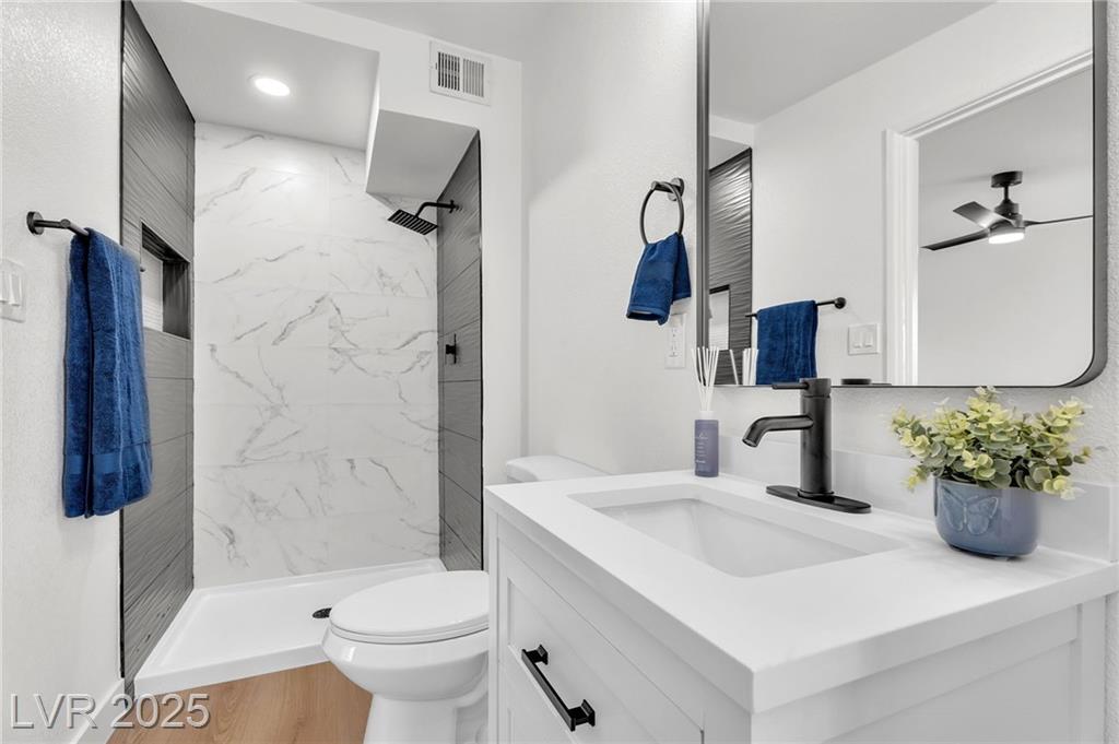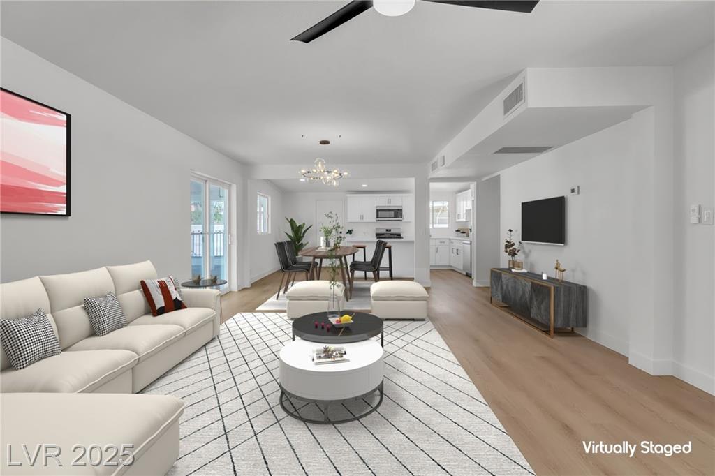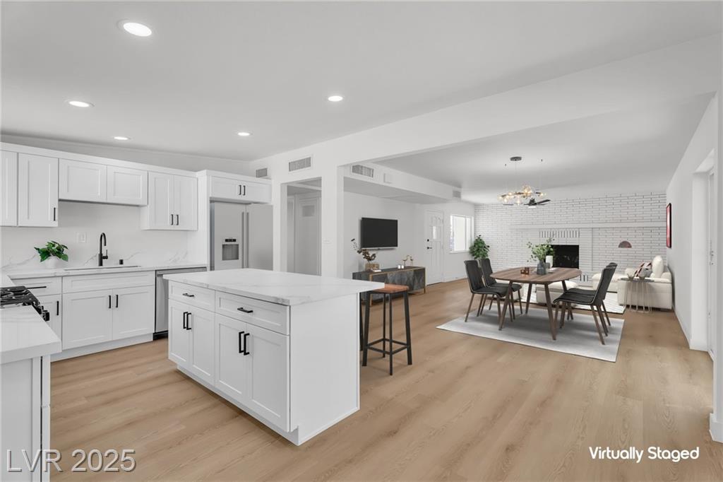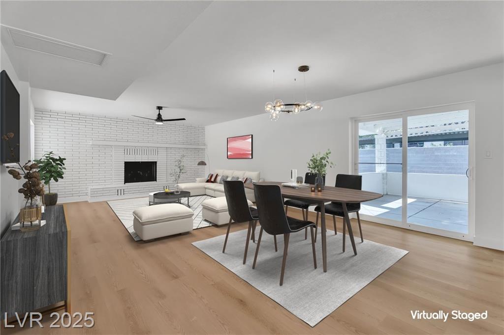 Seller is willing to contribute towards buyers' rate-buy down / closing costs!! Rare single-story property, meticulously updated and maintained! This inviting home showcases light wood-style flooring throughout, a cozy living room with fireplace and ceiling fan, and a formal dining area ideal for entertaining. The fully renovated kitchen features white cabinetry, stainless steel appliances, and an oversized island perfect for meal prep or casual dining. Bedrooms offer comfort with ceiling fans and natural light, while bathrooms boast elegant tile and marble finishes. Step outside to a private, low-maintenance backyard with a covered patio. Don't miss out!