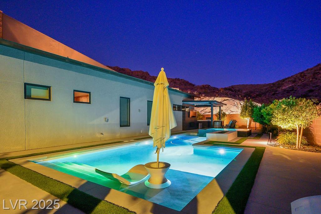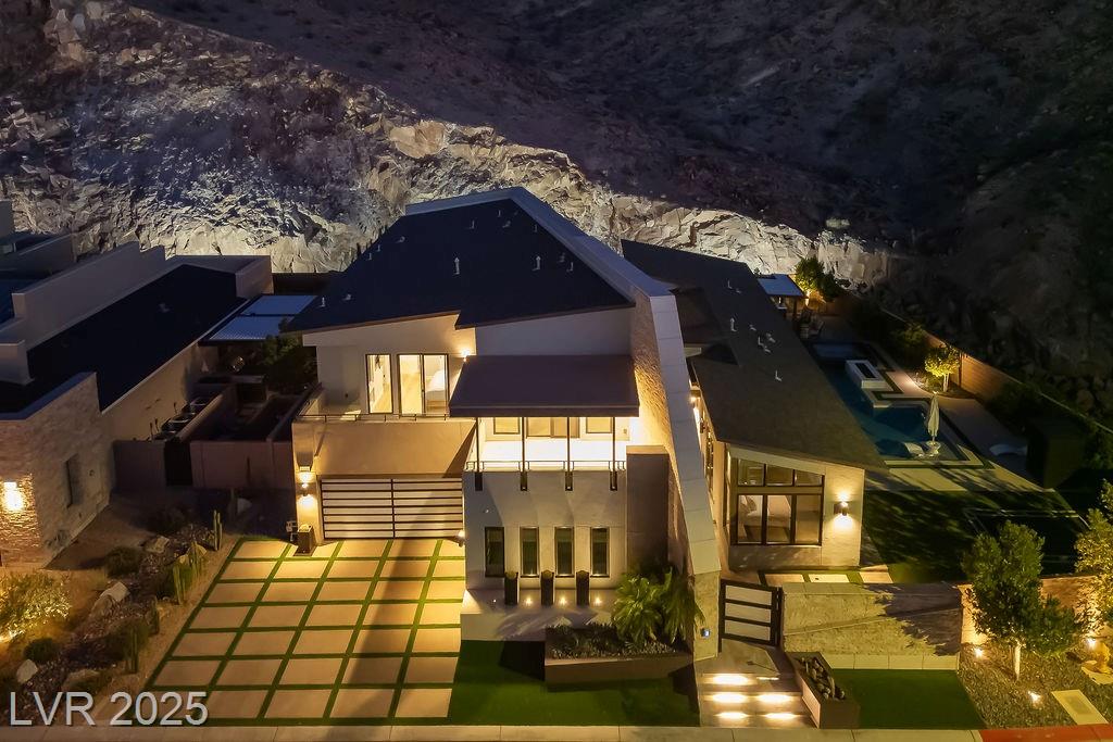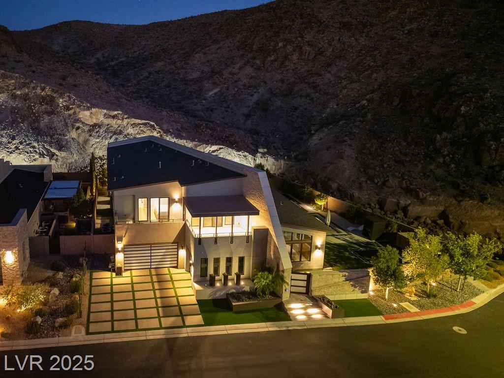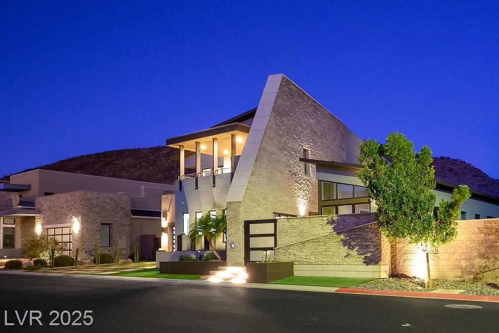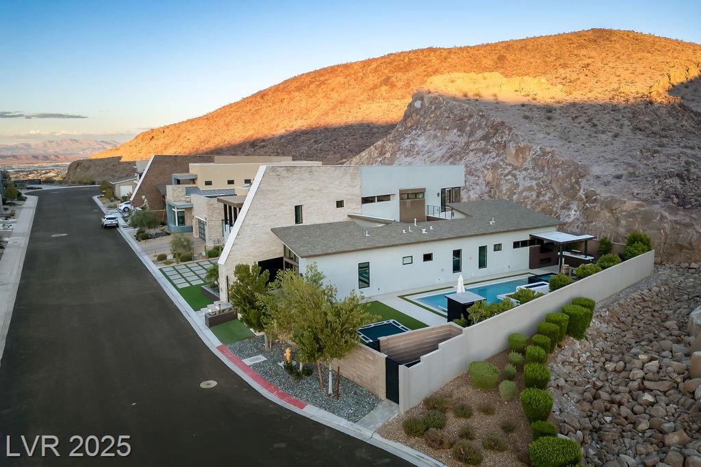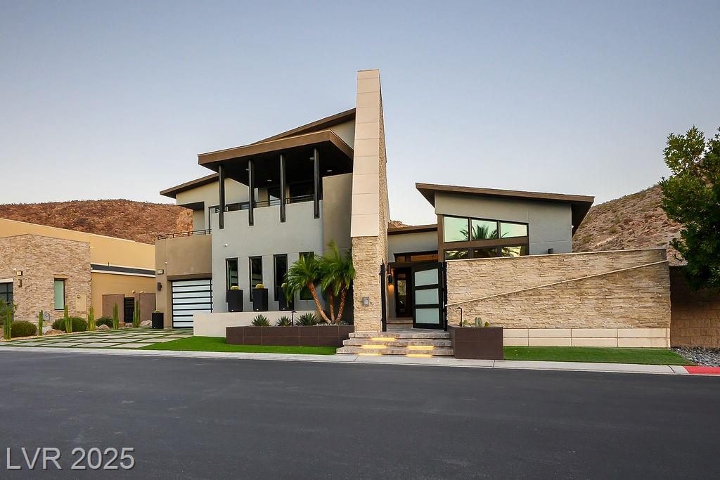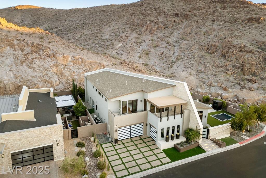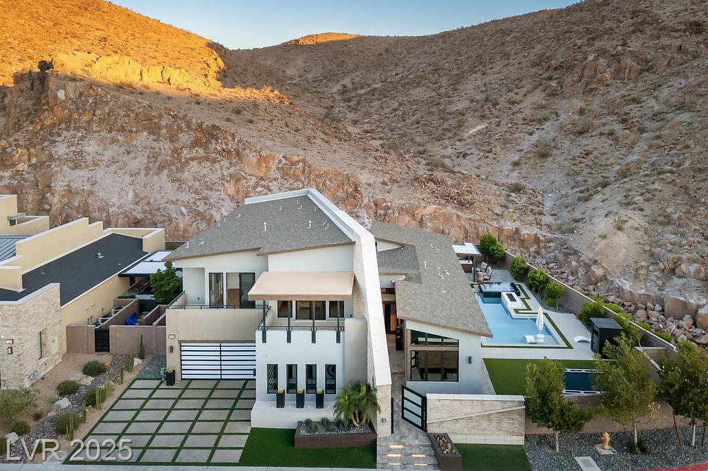 This striking 5-bedroom, 6-bath contemporary estate is located in the gated Axis at MacDonald Ranch, offering ultimate privacy and breathtaking mountain views. Expansive walls of glass fill the home with natural light and highlight an open-concept floor plan. The gourmet kitchen features top-brand appliances, a large center island, custom cabinetry, and a walk-in pantry. The primary suite offers a spa-inspired bath with freestanding tub, oversized shower, and walk-in closet. Each additional bedroom has an en suite bath. Outdoors, enjoy a pool, elevated spa, outdoor kitchen, covered patio. Additional highlights include a dedicated office, 3-car garage, and motorized window treatments. Every detail reflects modern design, luxury, and thoughtful living.