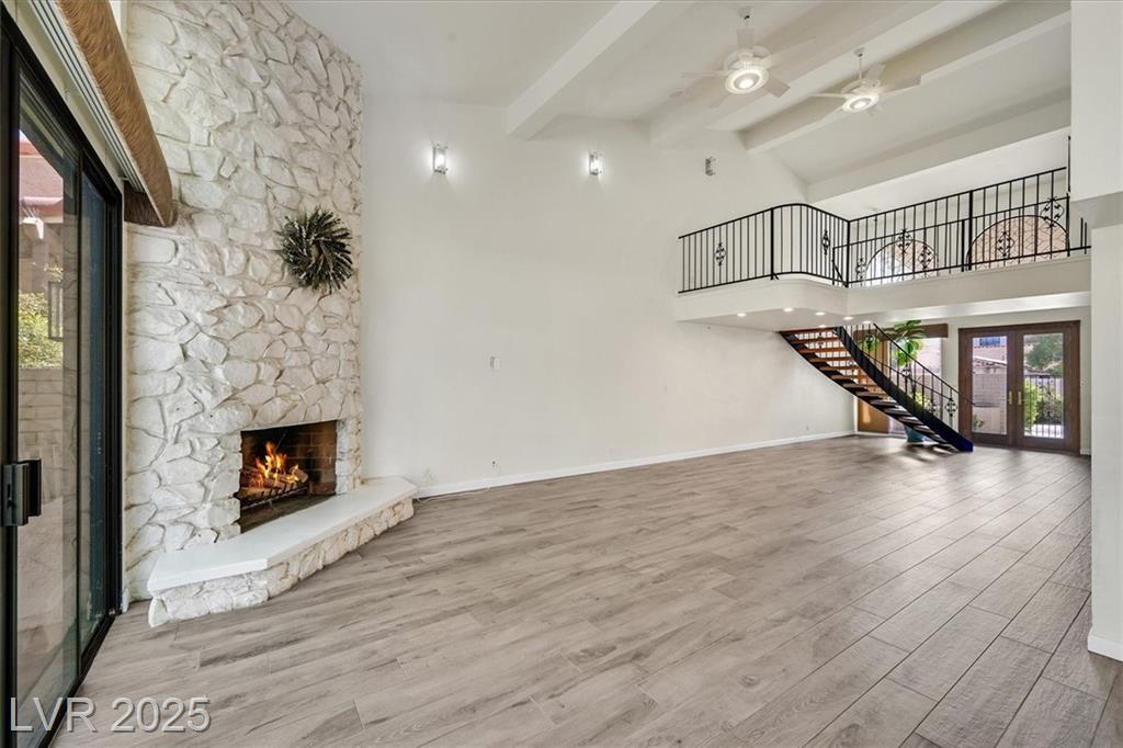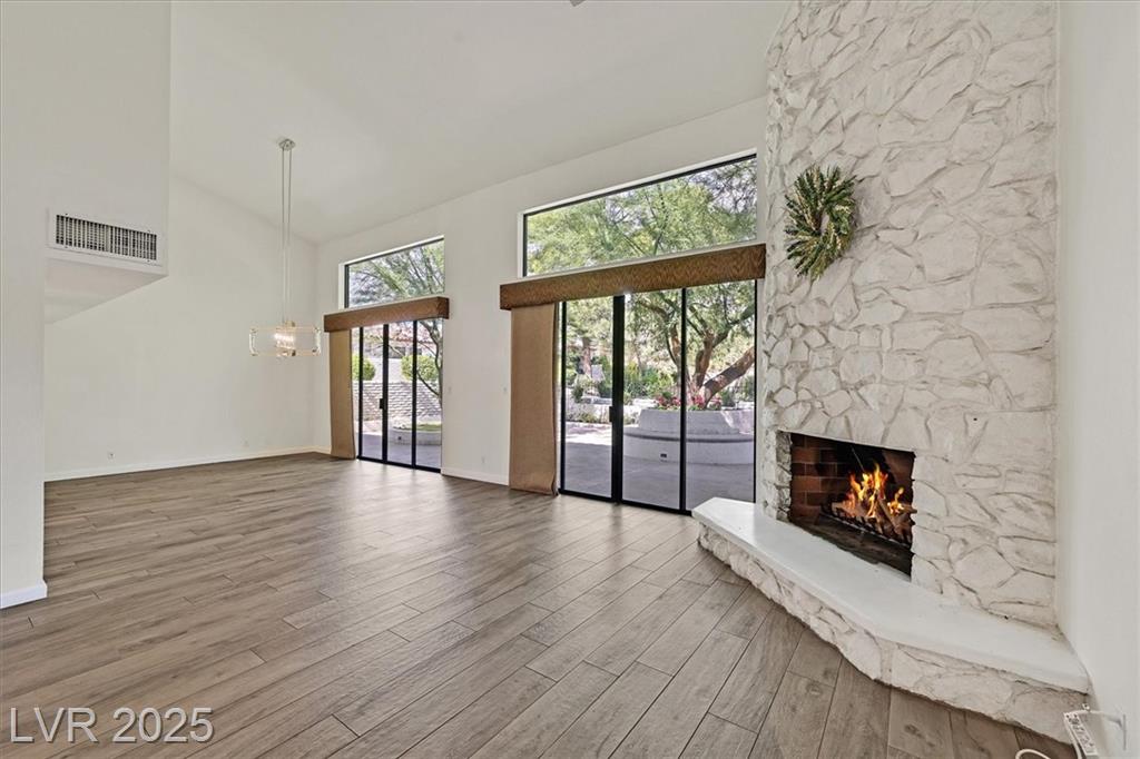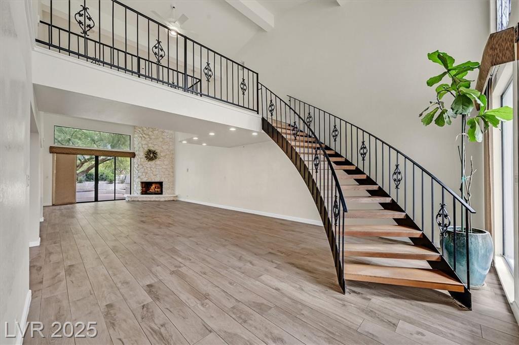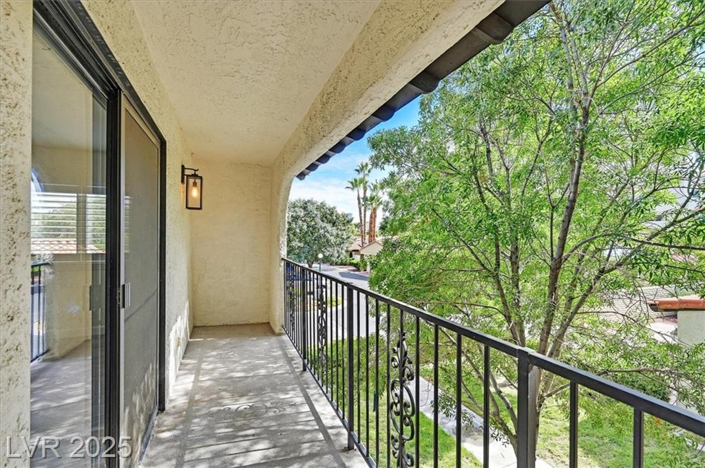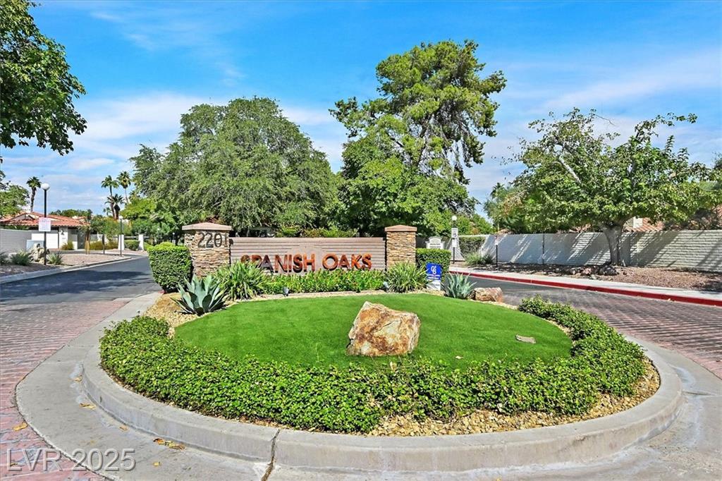 Stunning & remodeled estate, located in guard gated Spanish Oaks. Prime cul-de-sac location, interior corner lot, open floorplan, vaulted ceilings, sweeping staircase & gorgeous custom windows, double door entry, impressive stone fireplace in expansive grand living room. Owned solar panels, installed 2019! Chef's kitchen features 2 ovens, garden window overlooking yard in a park-like setting, quartz & Taj Mahal quartzite countertops, stainless steel appliances, opens to lovely breakfast nook & island seating. Primary suite features gorgeous fireplace, private balcony, stunning primary bathroom complete with marble floors & countertops, limestone shower floor, separate tub, spacious custom closet. 2 large guest rooms are located upstairs including Strip views and second private balcony. Downstairs guest room features full bath & limestone mosaic tiles. Rear yard is an oasis - citrus trees & mature landscaping, gate to community pool. Charming downstairs laundry w dutch door & dog run.