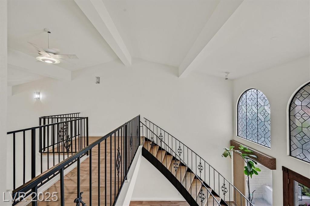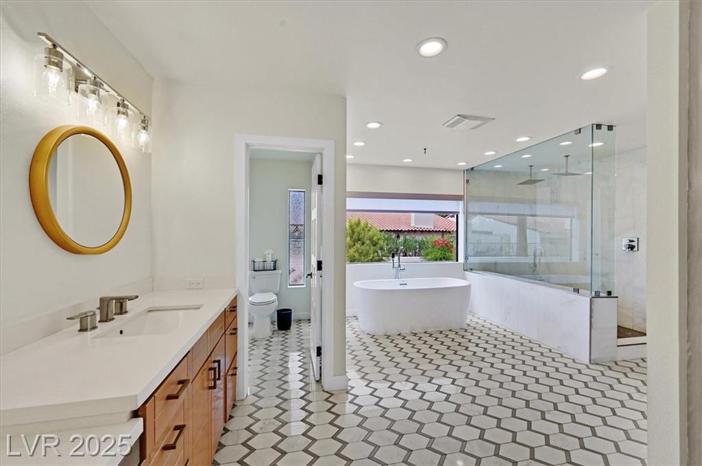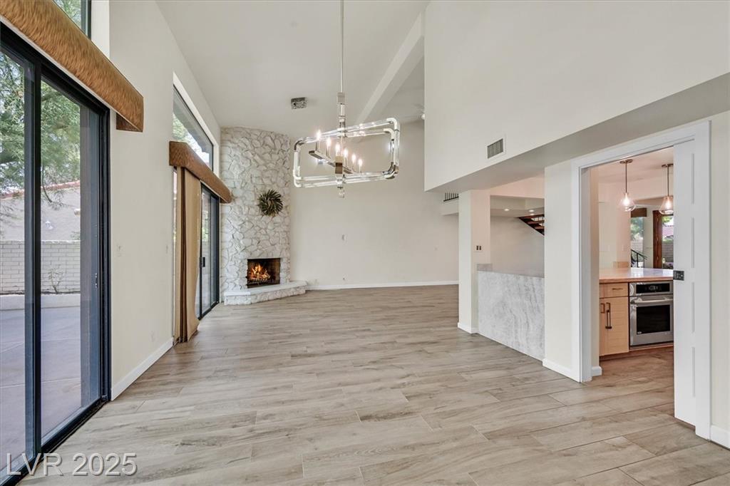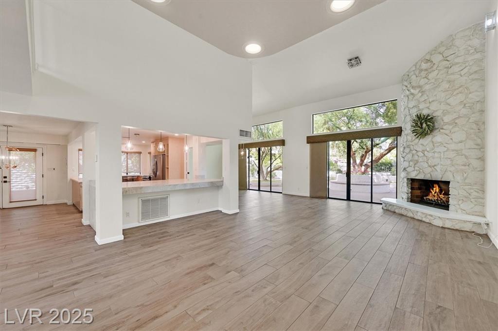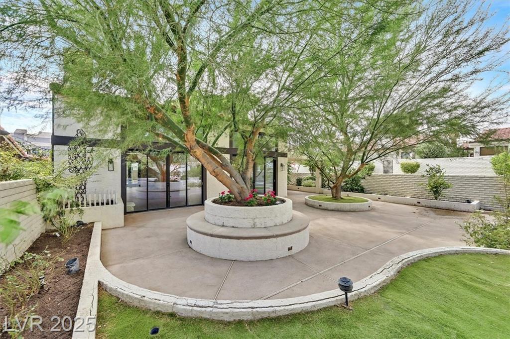 Stunning & remodeled estate, located in guard gated Spanish Oaks. Prime cul-de-sac location, interior corner lot, open floorplan, vaulted ceilings, sweeping staircase & gorgeous custom windows, double door entry, impressive stone fireplace in expansive grand living room. Owned solar panels, installed 2019! Chef's kitchen features 2 ovens, garden window overlooking yard in a park-like setting, quartz & Taj Mahal quartzite countertops, stainless steel appliances, opens to lovely breakfast nook & island seating. Primary suite features gorgeous fireplace, private balcony, stunning primary bathroom complete with marble floors & countertops, limestone shower floor, separate tub, spacious custom closet. 2 large guest rooms are located upstairs including Strip views and second private balcony. Downstairs guest room features full bath & limestone mosaic tiles. Rear yard is an oasis - citrus trees & mature landscaping, gate to community pool. Charming downstairs laundry w dutch door & dog run.