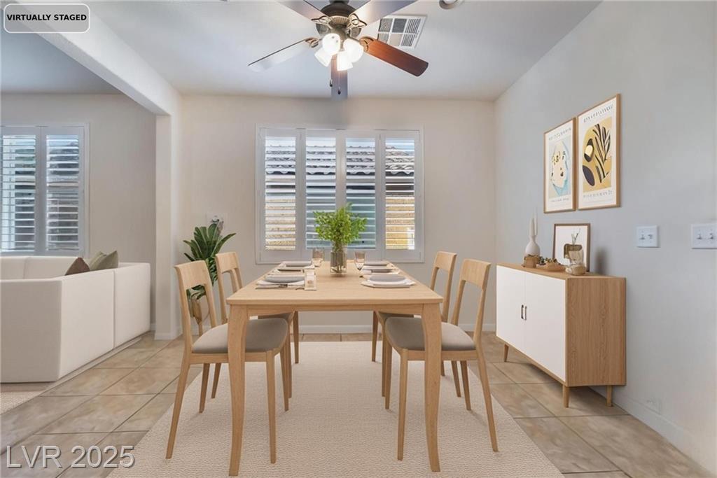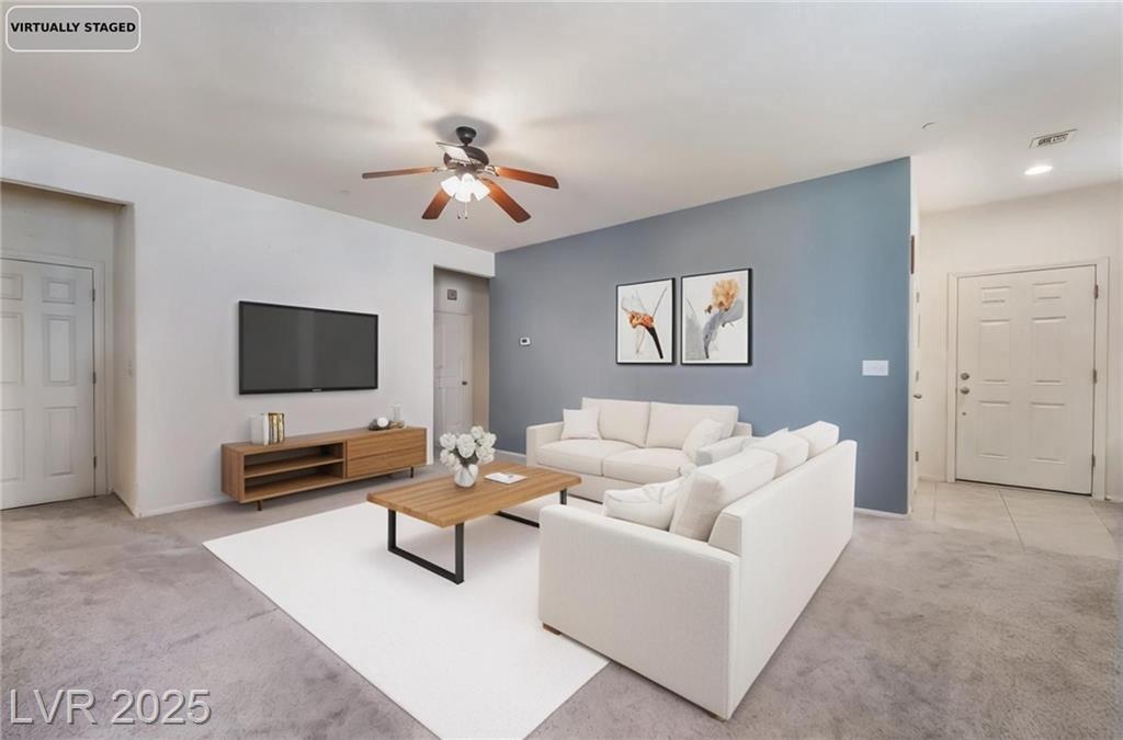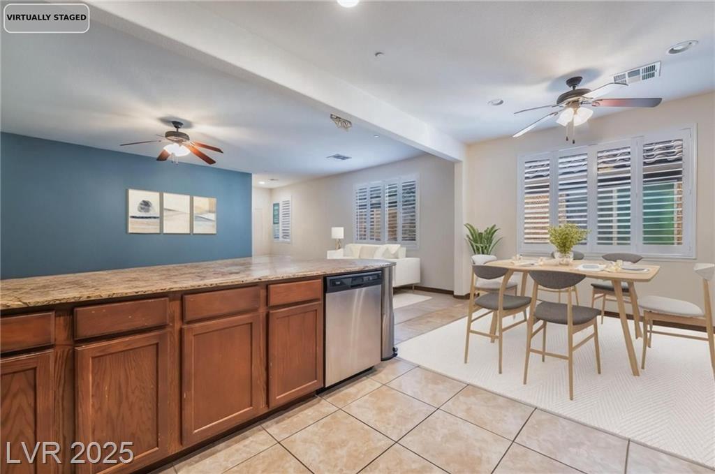 Welcome to this charming single-story home nestled within an established Henderson community on a private interior lot. Step inside to an inviting open-concept layout filled with natural light, featuring comfortable family and dining areas that flow seamlessly into a spacious kitchen with abundant cabinetry, a breakfast bar, pantry, and direct access to the backyard. The home offers a blend of tile and carpet flooring, ceiling fans with lights, and a practical floor plan perfect for everyday living. Enjoy relaxing or entertaining outdoors in the spacious backyard with a covered patio and low-maintenance desert landscaping.