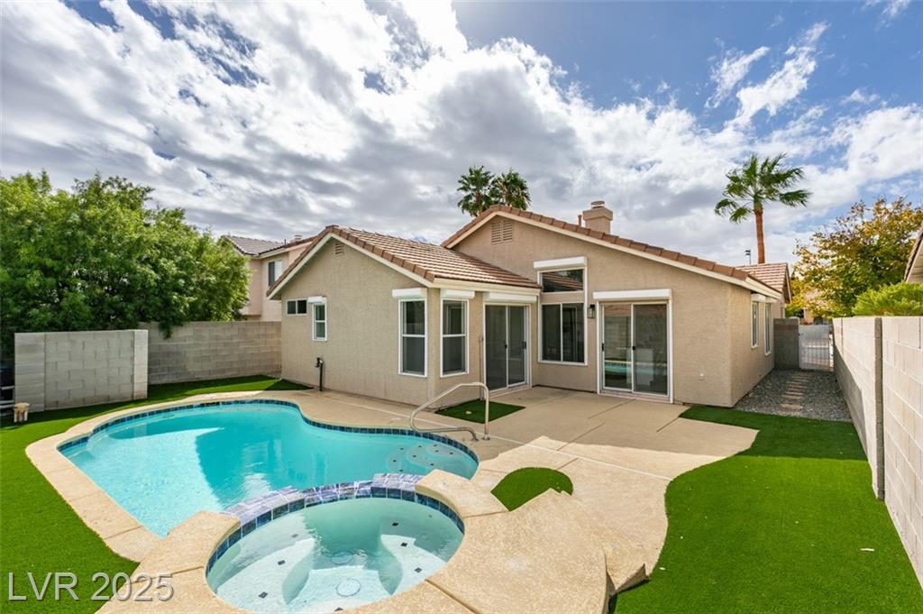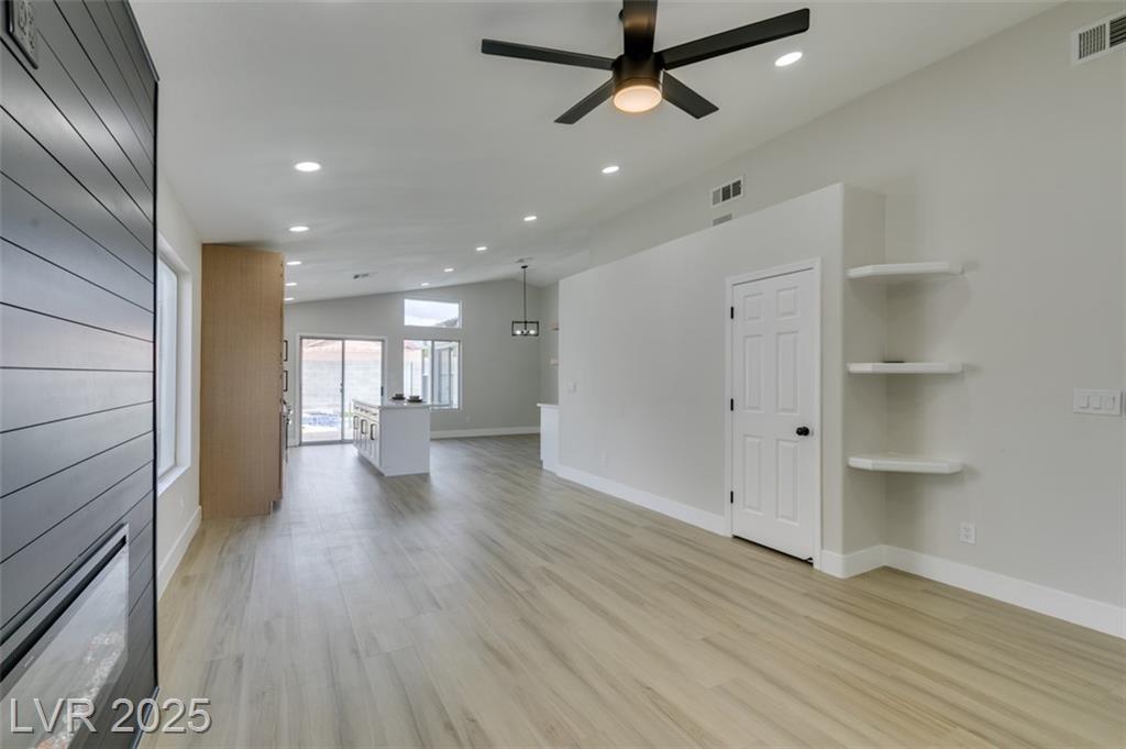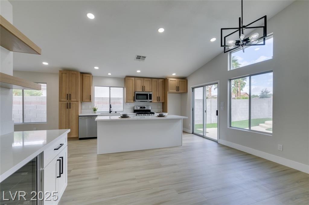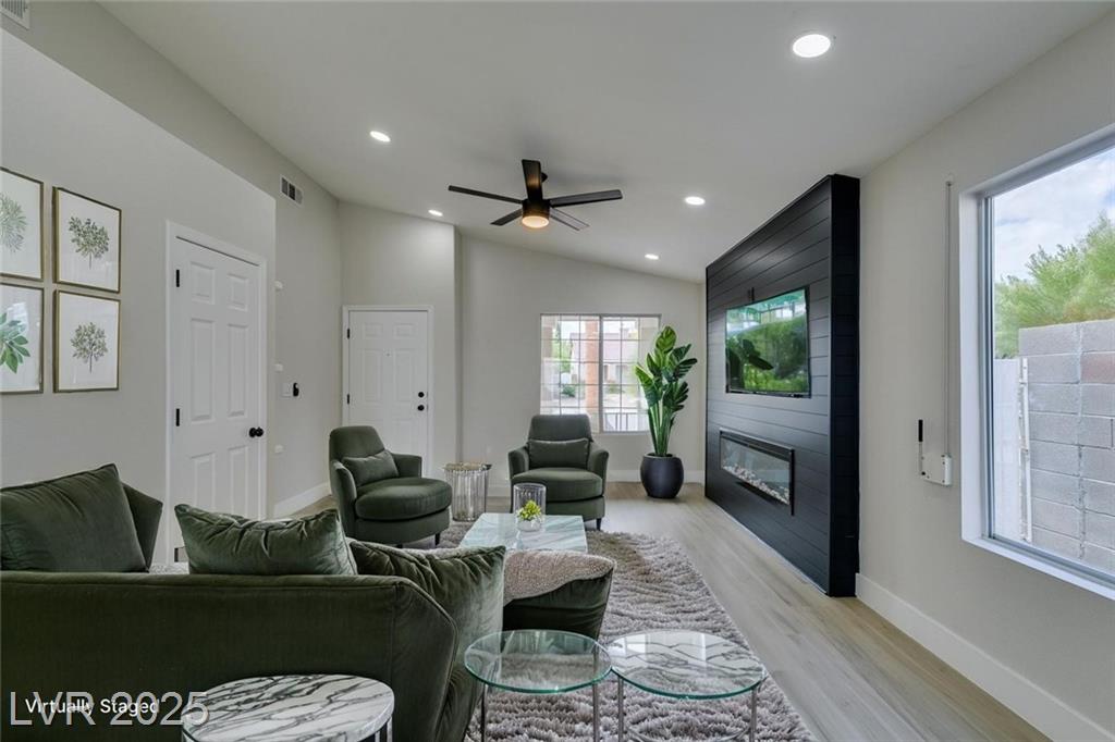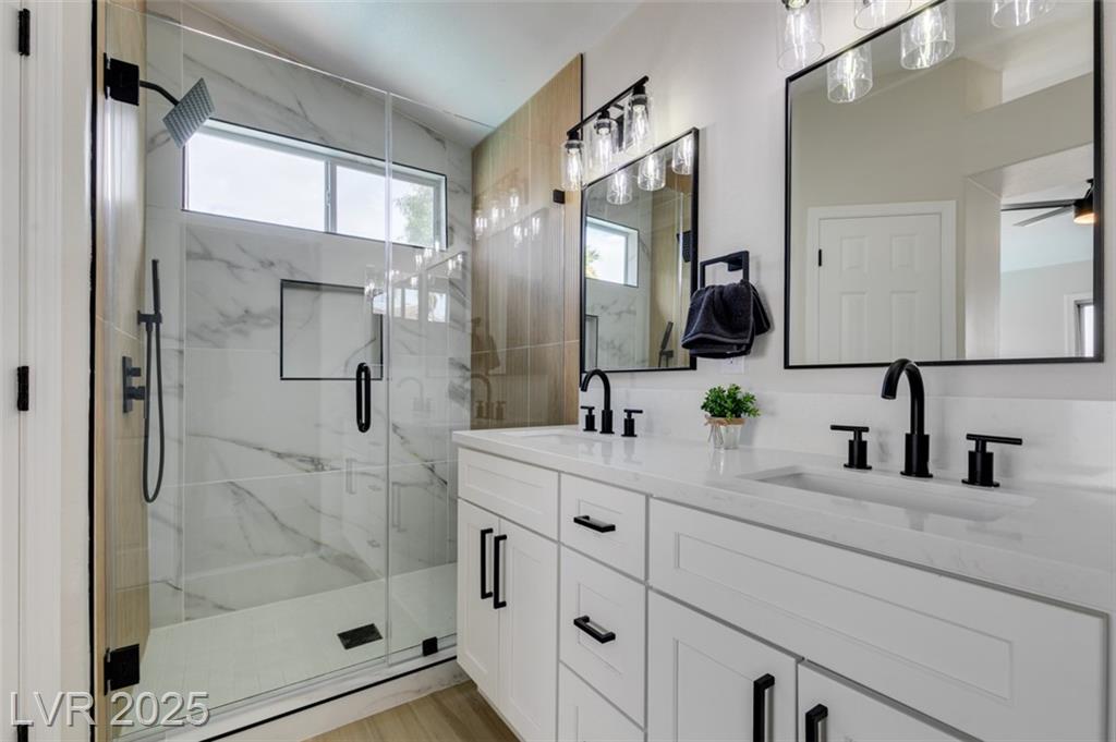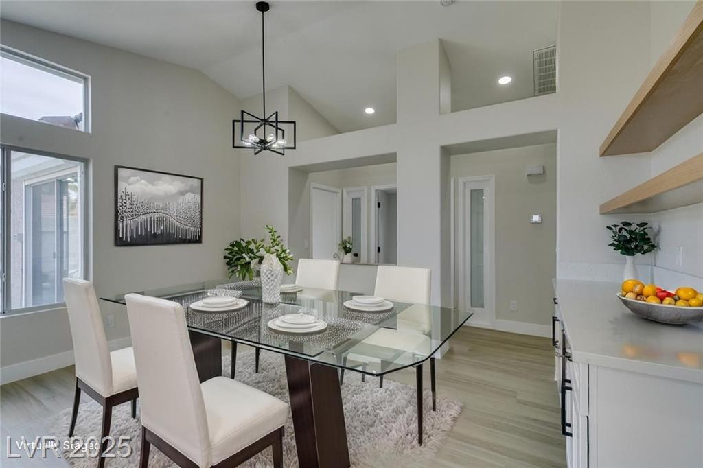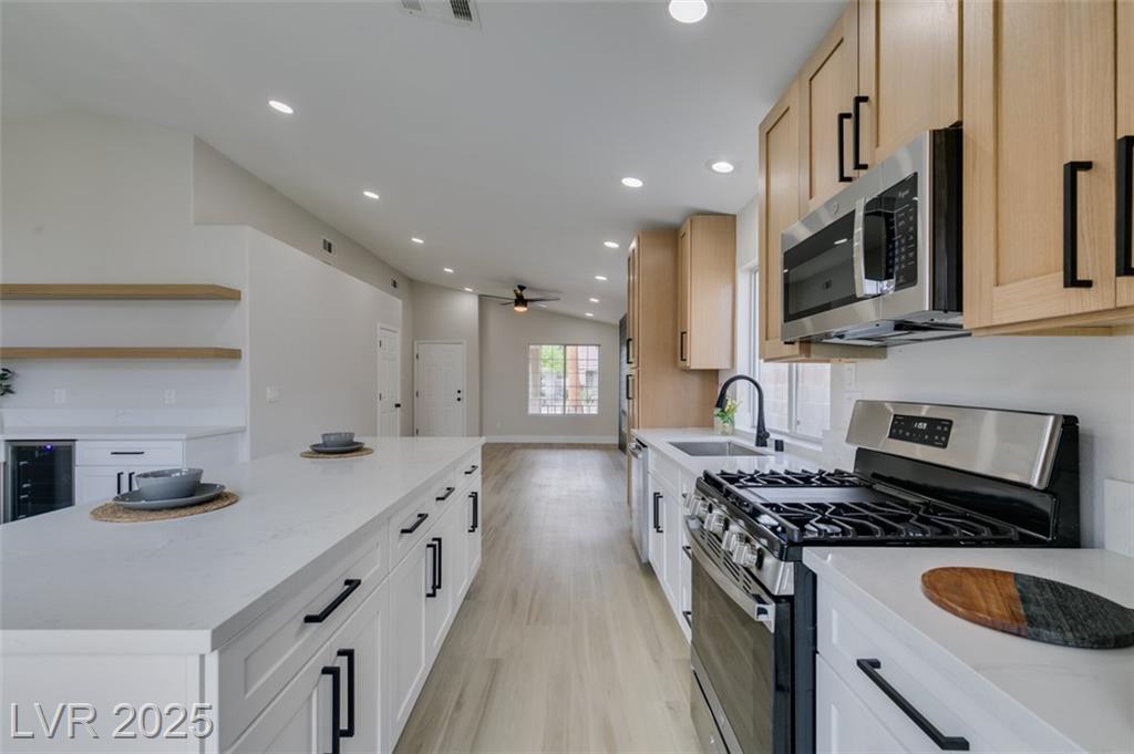 Stunning single story Summerlin home with pool & spa! This open concept remodel features vaulted ceilings, white oak & white shaker cabinets, quartz countertops, and stainless steel appliances. Entertain in style with a bar area and floating shelves. Relax by the custom floor-to-ceiling fireplace that anchors the living space. Rolladen shutters throughout add privacy, security, and energy efficiency. Bathrooms showcase porcelain Calacatta slab showers contrasted by warm oak tile and frameless glass enclosures. Finished with luxury vinyl plank flooring, 5" baseboards, and all new lighting, fans, and fixtures—this turnkey Summerlin retreat is ready to impress!