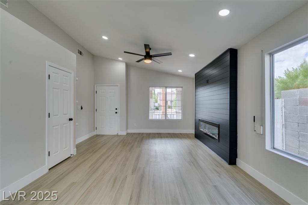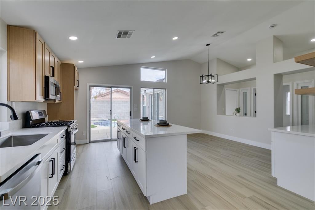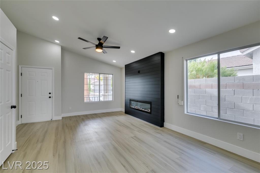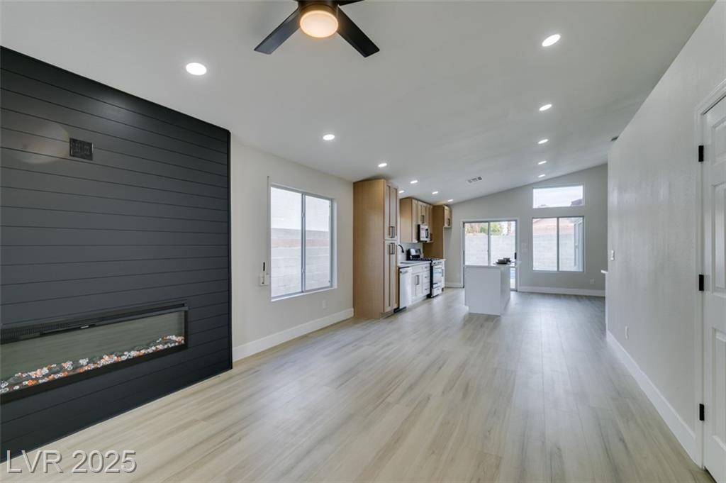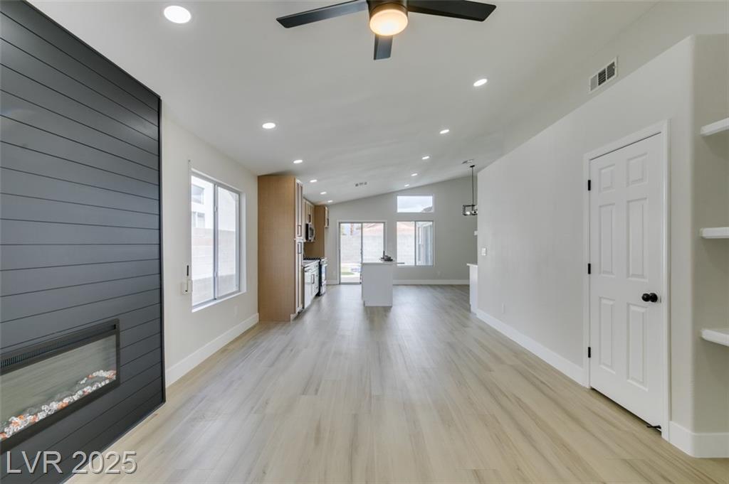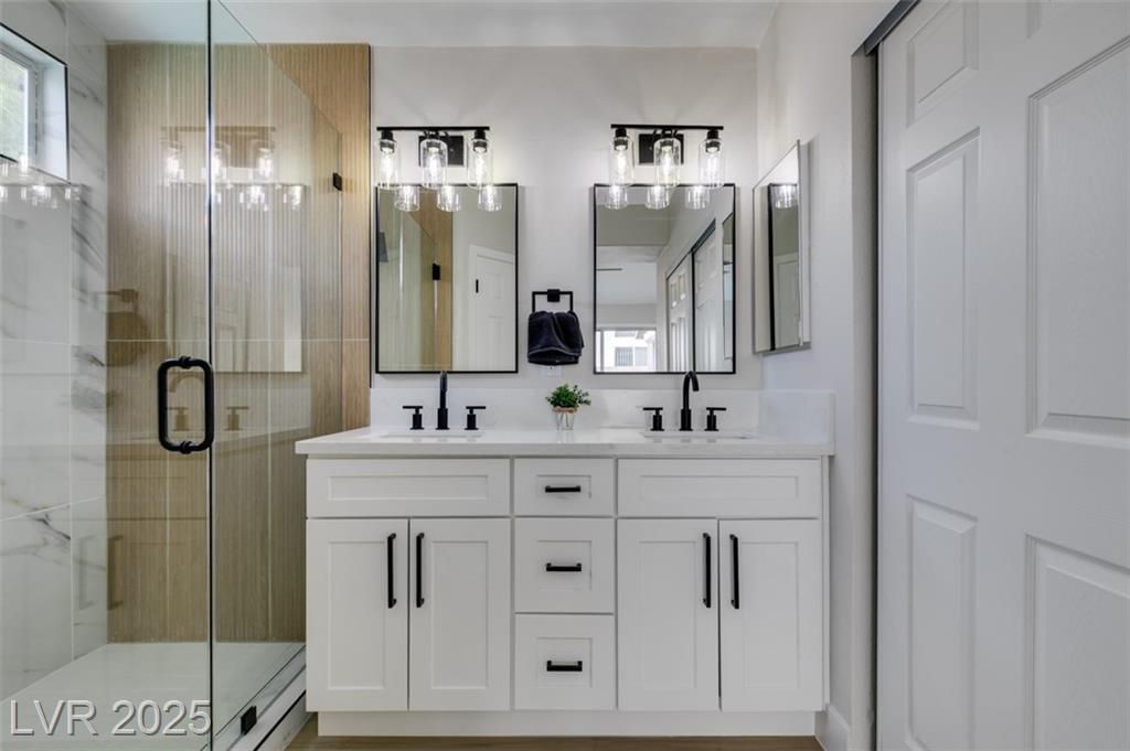 Stunning single story Summerlin home with pool & spa! This open concept remodel features vaulted ceilings, white oak & white shaker cabinets, quartz countertops, and stainless steel appliances. Entertain in style with a bar area and floating shelves. Relax by the custom floor-to-ceiling fireplace that anchors the living space. Rolladen shutters throughout add privacy, security, and energy efficiency. Bathrooms showcase porcelain Calacatta slab showers contrasted by warm oak tile and frameless glass enclosures. Finished with luxury vinyl plank flooring, 5" baseboards, and all new lighting, fans, and fixtures—this turnkey Summerlin retreat is ready to impress!
