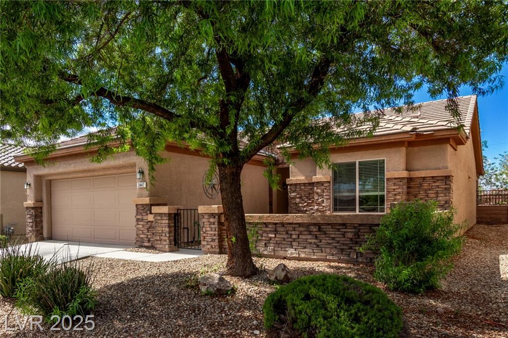 Experience refined living in the 55+ gated community of Solera at Stallion Mountain. Perfectly positioned on the golf course, this beautiful home offers sweeping fairway views and a serene setting ideal for an active, low-maintenance lifestyle. The inviting open floor plan is filled with natural light and showcases designer paint, tile flooring, and warm wood accents in the bedrooms. The gourmet kitchen boasts stainless steel appliances, granite countertops, mosaic tile backsplash, recessed lighting, staggered cabinetry, and a two-tier island with breakfast bar. A versatile den provides space for an office or hobby room, while the primary suite offers a spa-inspired bath with dual vanities and a generous walk-in closet. Relax outdoors on the covered patio surrounded by artificial turf and a view fence overlooking the course. Enjoy world-class amenities including a 10,000 sq ft clubhouse, fitness center, pool/spa, sports courts, and scenic walking trails.
