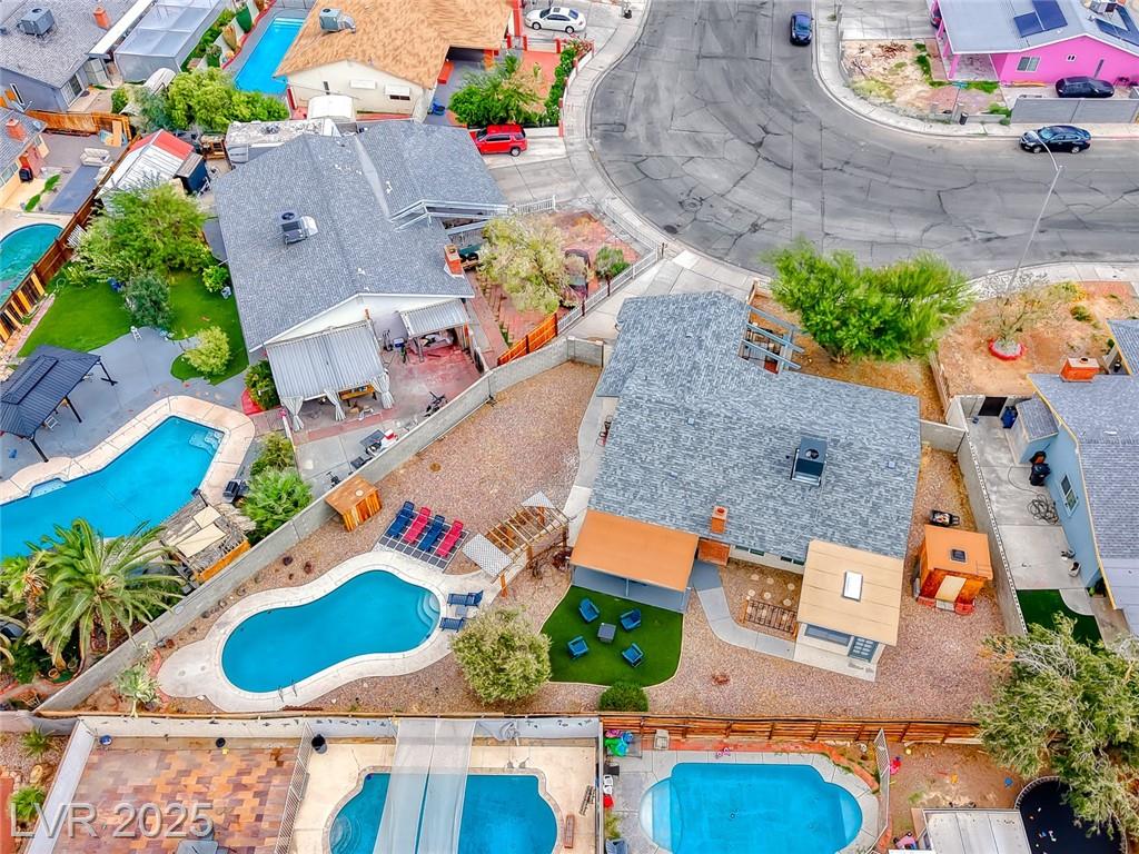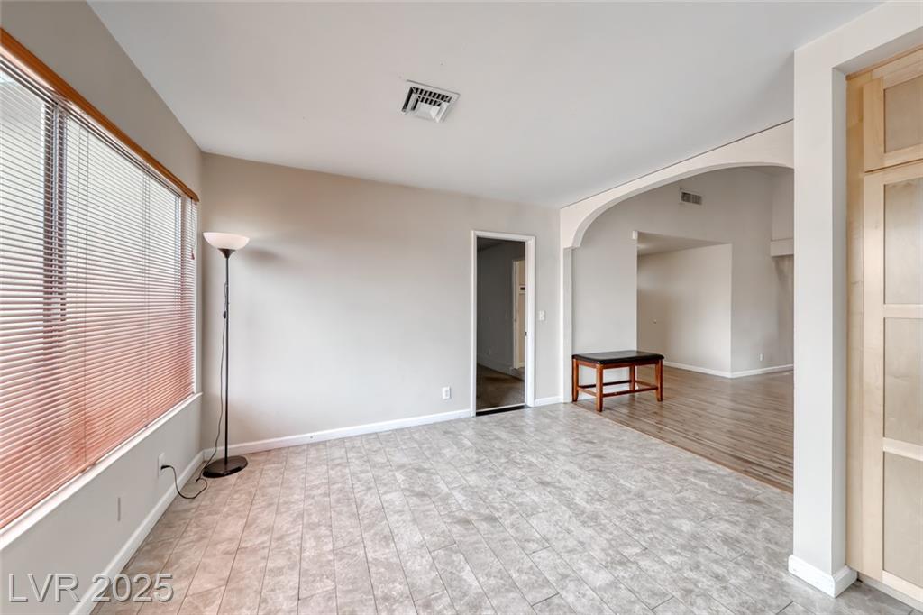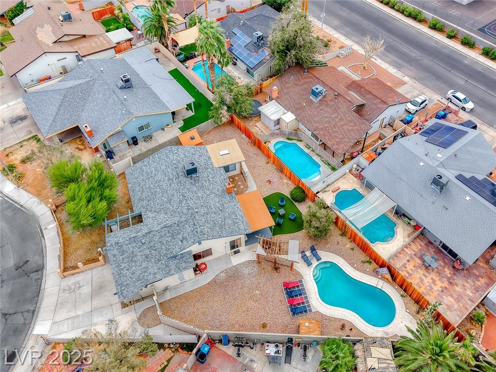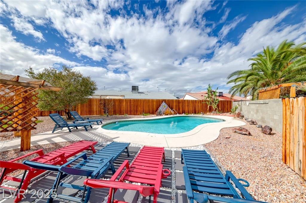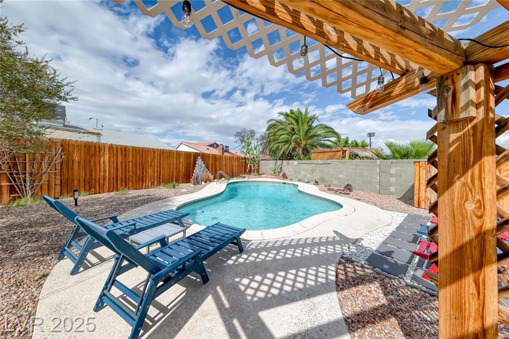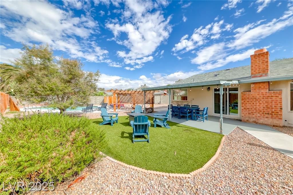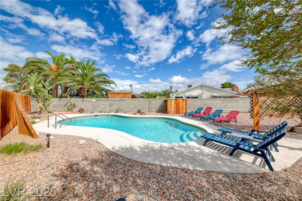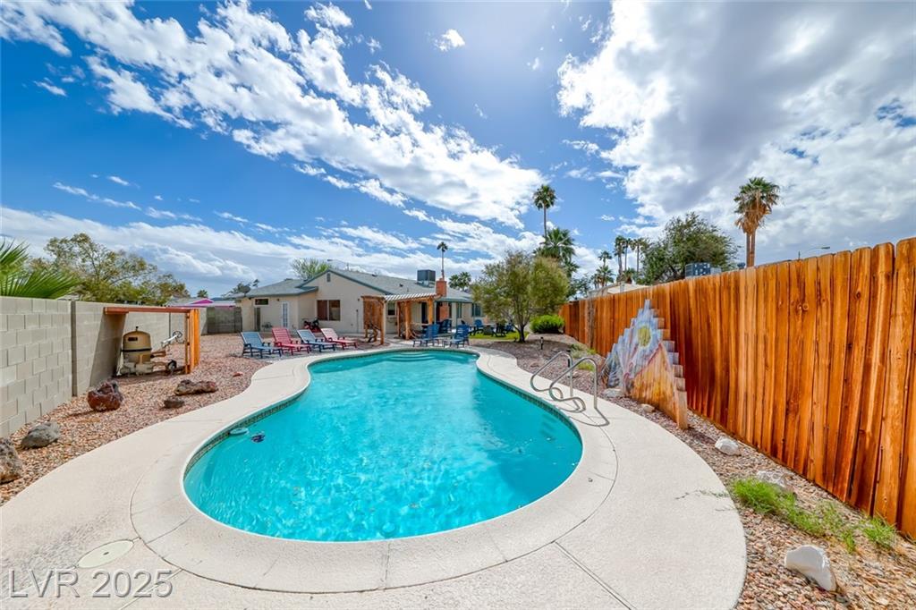 An amazing opportunity to live in the heart of Las Vegas and within minutes to UNLV, Las Vegas Strip, Harry Reid Airport, Allegiant Stadium, and everyday shopping needs. This beautiful single story property features all the comforts of home! Vaulted ceiling entry with plenty of room to entertain, enclosed garage with built-in center allowing for more livable space, spacious kitchen with plenty of cabinet storage, a generously sized primary suite and secondary sitting room, the primary bathroom has a walk in shower and double vanity, 2 additional bedrooms with ceiling fans, and a guest full bath. The backyard boasts an inground pool with new pool pump, a covered patio, artificial grass area, and is west facing to experience fantastic sunsets. The house has had quality renovations done in the last 3 years with a new AC, new roof, and water heater.