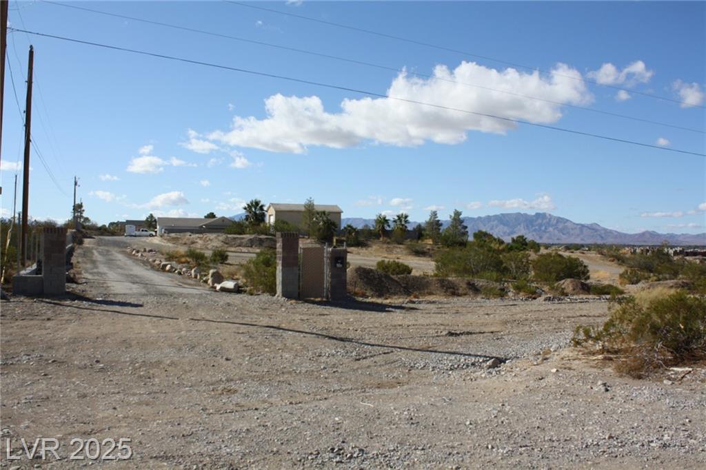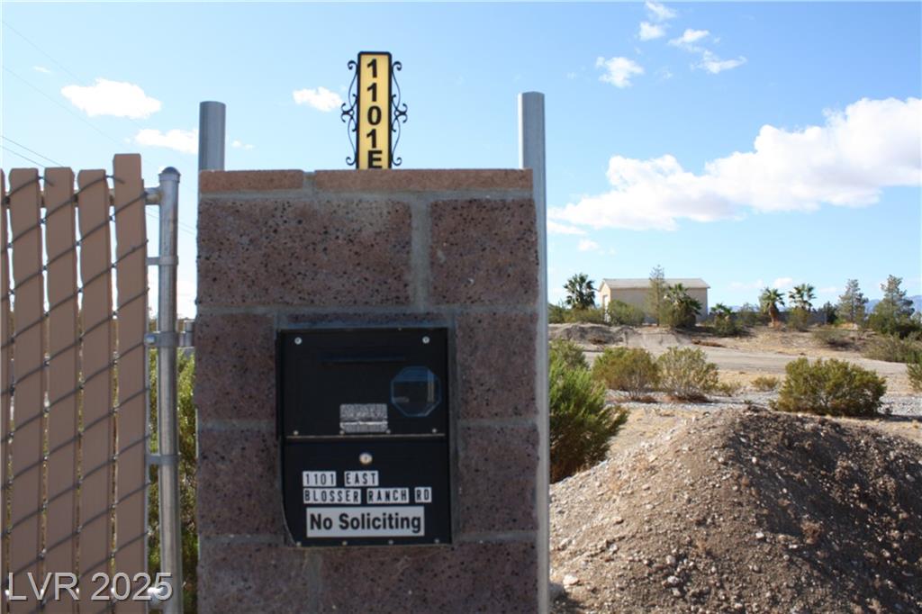 Take 160 thru the Pahrump town and continue North of Basin Road @ Home Depot approx. another 2 miles, turn right on the next road past MESQUITE (Horizon Market) which is Blosser Ranch, go to end of pavement and continue past Natalia onto dirt road to Helicopter. Continue EAST on Blosser Ranch (use left side) approx. 600 feet to entry on RIGHT SIDE. Enter through pilasters on property. You can also drop off to right to property after going through Helicopter approx. 50 feet.