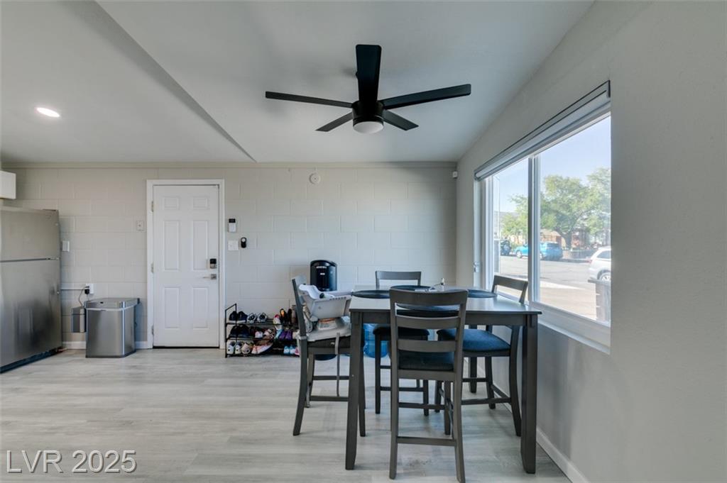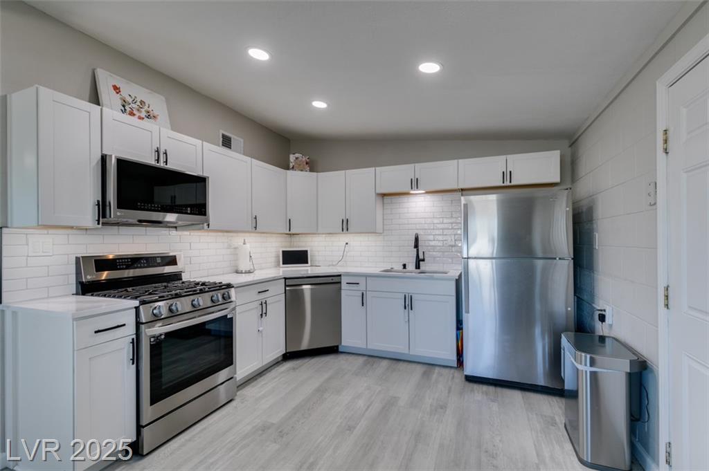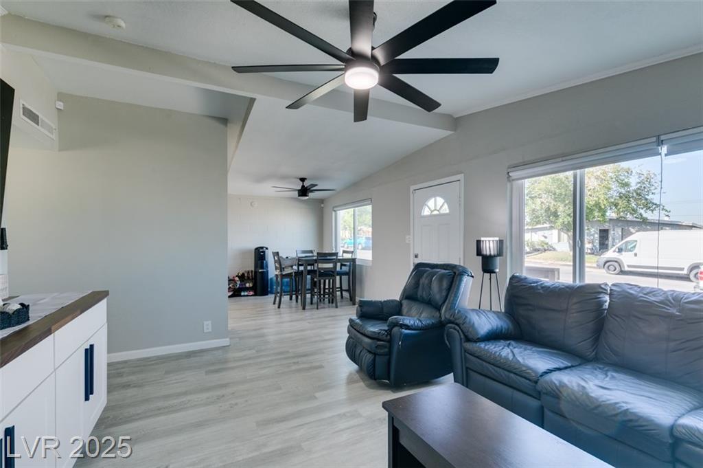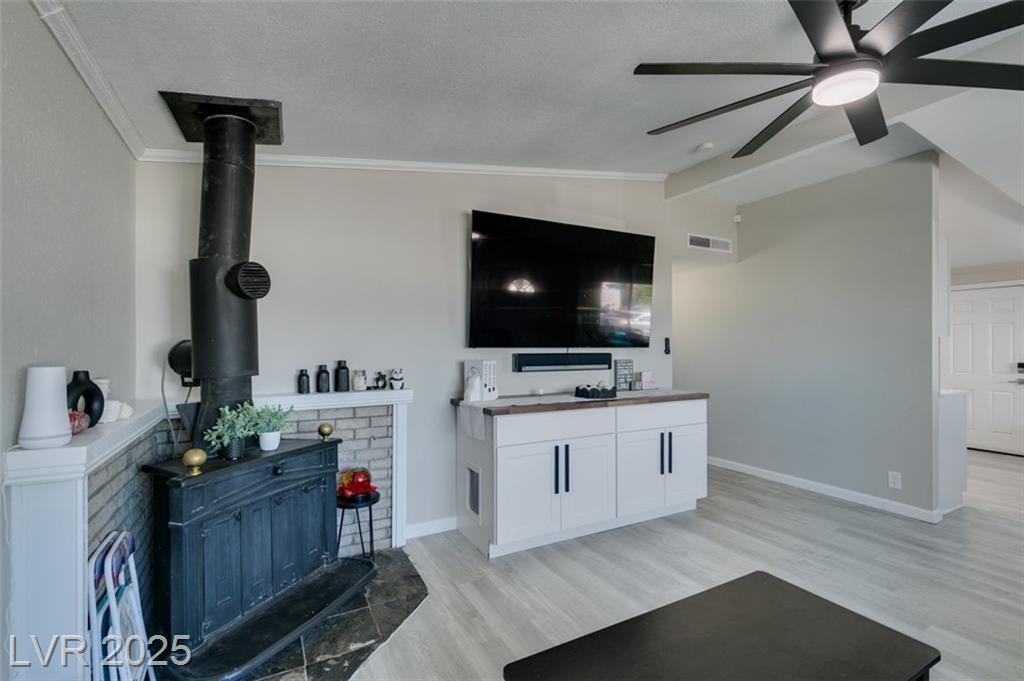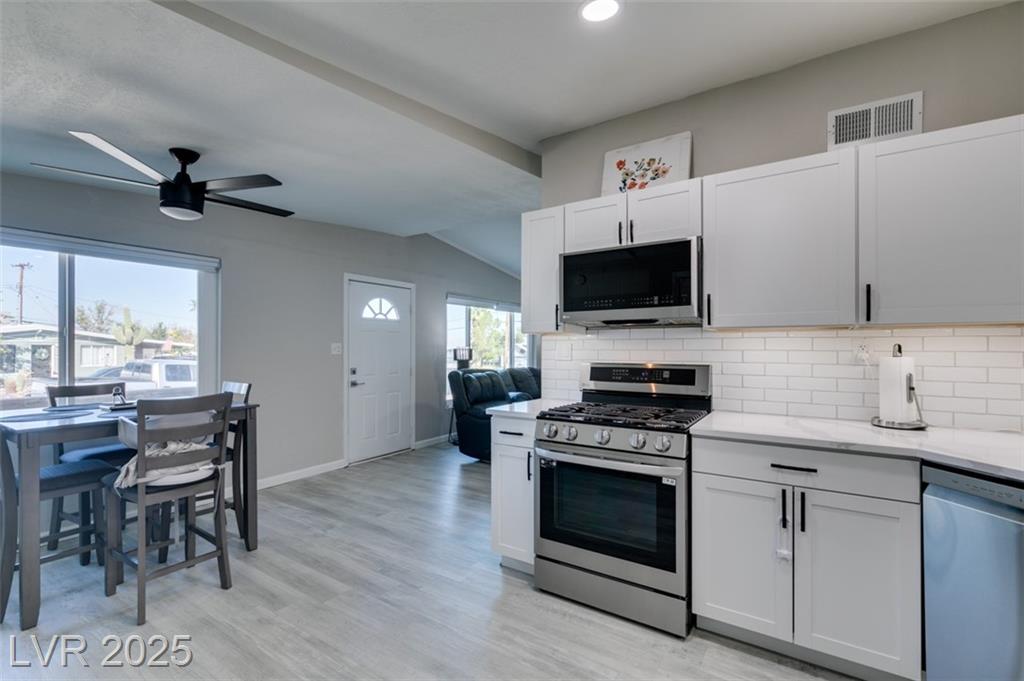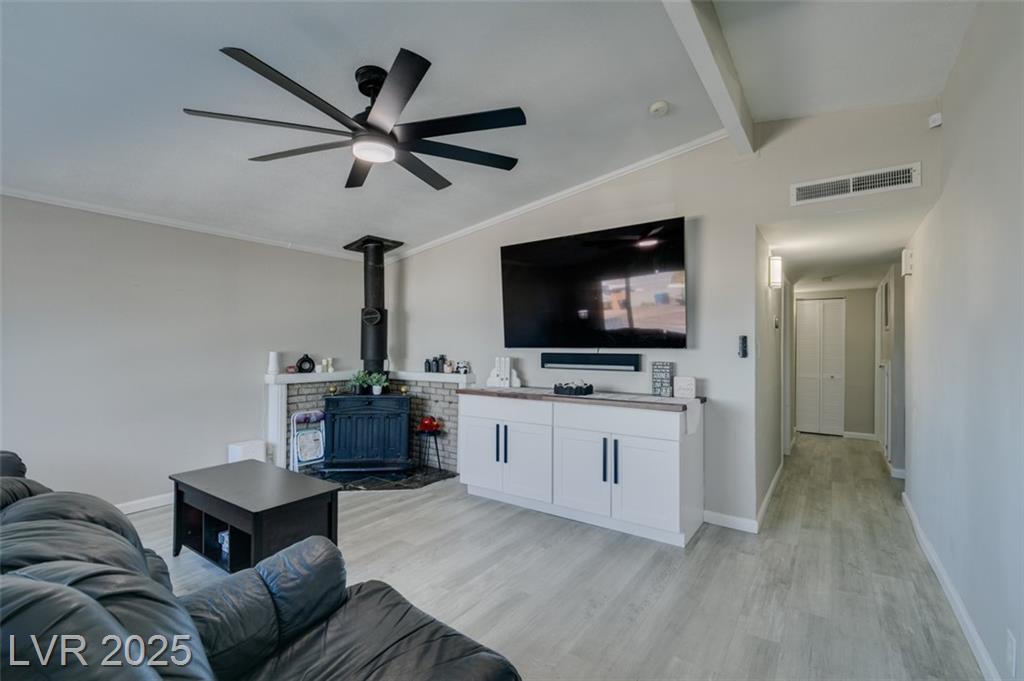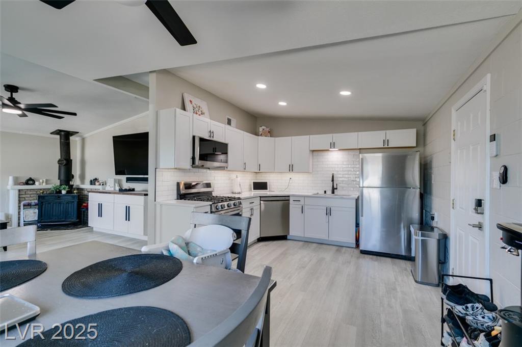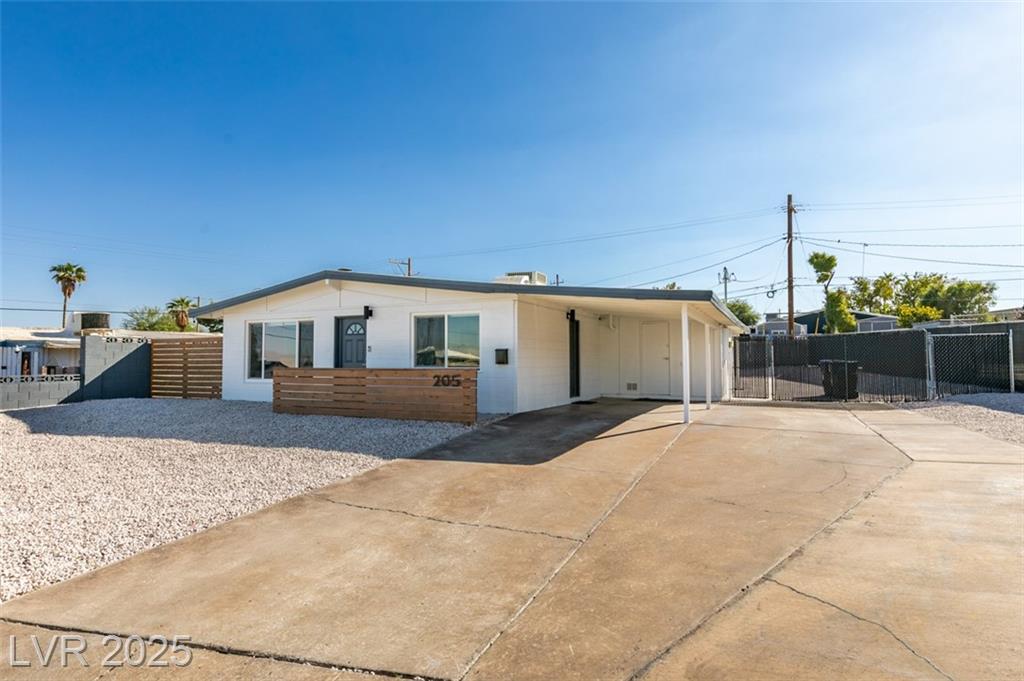 Beautifully renovated Henderson smart home with no HOA! HUGE lot. This modern, cozy retreat features an open-concept layout with luxury laminate flooring, fresh paint, and tons of natural light. The stylish kitchen boasts white shaker cabinets, quartz counters, tile backsplash, and stainless-steel appliances. Enjoy the inviting living room with a charming wood-burning fireplace and large TV with sound bar. Both bathrooms are fully updated with designer tile, black fixtures, and modern finishes. Spacious bedrooms offer comfort and character with exposed beams and plush carpet. Outside, the large backyard with covered patio provides endless potential! Perfect for entertaining or adding a pool. With a huge driveway, carport, RV parking, and low-maintenance landscaping, this move-in-ready gem blends style and Henderson charm, all without HOA restrictions! Do not miss this opportunity, call us today!