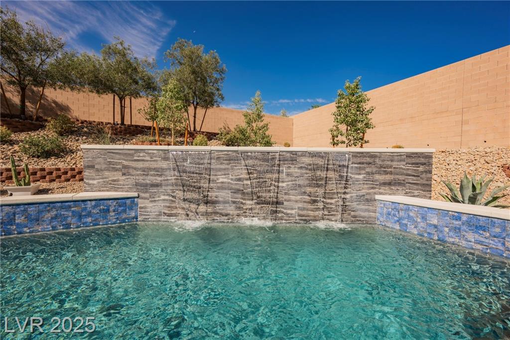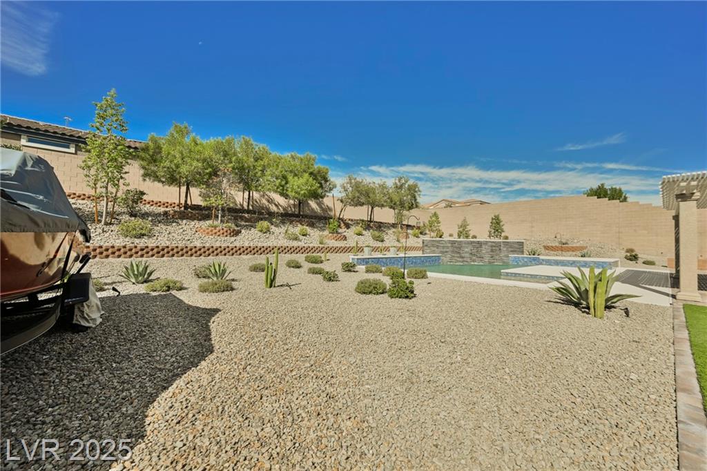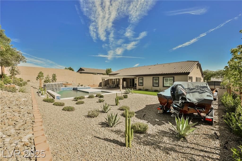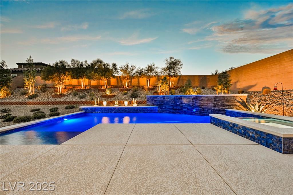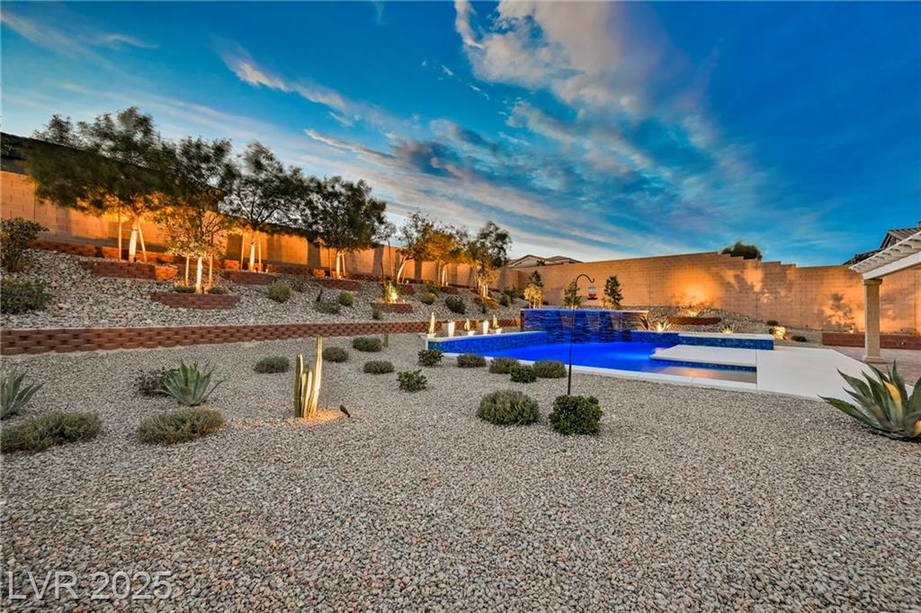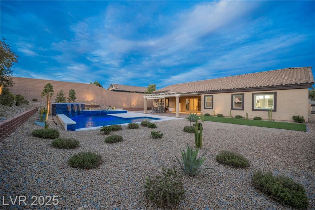 Luxurious single-story home on nearly ½ acre with no HOA, RV parking, and ultimate privacy! This 4-bed, 4-bath beauty offers refined living with crystal chandeliers, wood shutters, recessed lighting, soft-close cabinetry, and elegant granite and tile flooring throughout. The chef’s kitchen is a true centerpiece, showcasing a grand 16x6 island, premium stainless steel appliances, a 64” built-in fridge/freezer, and abundant storage. All bedrooms feature walk-in closets and luxurious bathrooms with glass-enclosed showers. The expansive primary suite offers direct access to a covered patio—perfect for relaxing mornings or peaceful evenings. Recent upgrades include a new water softener, reverse osmosis system, front security screen door, and sliding screen doors on all patio doors. Huge backyard is a private oasis with artificial turf, professionally designed desert landscaping, waist-high brick decorative wall, and a resort-style pool with 3 waterfalls, spa & a tall block wall for privacy.