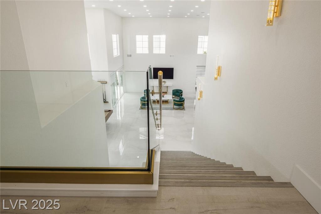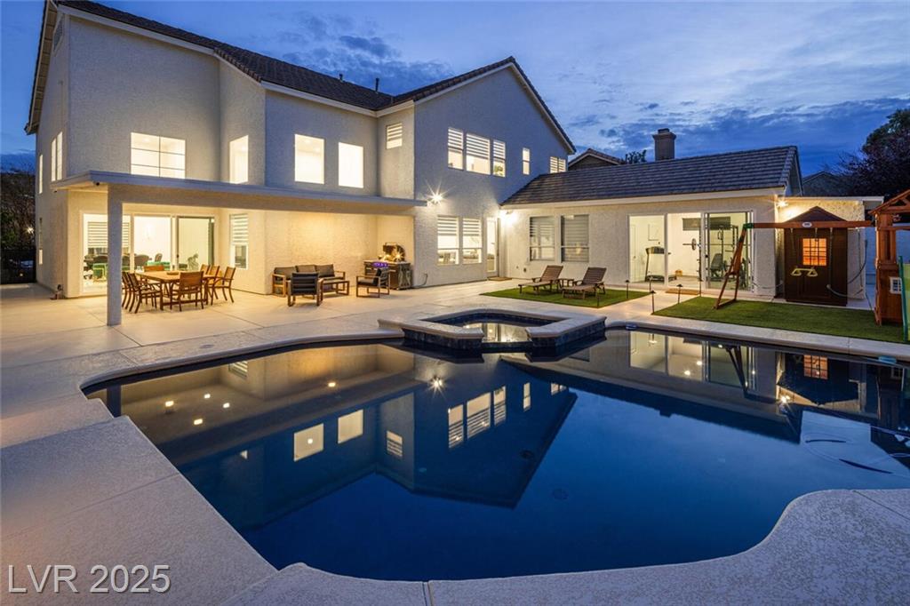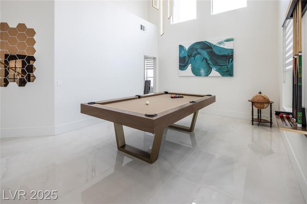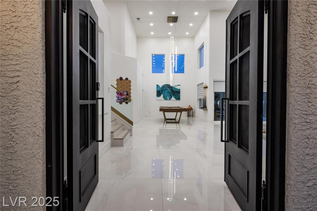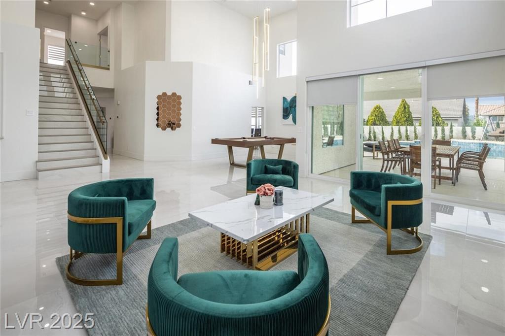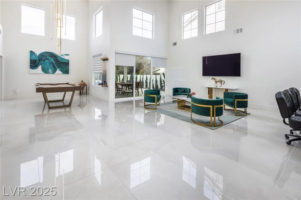 Castle Gate, where luxury & comfort converge. This fully remodeled estate features over $400K in upgrades, blending modern elegance with timeless charm.The grand entry 26-foot ceilings, glass railings, & an open layout designed for entertaining & everyday living. A game lounge with pool & poker table creating the perfect space for gatherings. Downstairs includes a private home theater, gym, brand-new dry sauna, & 2expansive slider doors that open to a beautifully landscaped backyard oasis, ideal for entertaining or relaxing. Upstairs offers renovated bedrooms & spa-inspired bathrooms custom showers, modern flooring, fresh paint, & stylish lighting. upgrades include new garage doors, landscaping, an upstairs AC unit, & brand-new exterior security cameras. Ideally located minutes from Downtown Summerlin, Red Rock Hotel, Boca Park, shopping, dining, parks, & trails, this home offers unparalleled amenities. Furniture & gym equipment are negotiable, making this a move-in-ready opportunity.