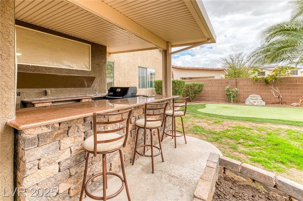 Welcome to this inviting single-story home offering a comfortable layout with plenty of space to enjoy both inside and out. Featuring new carpet throughout and a freshly painted living area. The flexible floor plan includes a separate study/dining room, kitchen with pull-out drawers and ample storage. The backyard is ideal for outdoor living with a covered patio, built-in kitchen/bar, and a putting green. Additional features include plantation shutters, a front door security screen and storage in the garage. Located in a great neighborhood close to shops, parks, trails and restaurants. This move-in ready home combines comfort, convenience, and functionality.