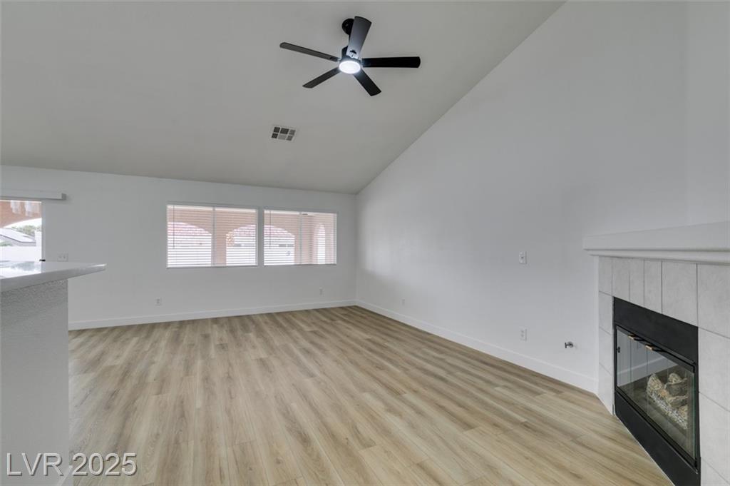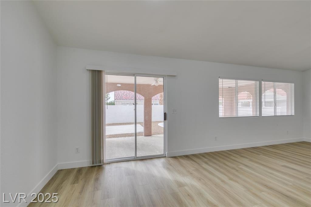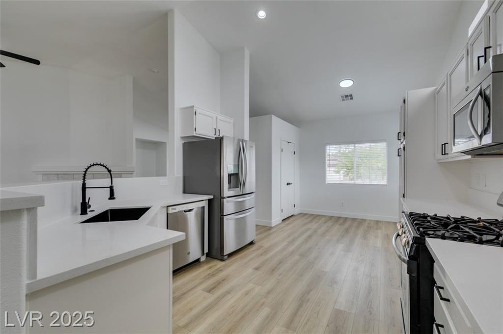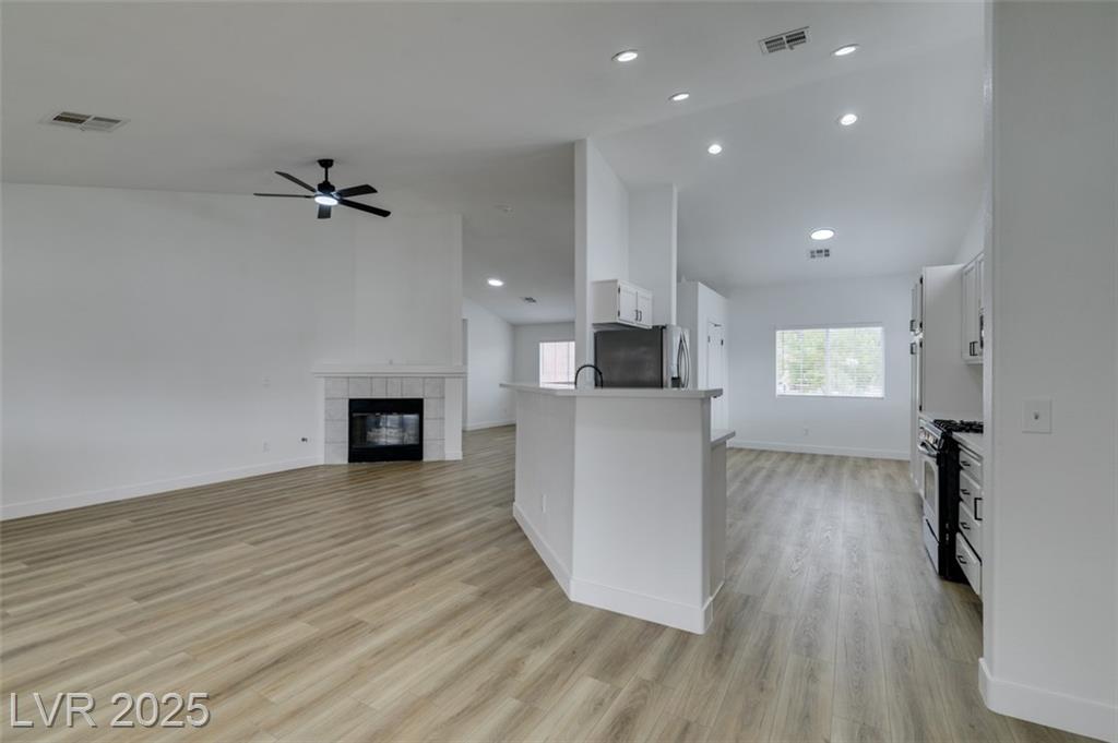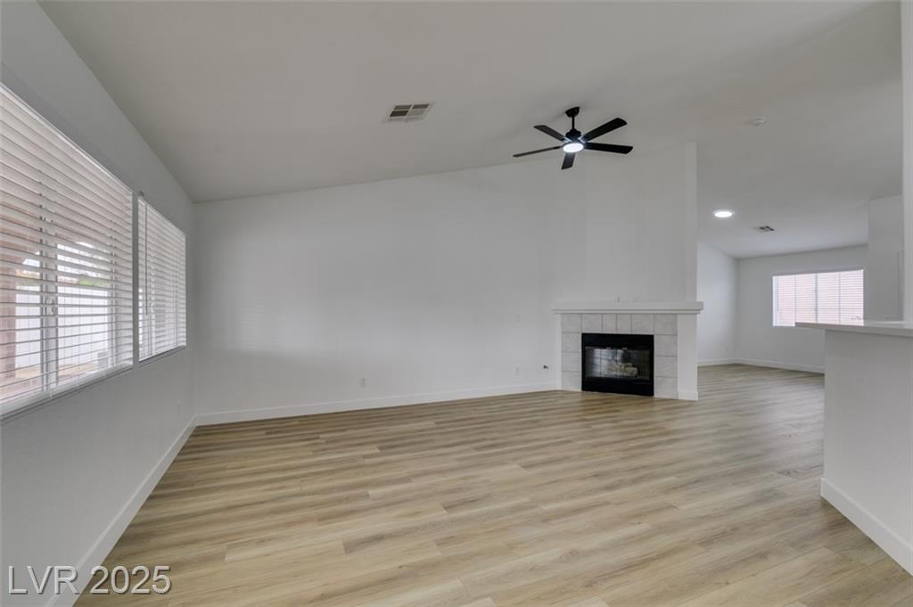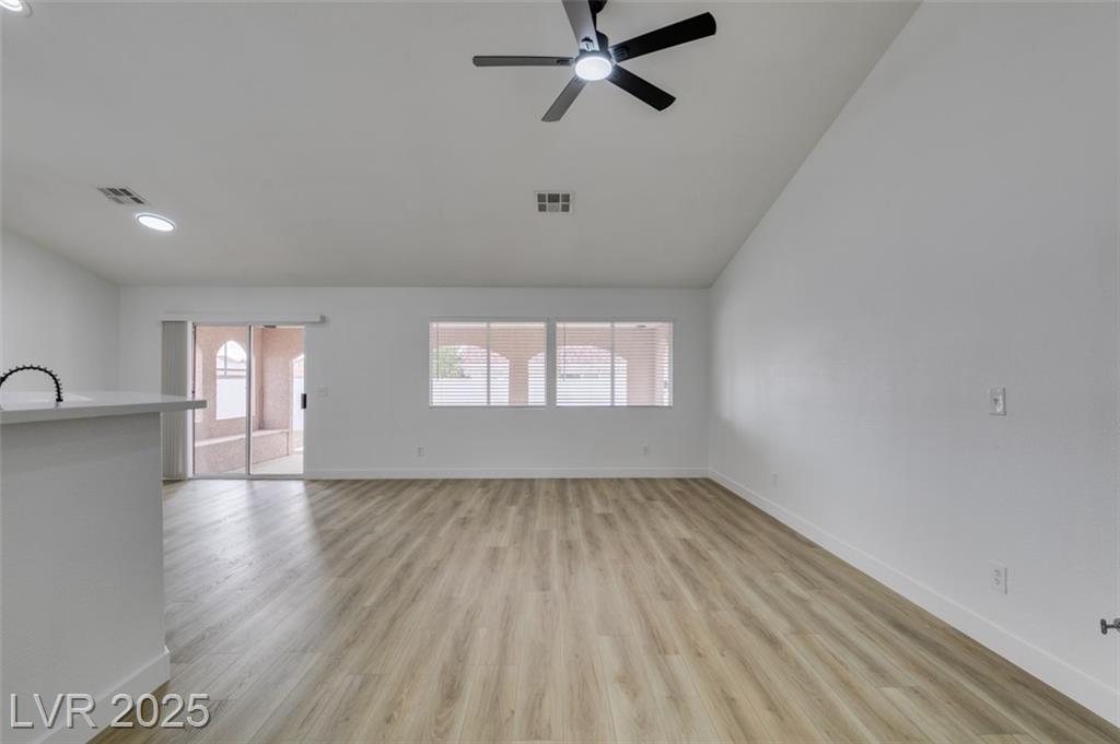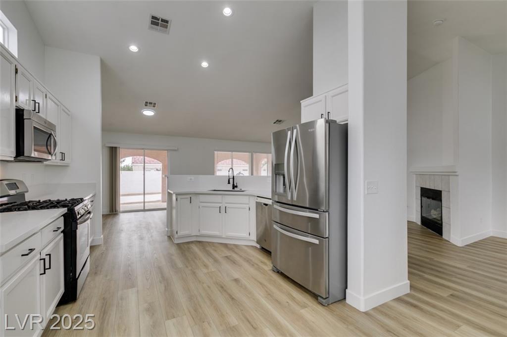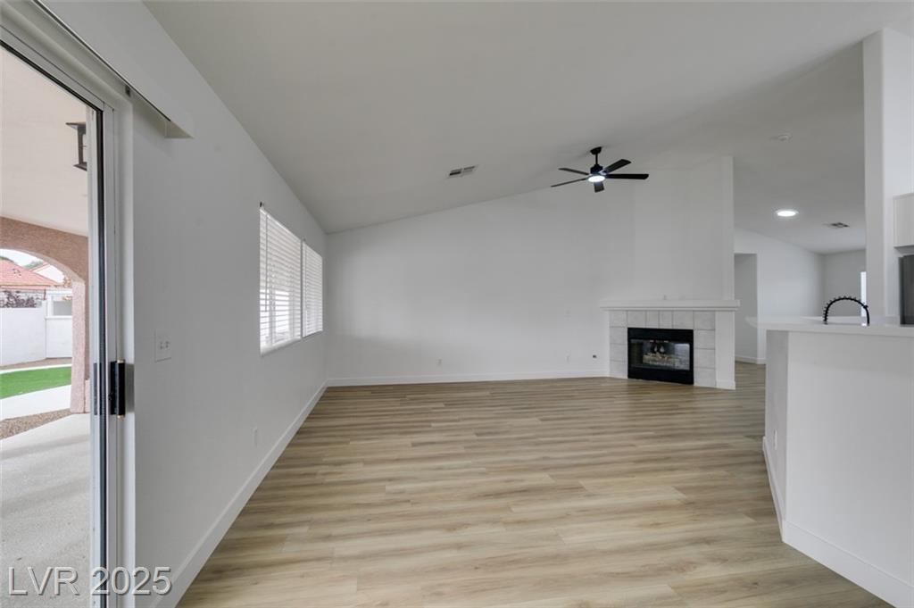 Beautifully updated three-bedroom single-story home near Aliante! This move-in-ready property features fresh paint, luxury vinyl plank flooring throughout, quartz countertops, upgraded cabinets, and stainless steel appliances. Enjoy the cozy fireplace off the family room, ceiling fans in every bedroom, and 2.5” white blinds throughout. The washer and dryer are included, and the low-maintenance desert landscaping with a covered patio makes outdoor living effortless. Conveniently located near shopping, dining, and parks — this home is ready for immediate occupancy!