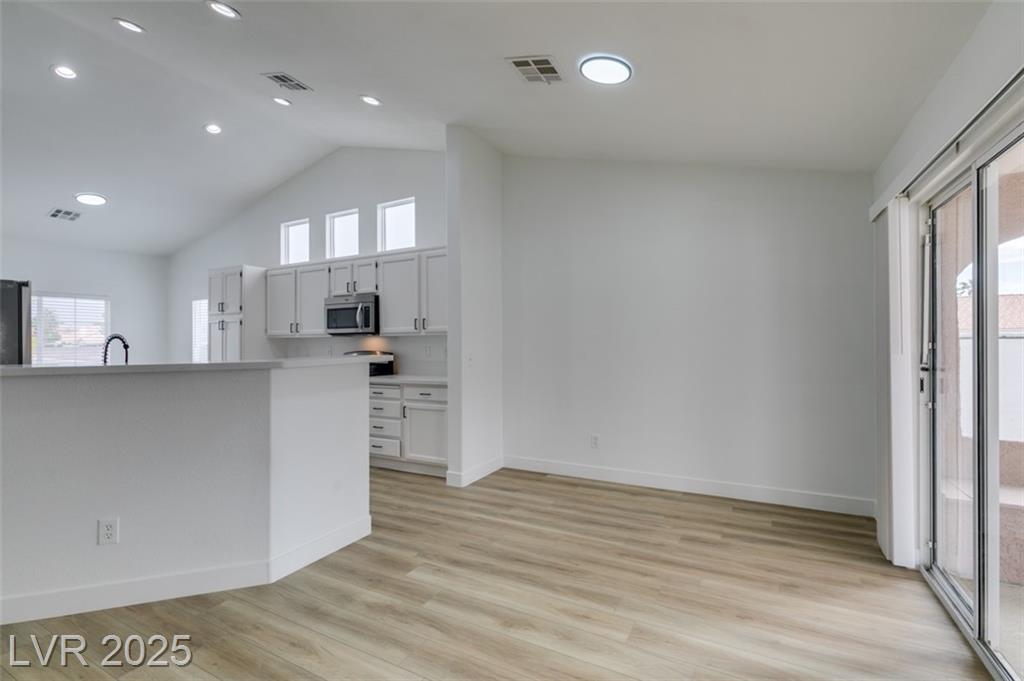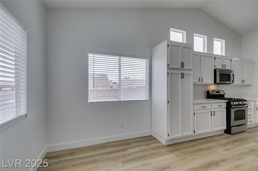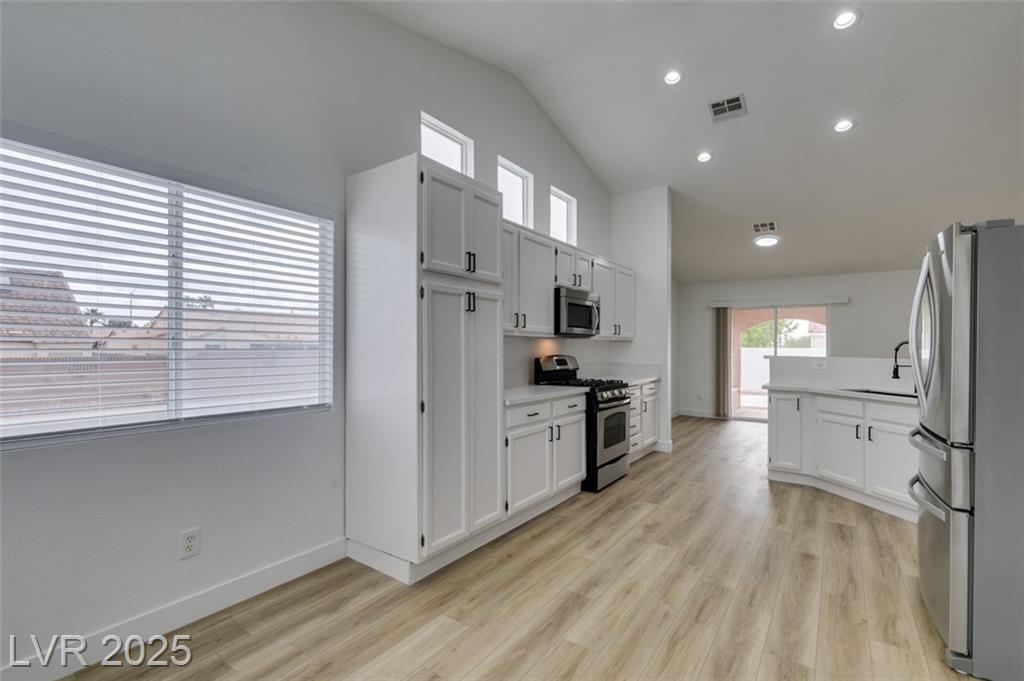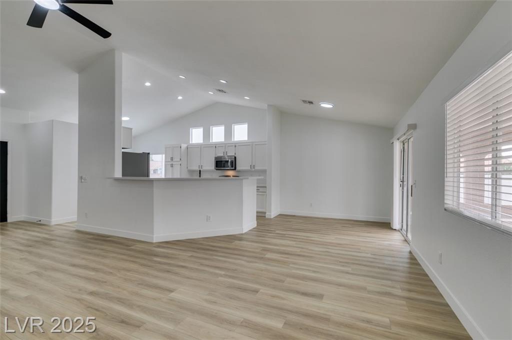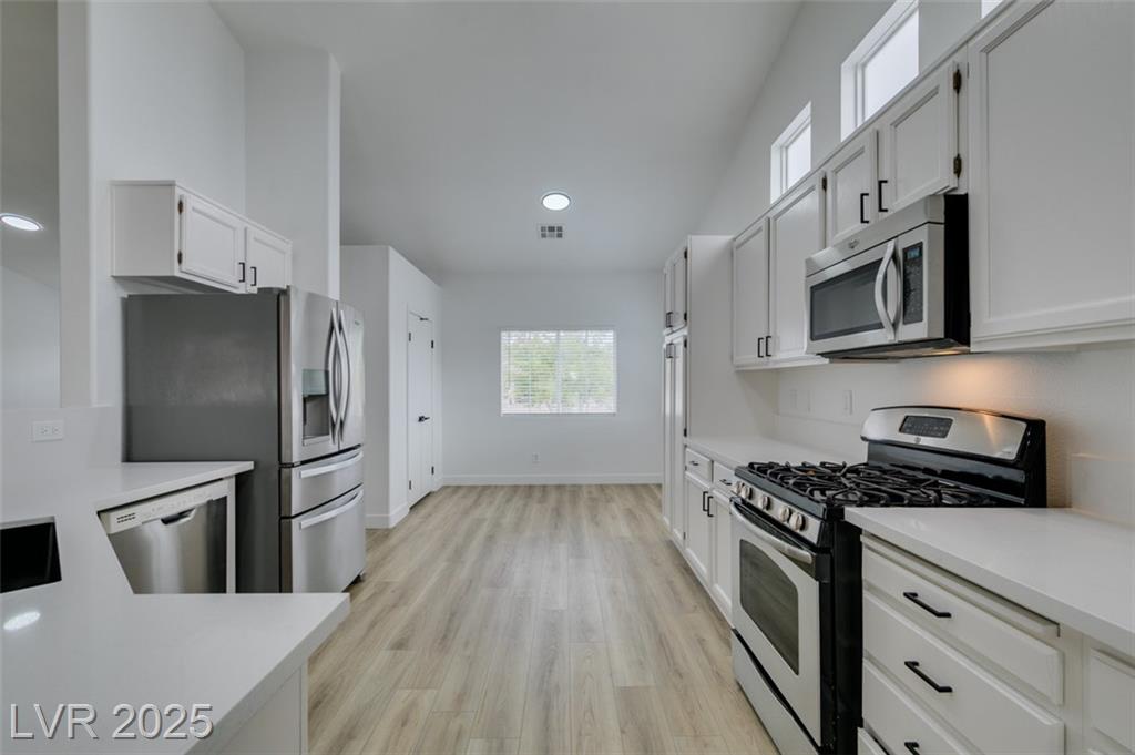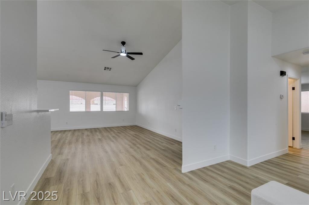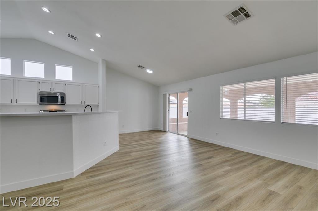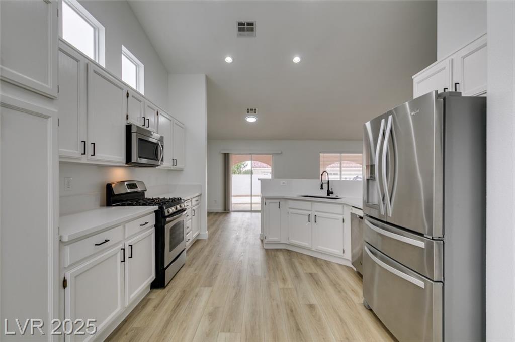 Beautifully updated three-bedroom single-story home near Aliante! This move-in-ready property features fresh paint, luxury vinyl plank flooring throughout, quartz countertops, upgraded cabinets, and stainless steel appliances. Enjoy the cozy fireplace off the family room, ceiling fans in every bedroom, and 2.5” white blinds throughout. The washer and dryer are included, and the low-maintenance desert landscaping with a covered patio makes outdoor living effortless. Conveniently located near shopping, dining, and parks — this home is ready for immediate occupancy!