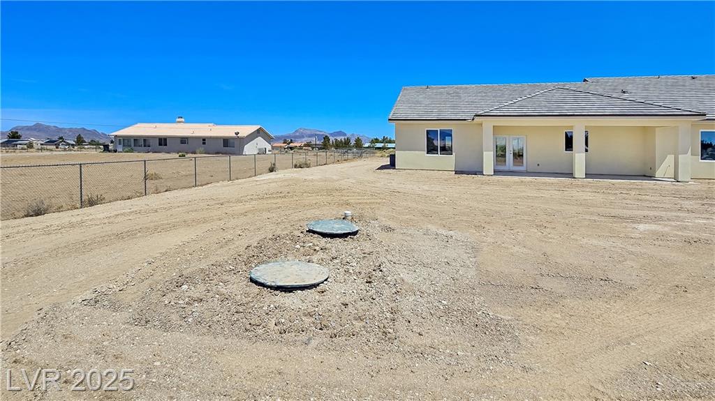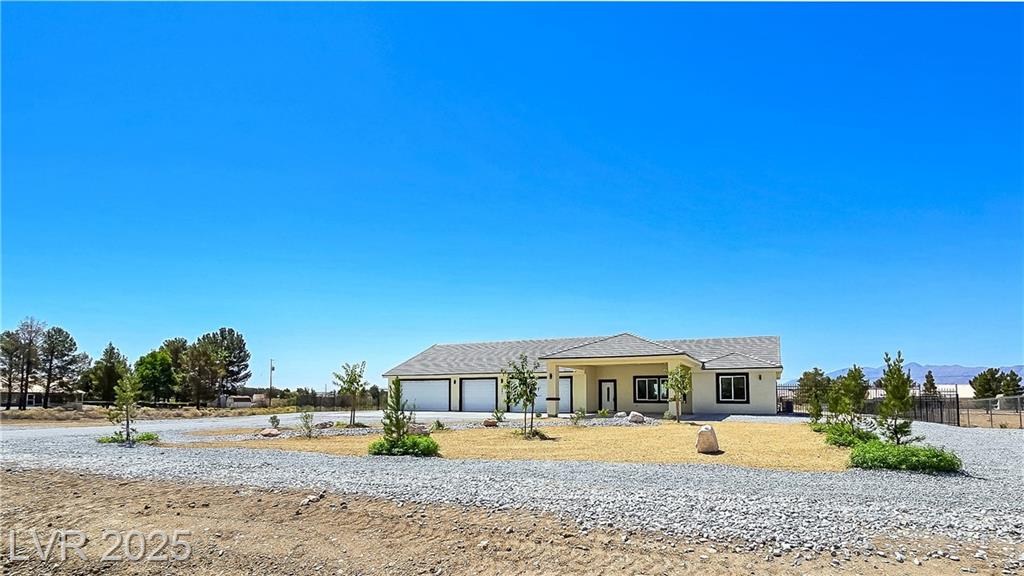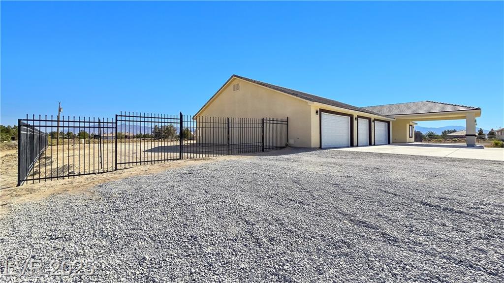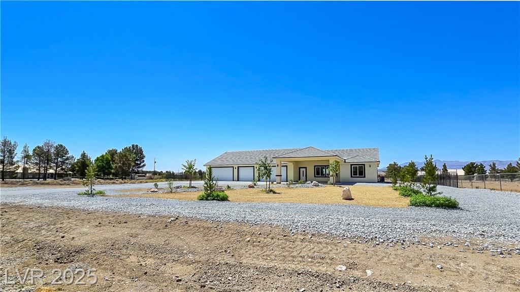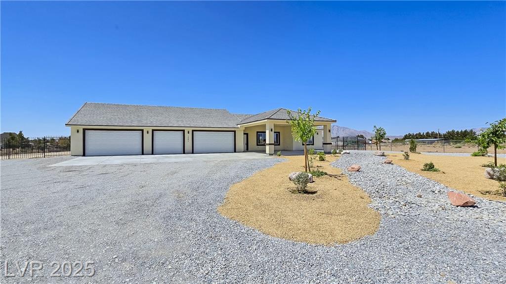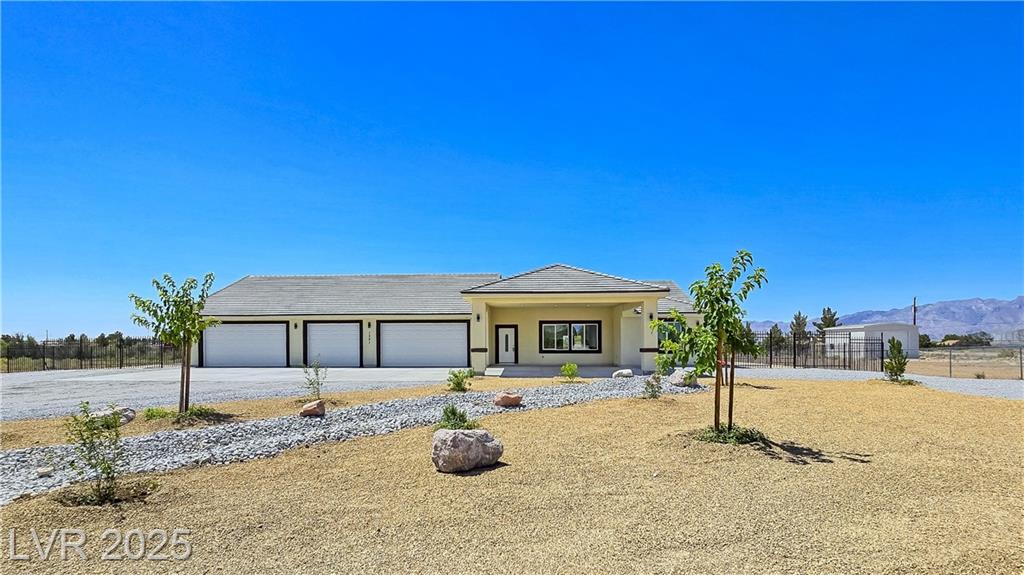 Gorgeous custom built with 2x6 studs, single story on over acre lot with private well and oversized 7 car attached garage. Open floor plan. Gourmet chef kitchen with stainless steel appliances, custom cabinets, quartz oversized island and pendant lighting. Crown molding in living room, lifeproof flooring throughout, upgraded tile and fixtures throughout. Vanities with quartz counters in all the bathrooms. Primary bathroom has an oversized walk-in shower and soaking tub. Secondary bedroom with attached bathroom great for guests/family. Covered patio great for entertaining! Decorative fence with RV gates and parking with hookups. Front entrance with circular driveway and Porte-cochère! Your own private well! Truly a must see! Amazing mountain views both front and back of the home!