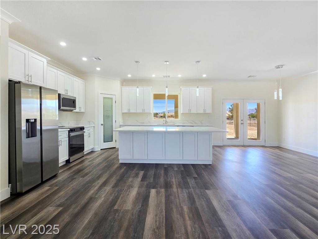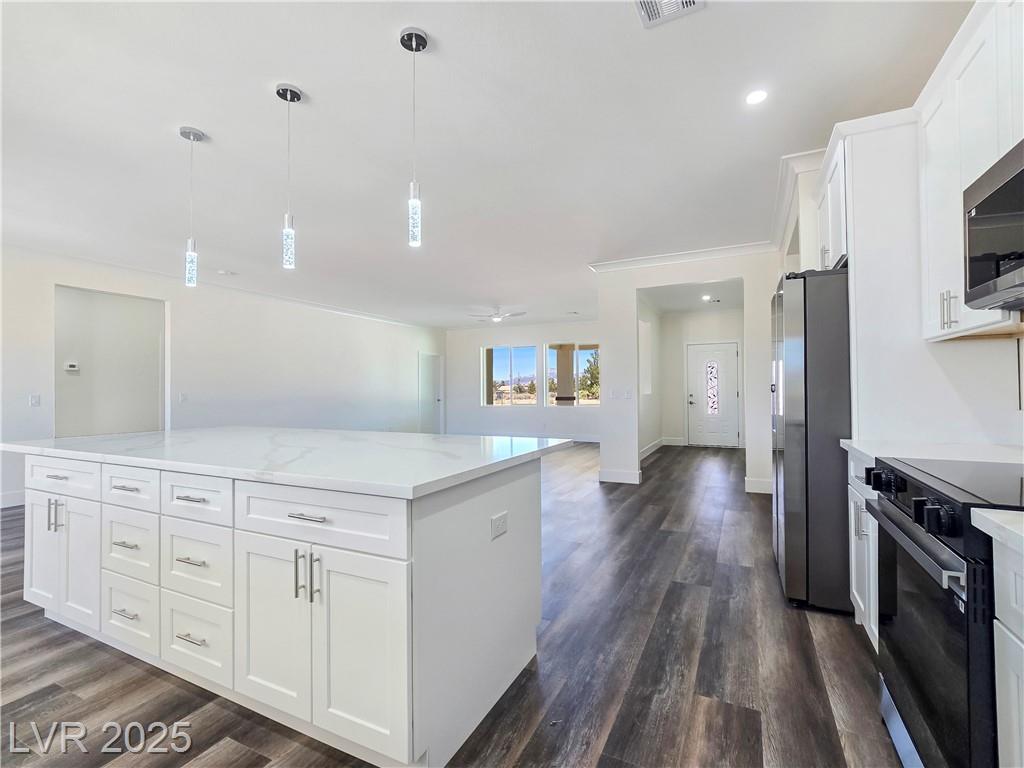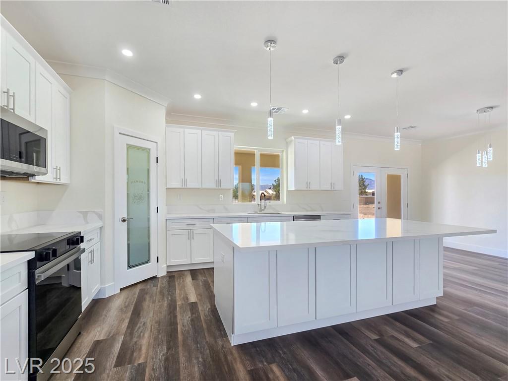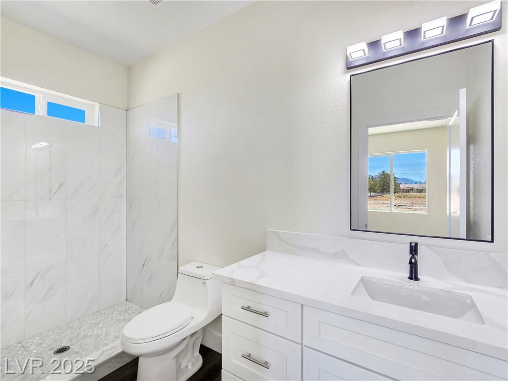 Gorgeous custom built with 2x6 studs, single story on over acre lot with private well and oversized 7 car attached garage. Open floor plan. Gourmet chef kitchen with stainless steel appliances, custom cabinets, quartz oversized island and pendant lighting. Crown molding in living room, lifeproof flooring throughout, upgraded tile and fixtures throughout. Vanities with quartz counters in all the bathrooms. Primary bathroom has an oversized walk-in shower and soaking tub. Secondary bedroom with attached bathroom great for guests/family. Covered patio great for entertaining! Decorative fence with RV gates and parking with hookups. Front entrance with circular driveway and Porte-cochère! Your own private well! Truly a must see! Amazing mountain views both front and back of the home!