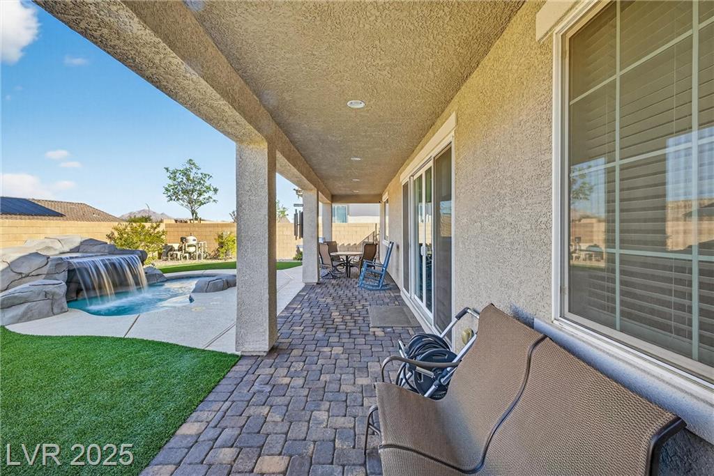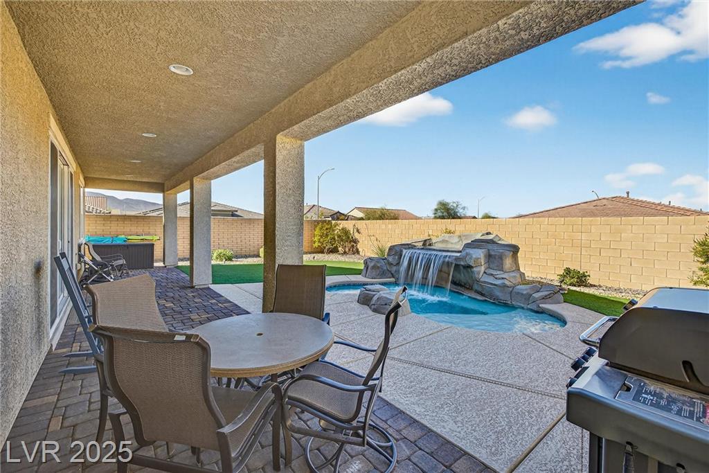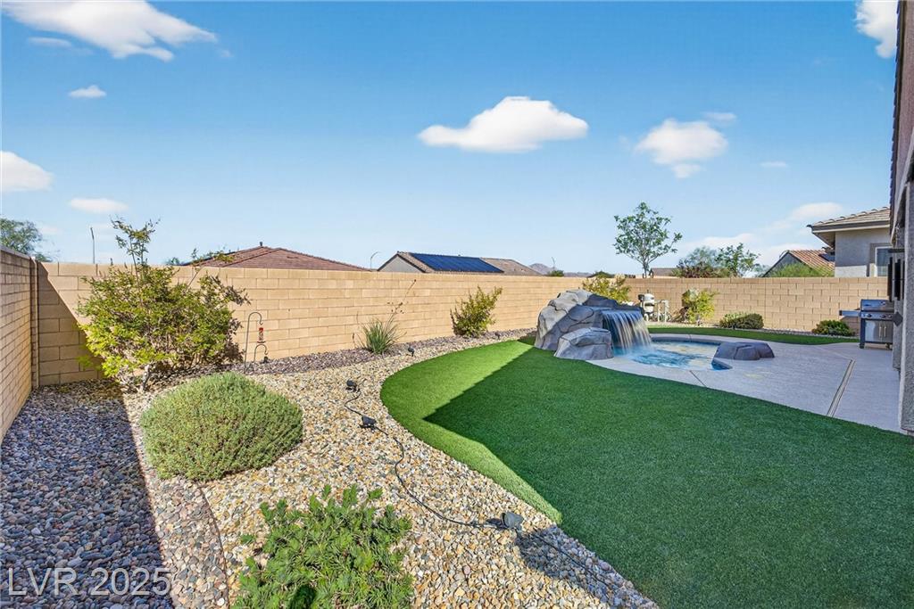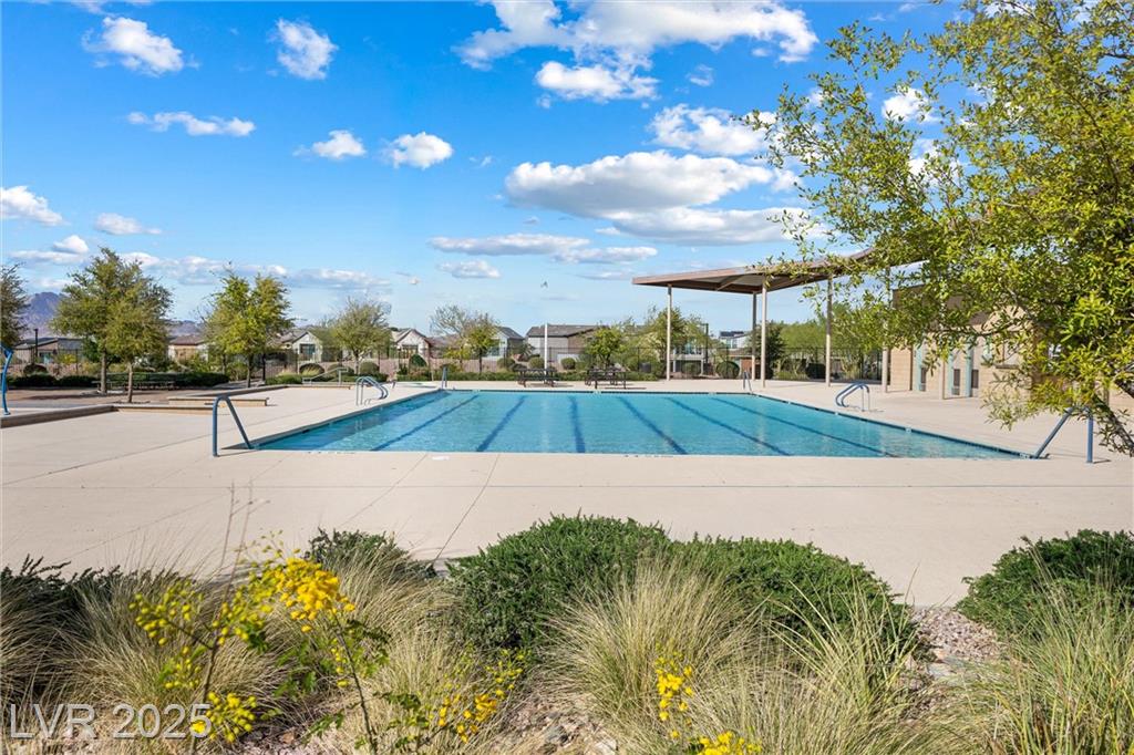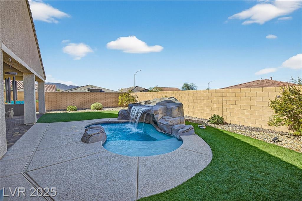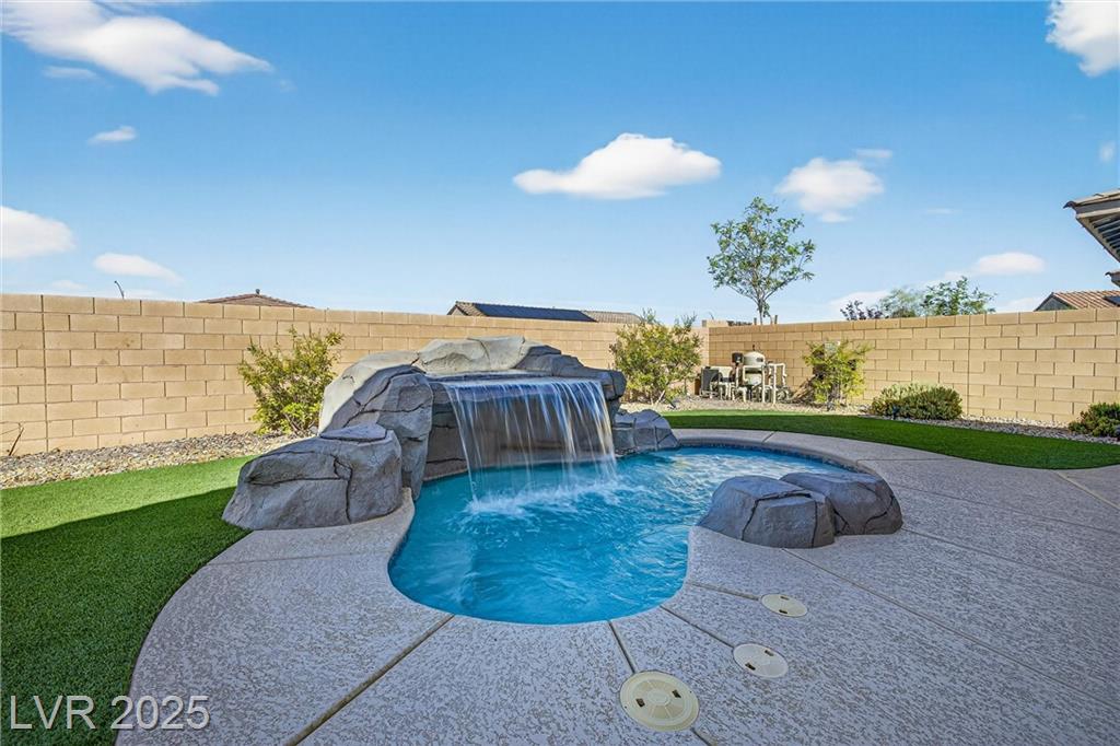Welcome to this stunning home in the highly sought-after Cadence master-planned community of Henderson. Proudly owned by the original owners, this residence showcases premium builder upgrades and high ceilings throughout. Enjoy a gourmet kitchen with quartz countertops, stainless steel appliances, and abundant cabinetry, plus an extended primary bath, 8” doors, custom closets, and LED lighting. The versatile den offers space for an office or 4th bedroom, and the fully insulated garage adds comfort year-round. Step outside to your private backyard oasis with a pool and waterfall, covered patio, and gas line ready for outdoor grilling—perfect for entertaining. Live the resort lifestyle with access to Cadence’s 50-acre Central Park, community pool, pickleball courts, splash pads, and scenic trails—all minutes from Lake Mead and the Las Vegas Strip. A true pride of ownership makes this home a must-see!