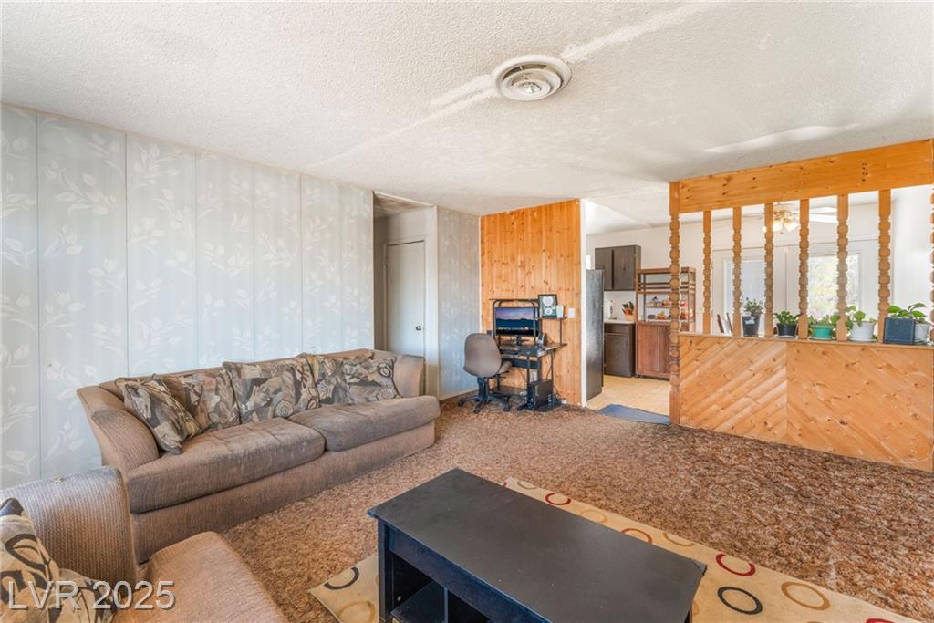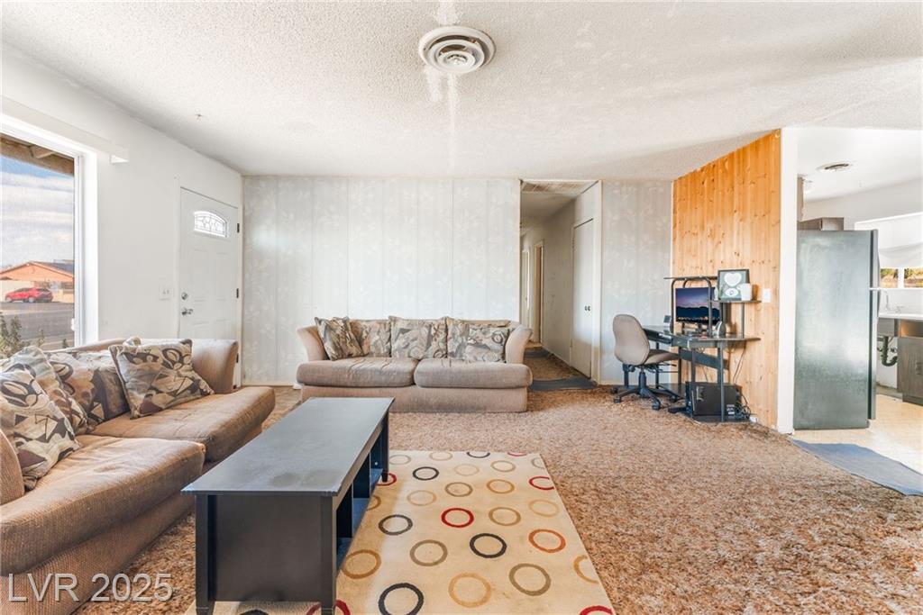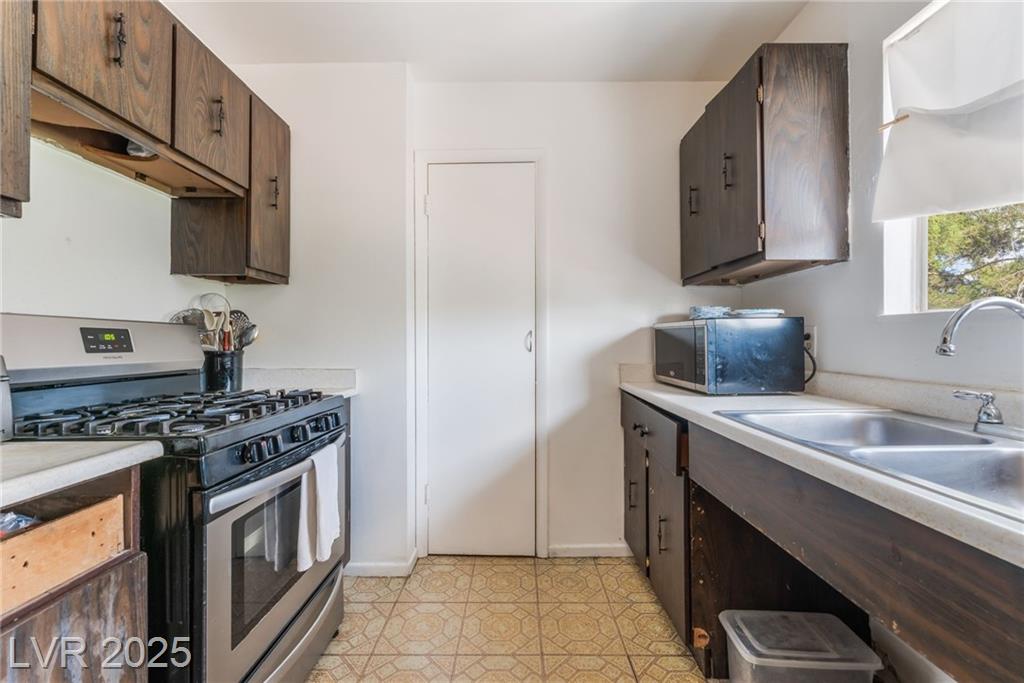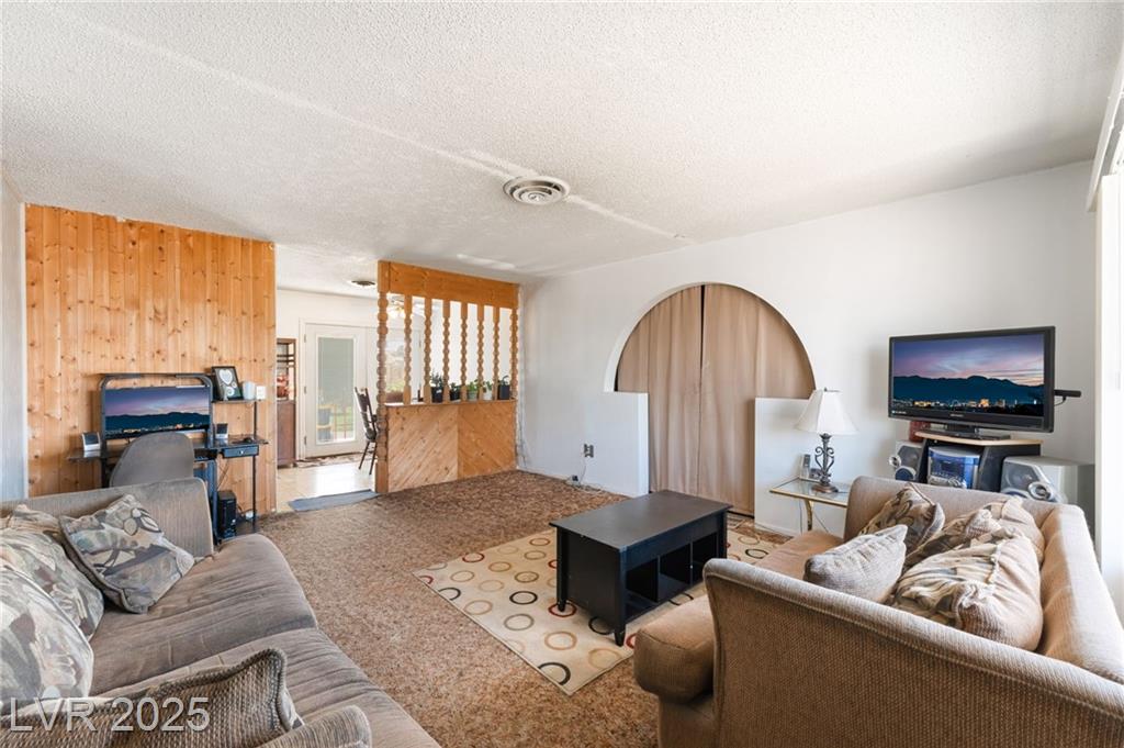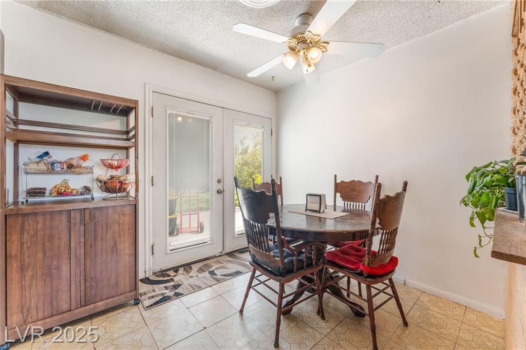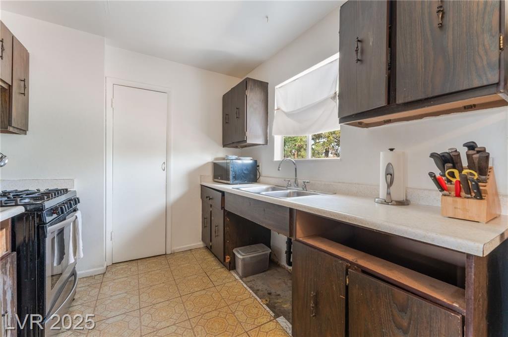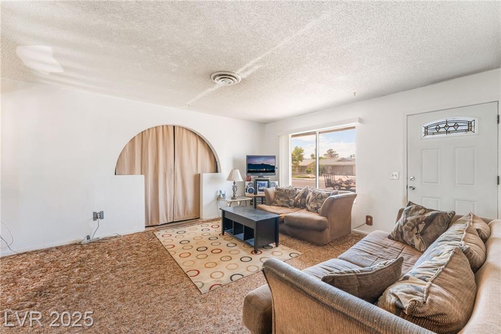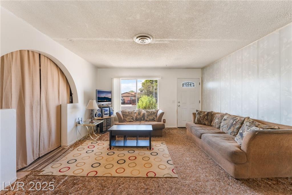 Discover this charming single-story residence, featuring a classic ranch-style facade and a low-maintenance desert landscape. The interior presents a comfortable living space with a cohesive floor plan. The living room is spacious, featuring cozy brown carpet, a large window for natural light, and an arched opening that adds character. The adjoining dining area is functional with tile flooring, a ceiling fan, and access to the backyard through glass-paned French doors. The kitchen maintains its original aesthetic with dark wood cabinetry, contrasting white countertops, and a modern stainless steel gas range/oven, bathroom is clean and practical, with a white vanity and a frosted-glass stall shower. This property is an ideal opportunity for those seeking a home with good bones and the potential for personalization.