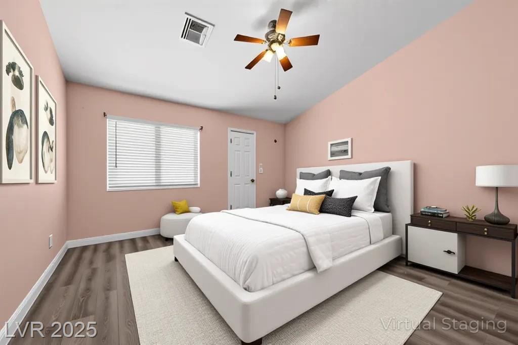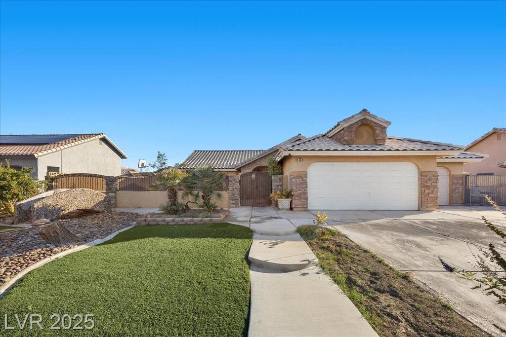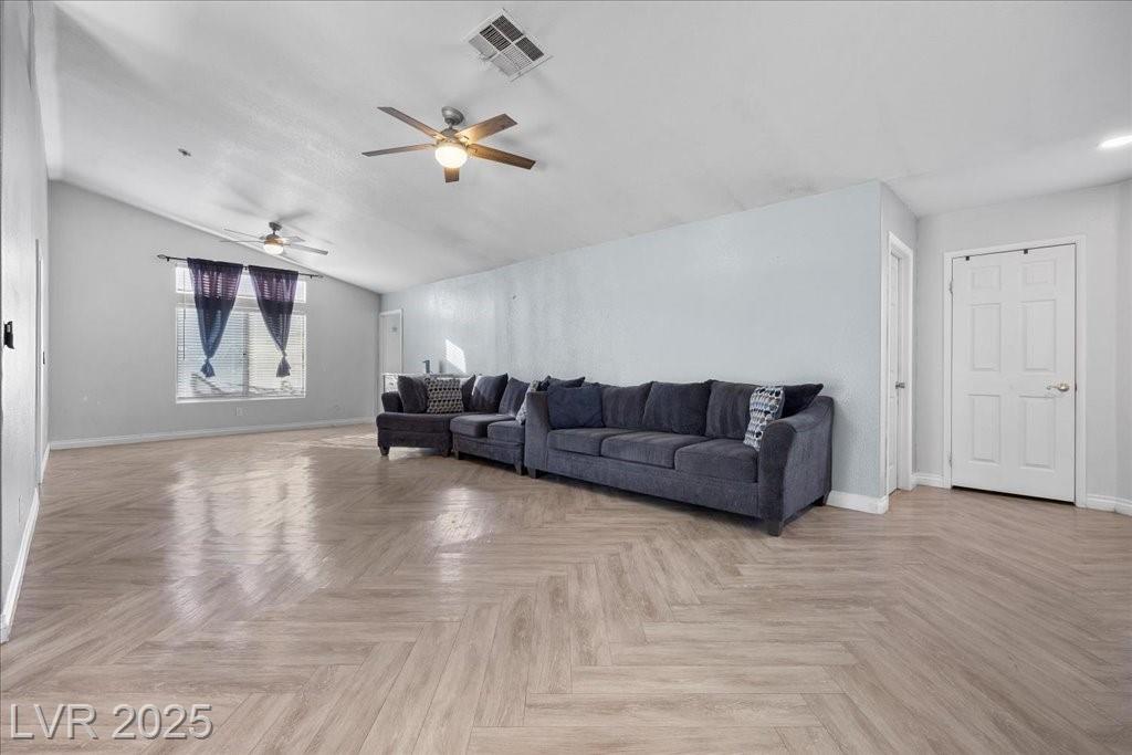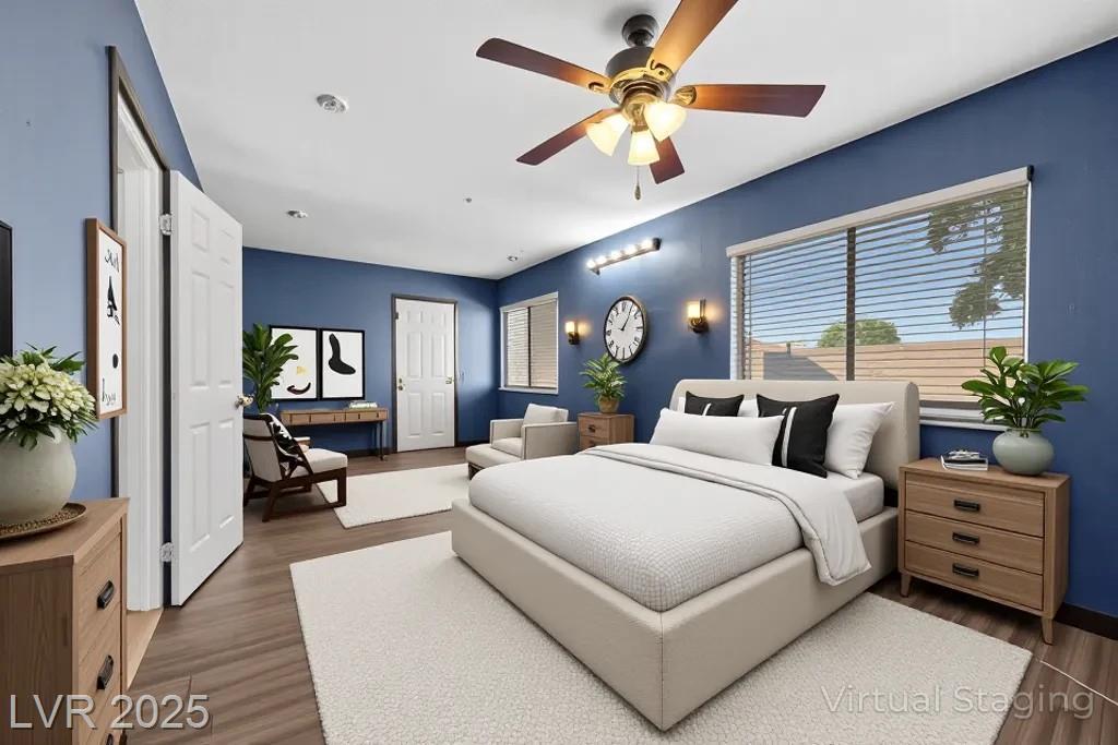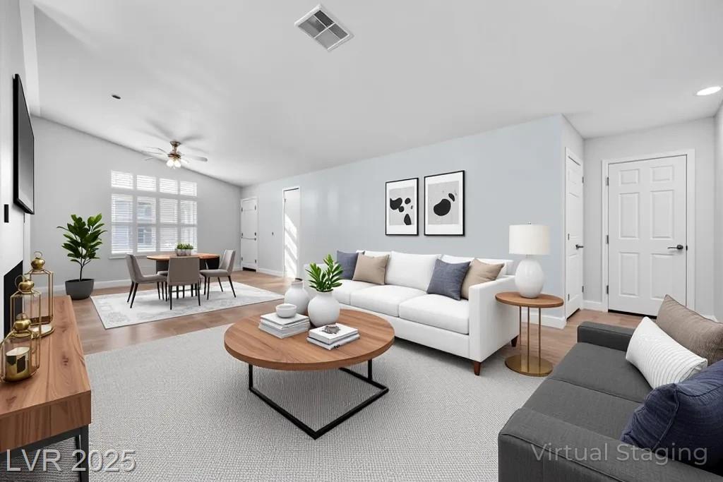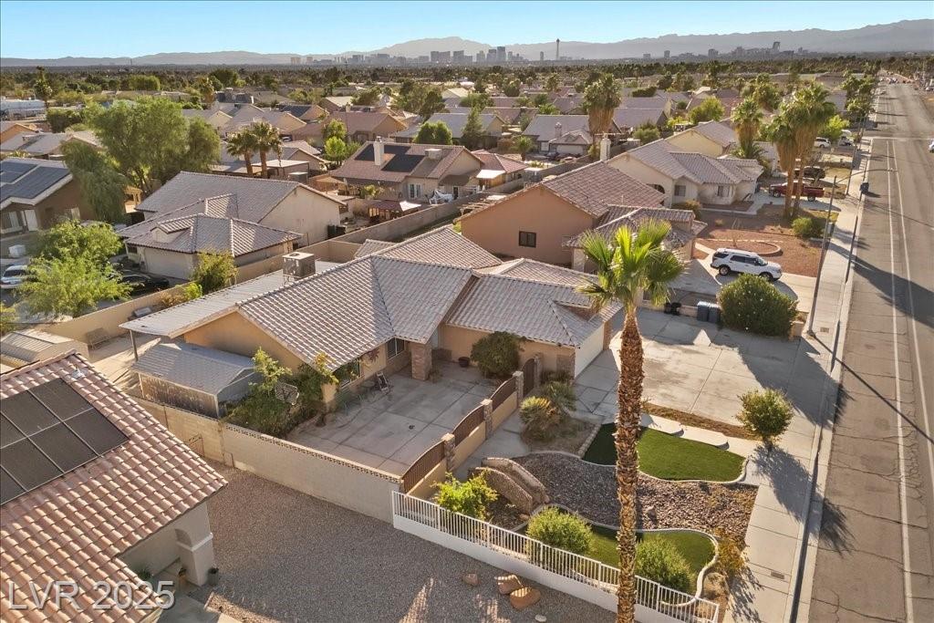 Welcome home to this beautifully maintained single-story on an oversized ¼-acre lot with no HOA! From its inviting curb appeal to the stunning mountain views, this home offers the perfect blend of comfort and pride of ownership. The open floor plan features vaulted ceilings, abundant natural light, and a bright kitchen with quartz countertops, custom cabinetry, and stainless steel appliances. Includes 4 bedrooms and 2 full baths, with a spacious primary suite, walk-in closet, and ensuite bath. The converted 3rd car garage adds flexibility, while an expanded secondary bedroom is ideal for an office or guest room. Enjoy the large covered patio, private courtyard, and landscaped yard with mature trees and fruit plants. Gated RV parking, extended driveway, newer 4-ton A/C, and luxury vinyl plank flooring complete this move-in-ready Las Vegas home near schools, shopping, dining, and parks.