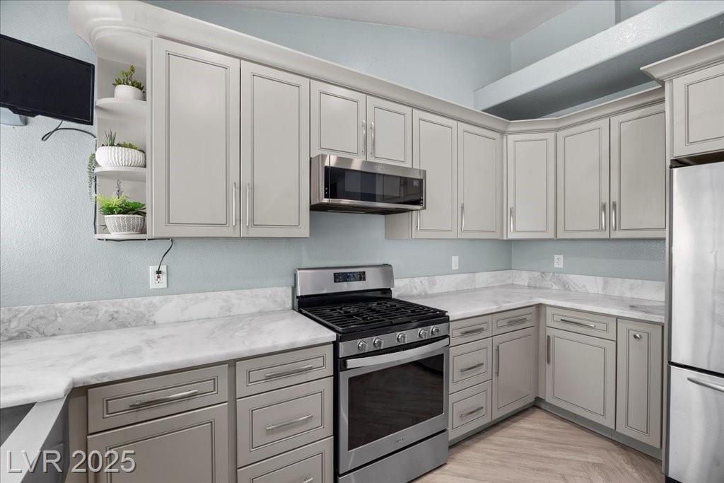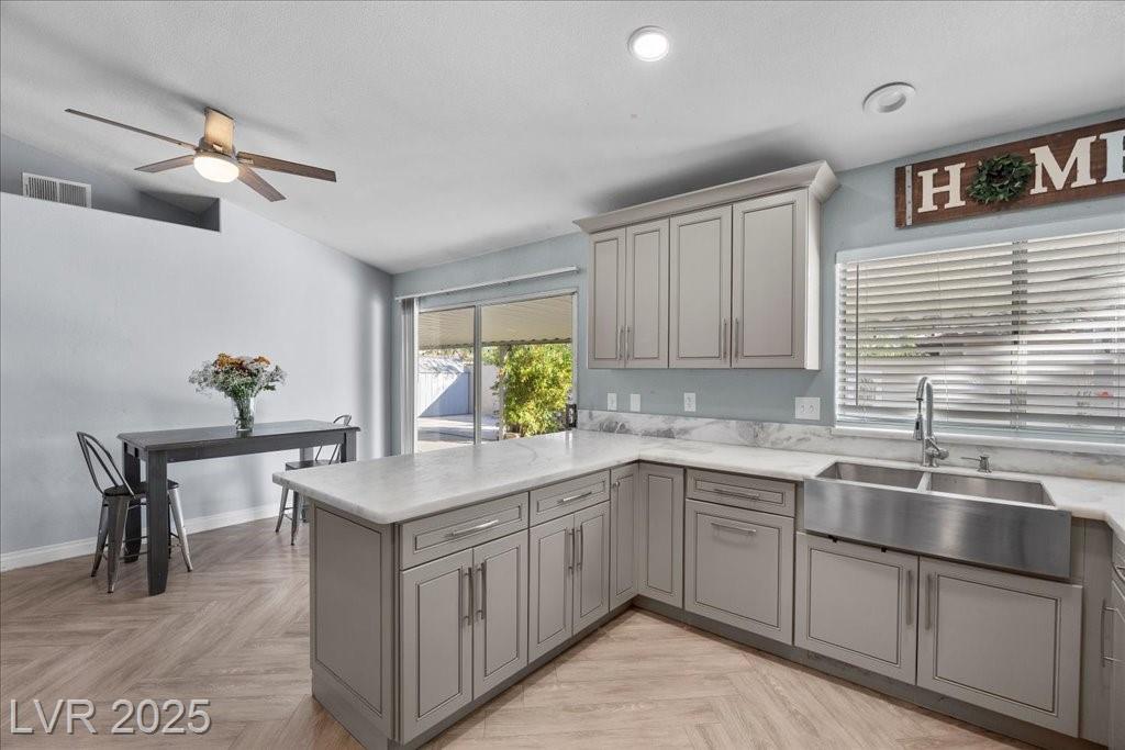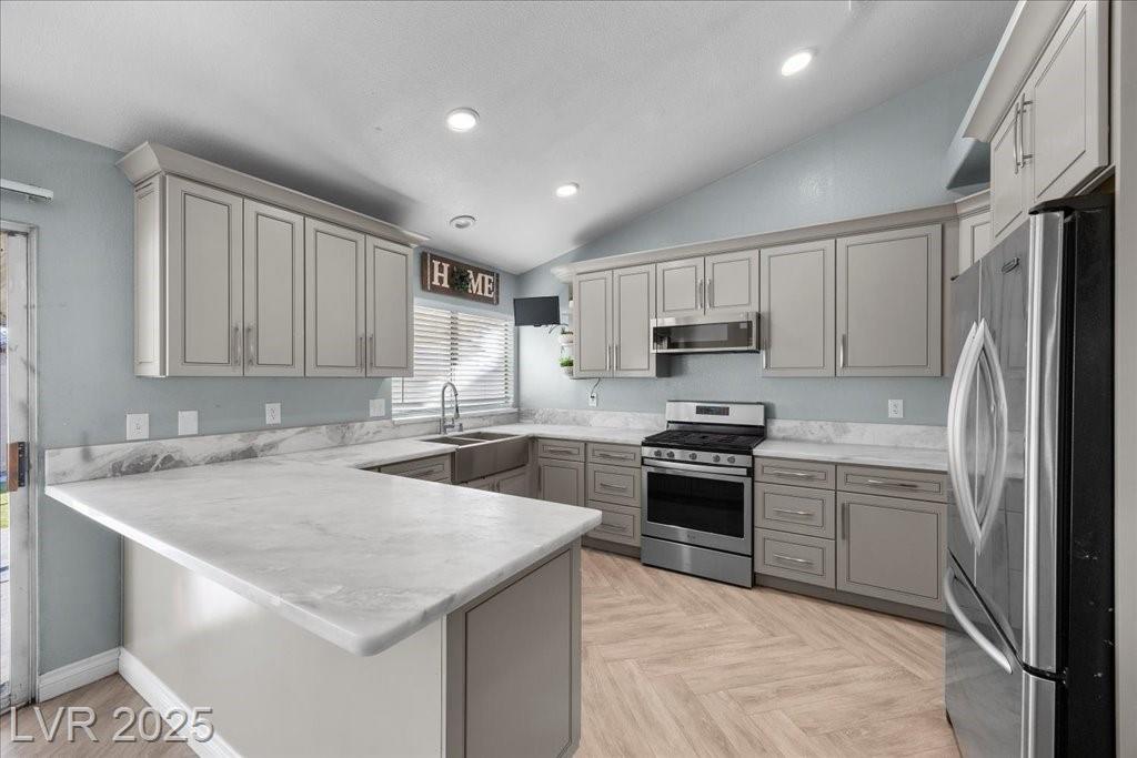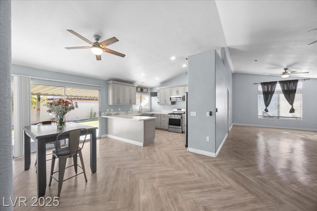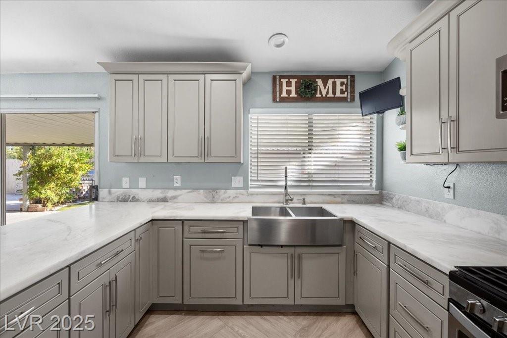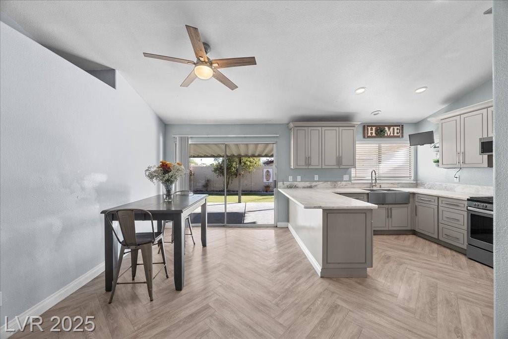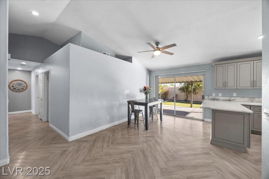 Welcome home to this beautifully maintained single-story on an oversized ¼-acre lot with no HOA! From its inviting curb appeal to the stunning mountain views, this home offers the perfect blend of comfort and pride of ownership. The open floor plan features vaulted ceilings, abundant natural light, and a bright kitchen with quartz countertops, custom cabinetry, and stainless steel appliances. Includes 4 bedrooms and 2 full baths, with a spacious primary suite, walk-in closet, and ensuite bath. The converted 3rd car garage adds flexibility, while an expanded secondary bedroom is ideal for an office or guest room. Enjoy the large covered patio, private courtyard, and landscaped yard with mature trees and fruit plants. Gated RV parking, extended driveway, newer 4-ton A/C, and luxury vinyl plank flooring complete this move-in-ready Las Vegas home near schools, shopping, dining, and parks.