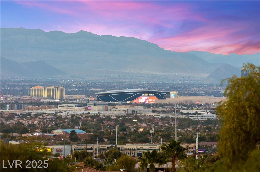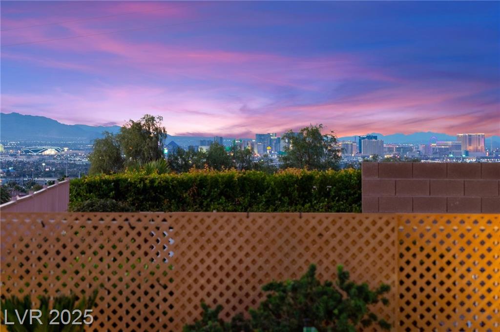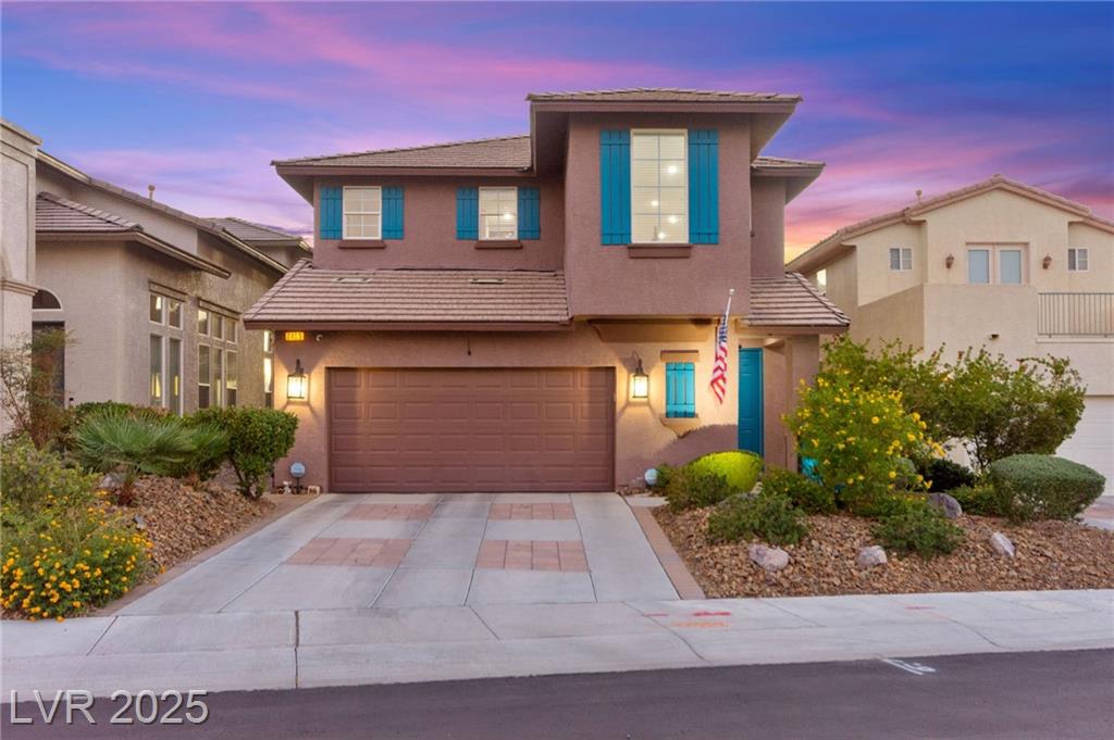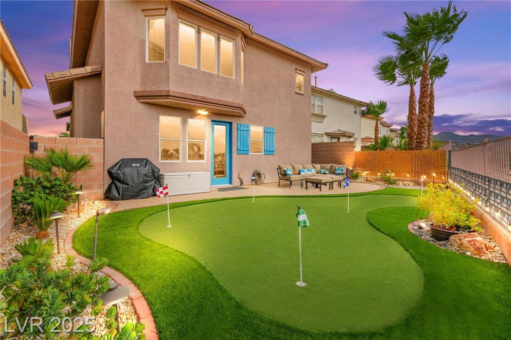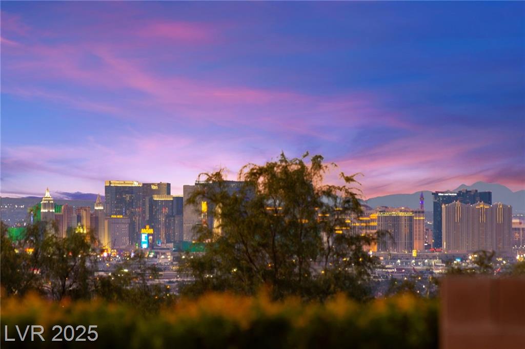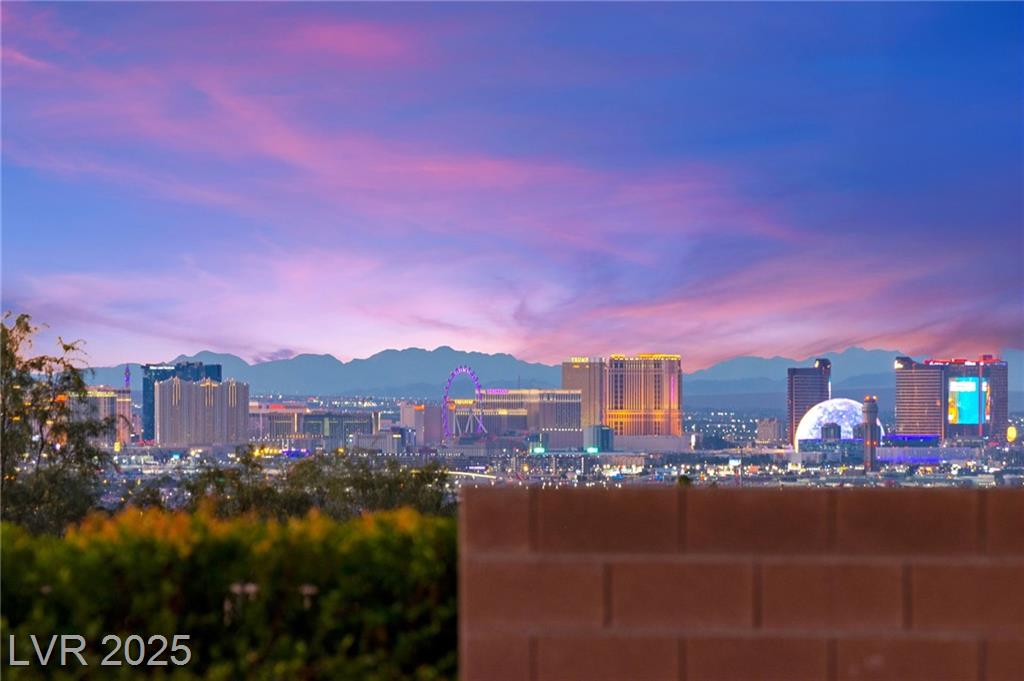 Step into this gorgeous home showcasing spectacular Strip, city, and mountain views from inside and out. Located in a quiet gated community with no rear neighbors, this updated residence blends luxury, comfort, and functionality. Enjoy primary suites on both the main and upper levels, with every bedroom featuring its own private en-suite bath—ideal for guests or multigenerational living. The open entryway leads to a two-story living room, spacious great room with fireplace, and a gourmet kitchen with granite countertops, stainless steel appliances, and toffee maple cabinets. Updates include new flooring, carpet, and fresh interior and exterior paint. High 9-foot ceilings add to the airy feel. The low-maintenance backyard offers a putting green, 12V landscape lighting, and unobstructed sunset views toward Red Rock and Mount Charleston. A private courtyard, epoxy-coated garage floor, and HOA-maintained front yard complete this exceptional home.