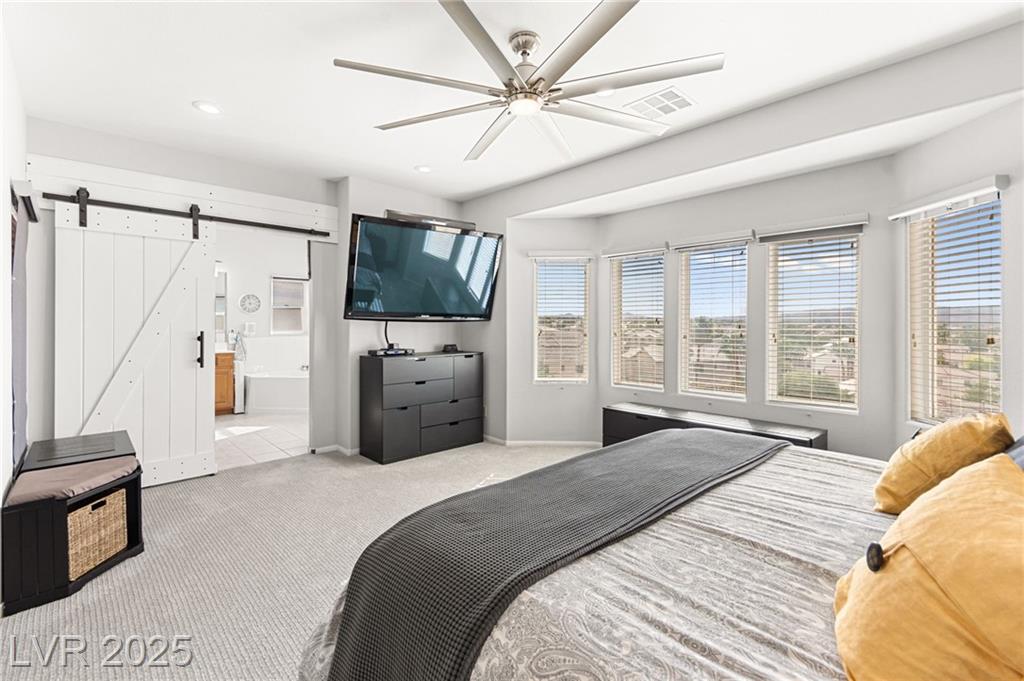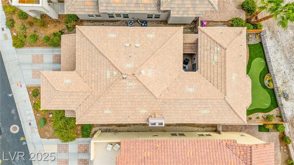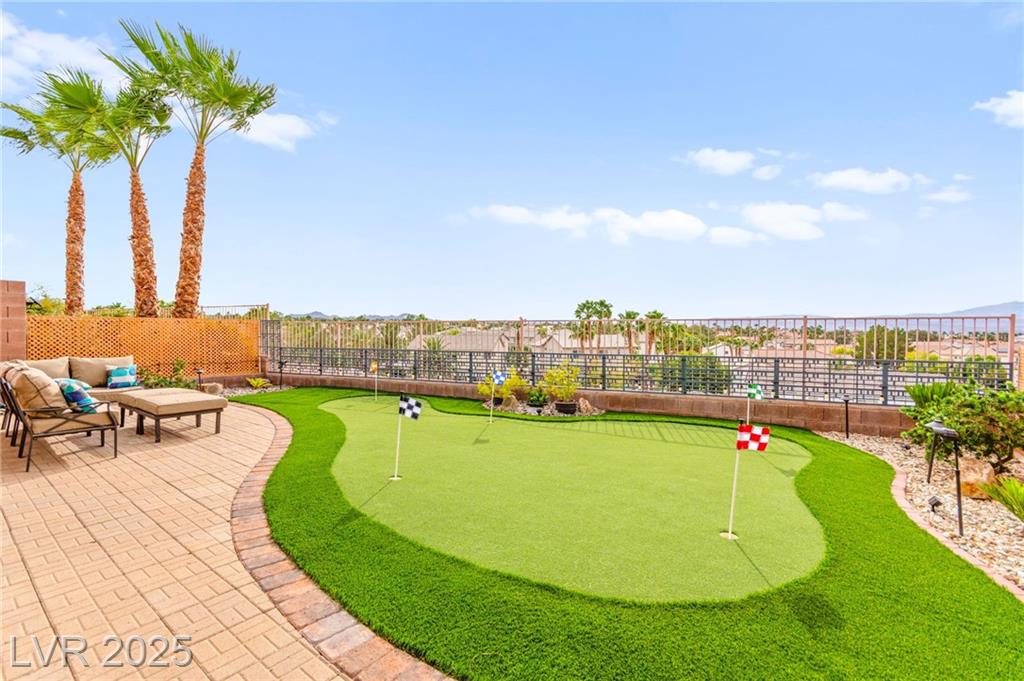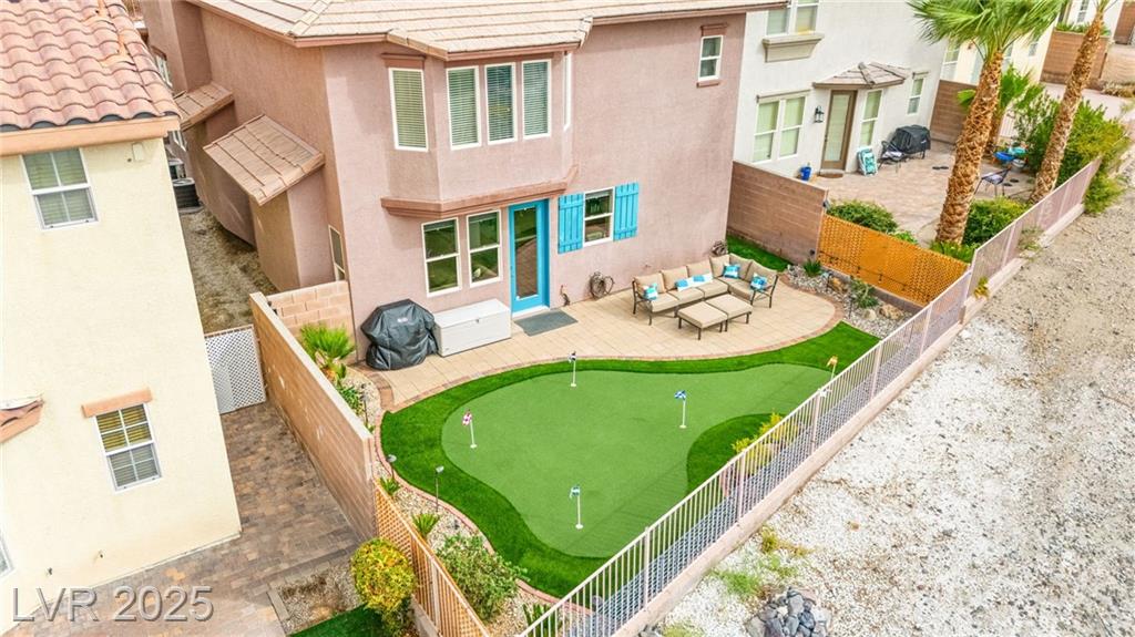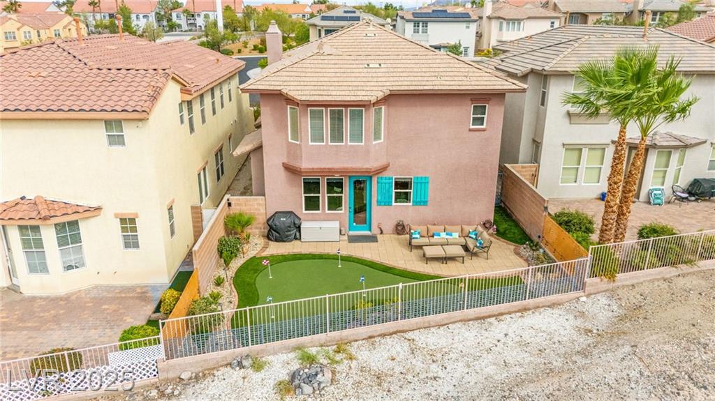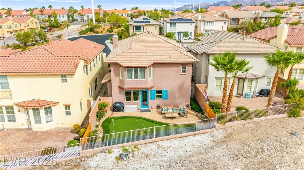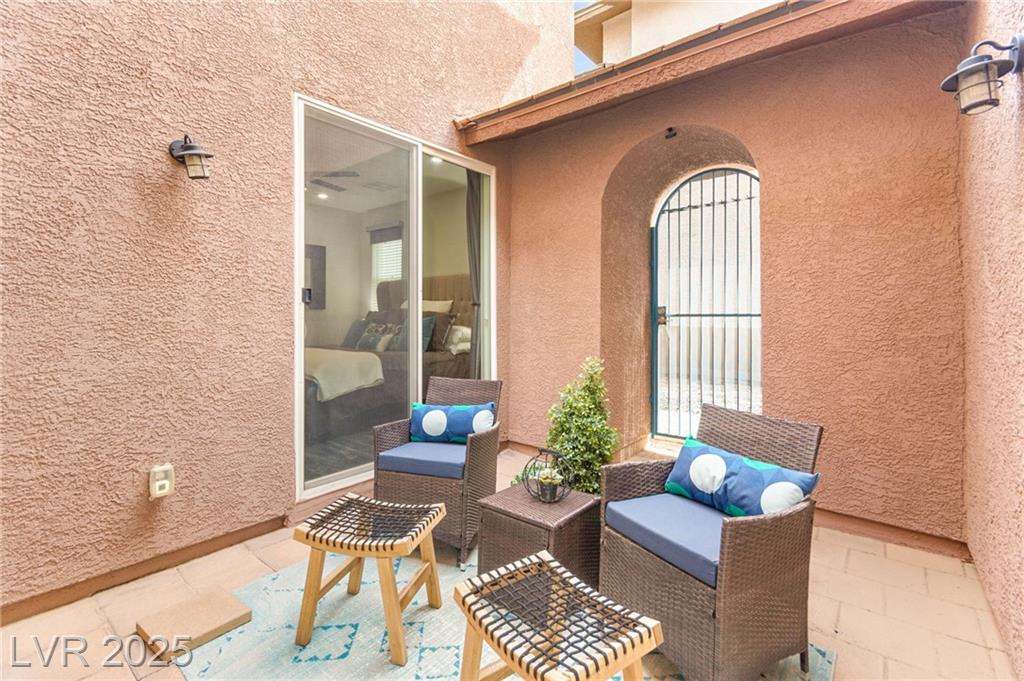 Step into this gorgeous home showcasing spectacular Strip, city, and mountain views from inside and out. Located in a quiet gated community with no rear neighbors, this updated residence blends luxury, comfort, and functionality. Enjoy primary suites on both the main and upper levels, with every bedroom featuring its own private en-suite bath—ideal for guests or multigenerational living. The open entryway leads to a two-story living room, spacious great room with fireplace, and a gourmet kitchen with granite countertops, stainless steel appliances, and toffee maple cabinets. Updates include new flooring, carpet, and fresh interior and exterior paint. High 9-foot ceilings add to the airy feel. The low-maintenance backyard offers a putting green, 12V landscape lighting, and unobstructed sunset views toward Red Rock and Mount Charleston. A private courtyard, epoxy-coated garage floor, and HOA-maintained front yard complete this exceptional home.