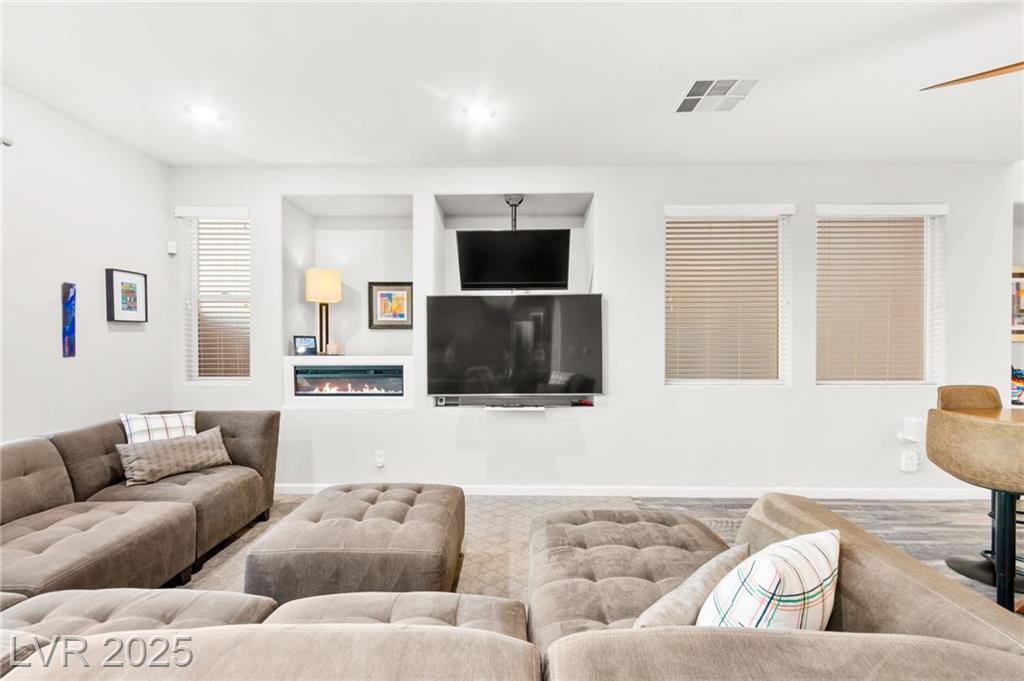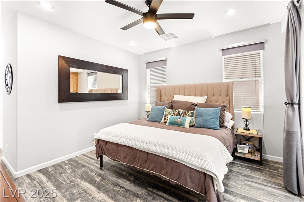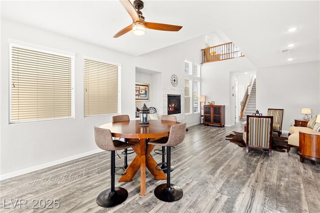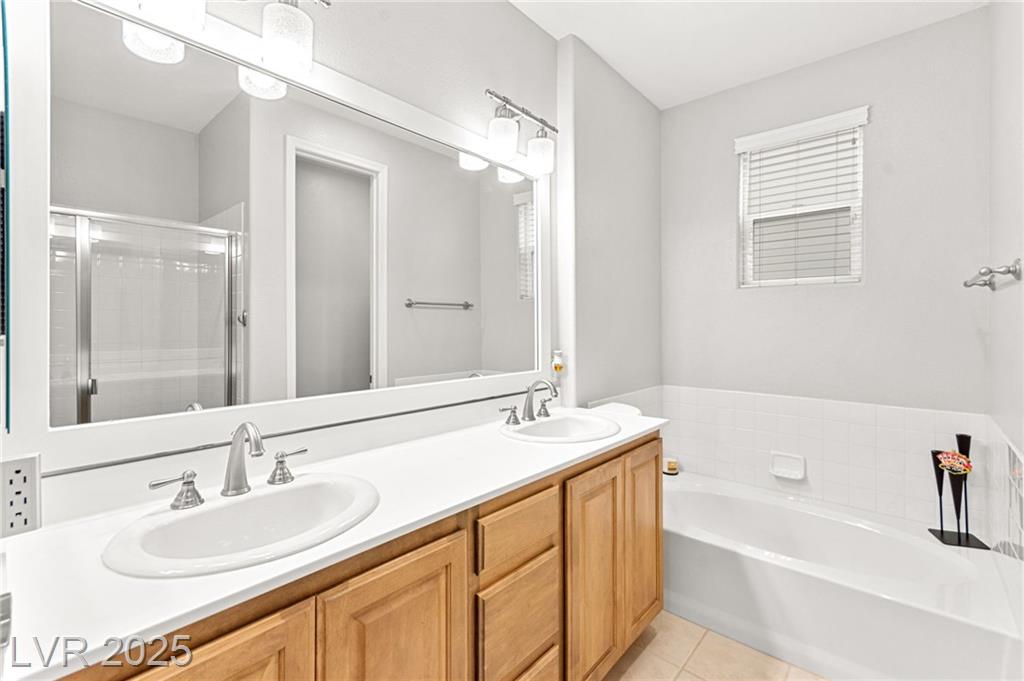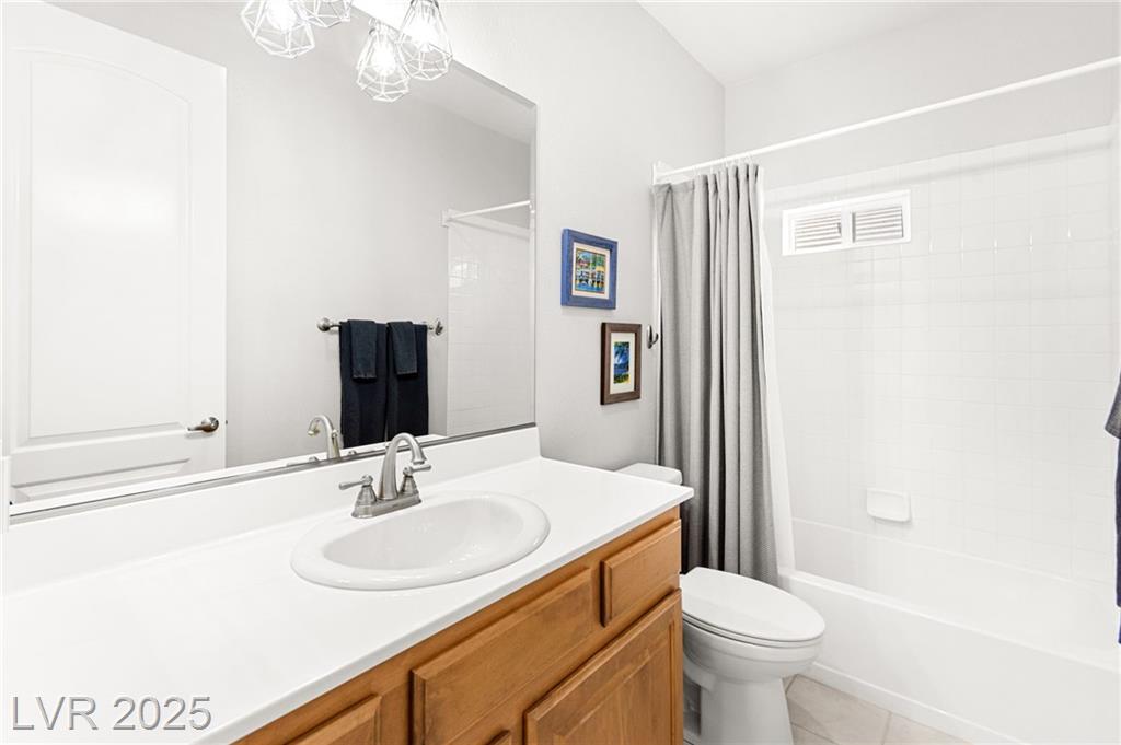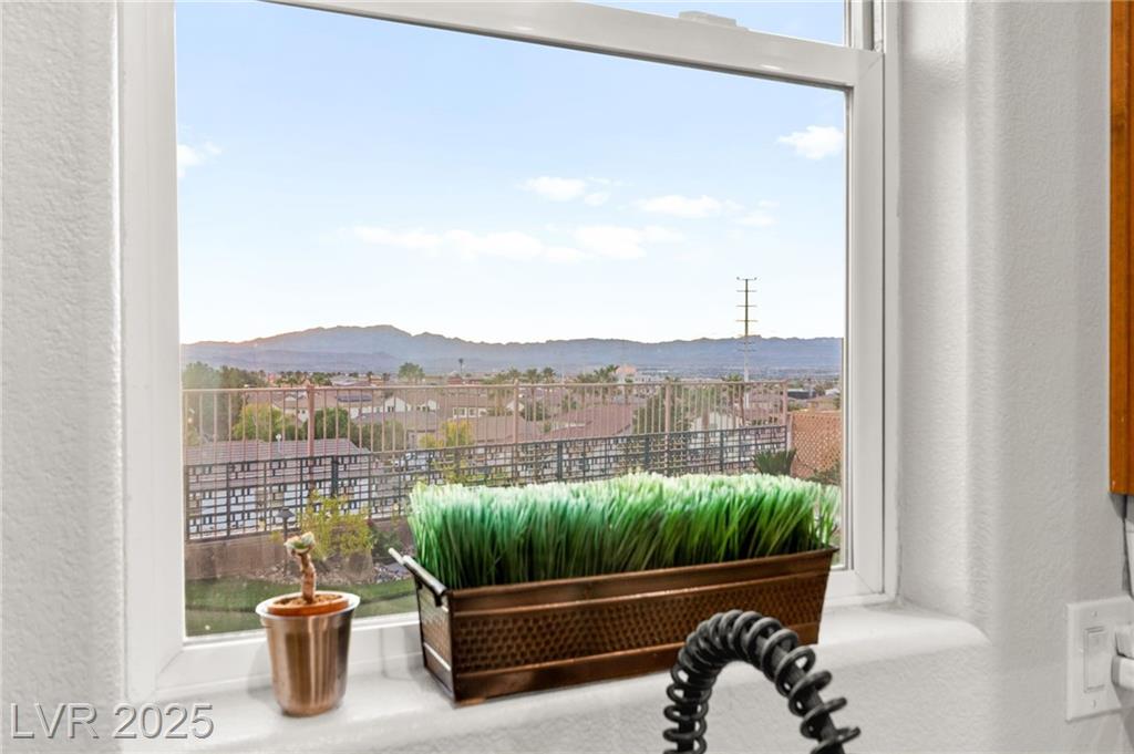 Step into this gorgeous home showcasing spectacular Strip, city, and mountain views from inside and out. Located in a quiet gated community with no rear neighbors, this updated residence blends luxury, comfort, and functionality. Enjoy primary suites on both the main and upper levels, with every bedroom featuring its own private en-suite bath—ideal for guests or multigenerational living. The open entryway leads to a two-story living room, spacious great room with fireplace, and a gourmet kitchen with granite countertops, stainless steel appliances, and toffee maple cabinets. Updates include new flooring, carpet, and fresh interior and exterior paint. High 9-foot ceilings add to the airy feel. The low-maintenance backyard offers a putting green, 12V landscape lighting, and unobstructed sunset views toward Red Rock and Mount Charleston. A private courtyard, epoxy-coated garage floor, and HOA-maintained front yard complete this exceptional home.