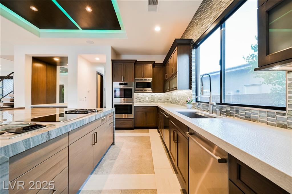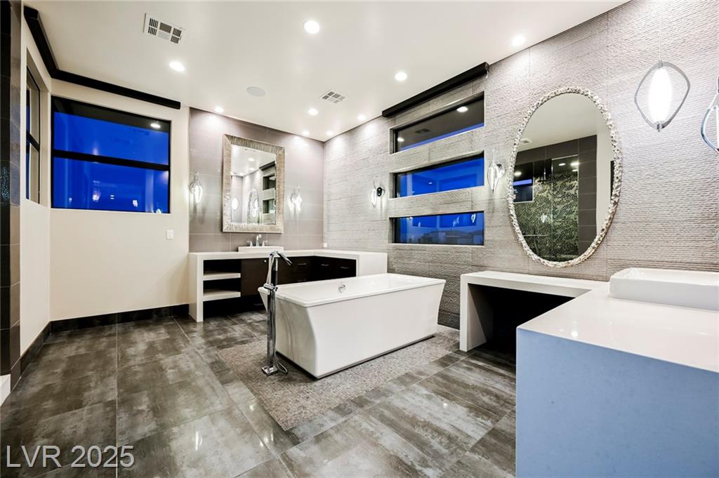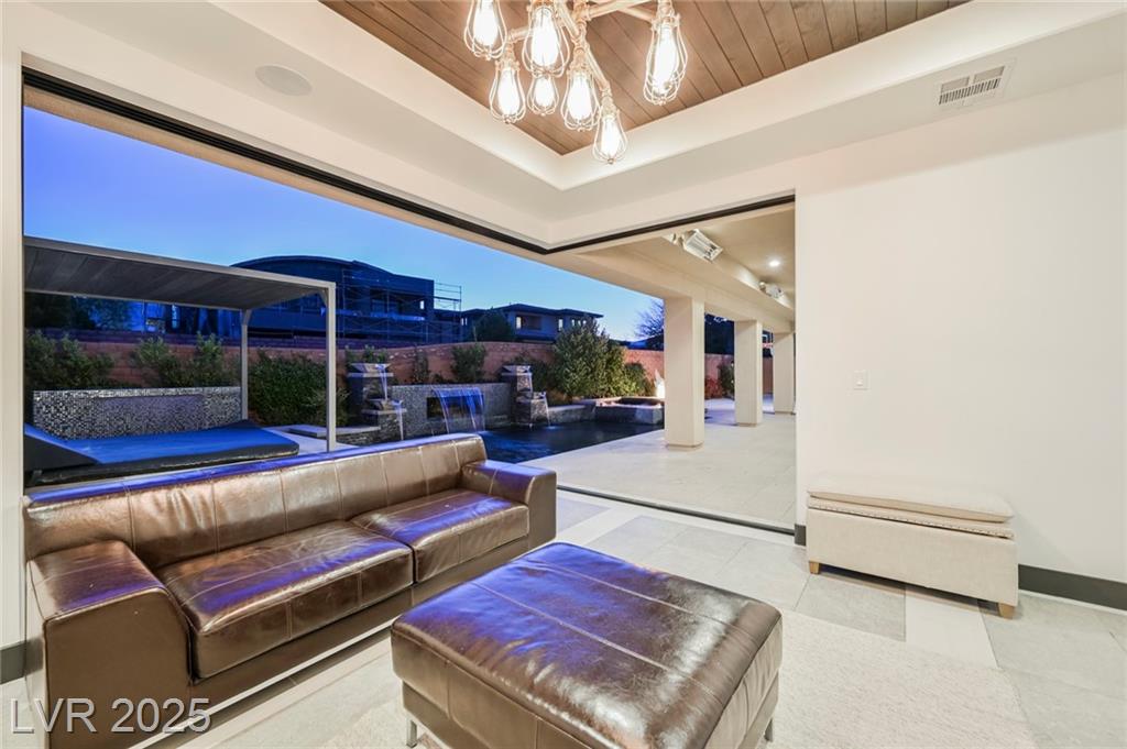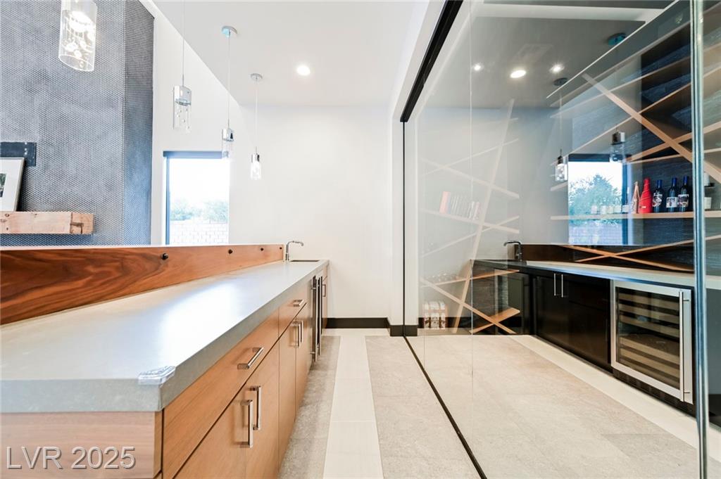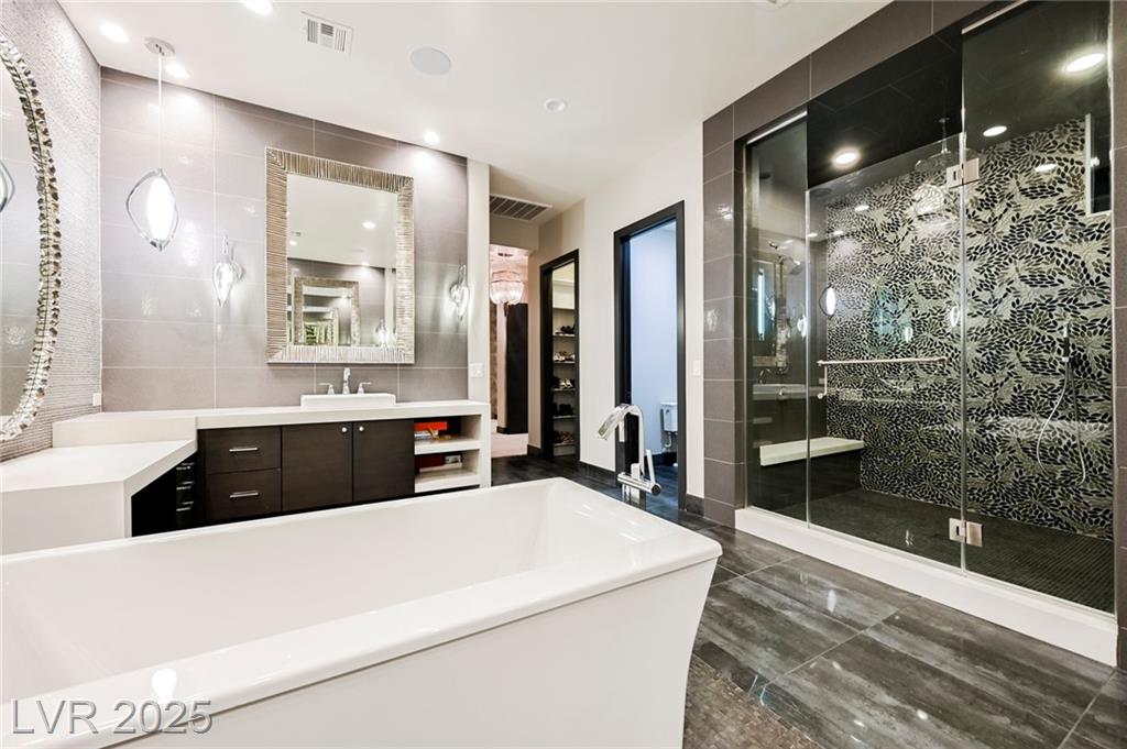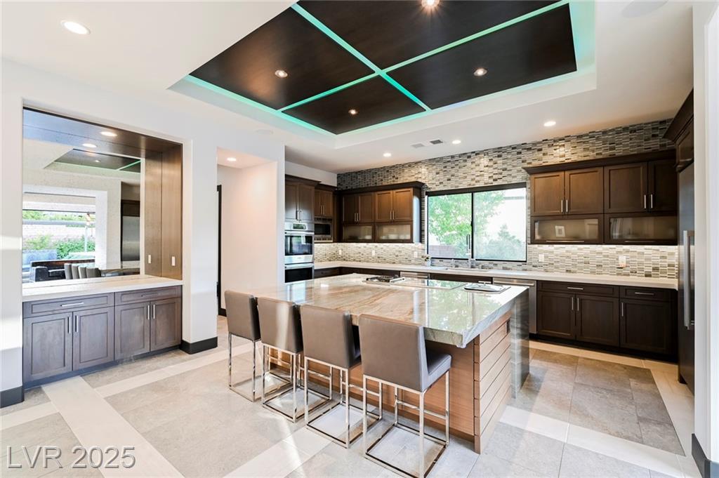 The crown jewel of Sterling Ridge in The Ridges, this architectural masterpiece spares no expense, showcasing impeccable designer finishes at every turn. The gourmet kitchen is a showstopper, featuring a statement center island, top-tier Sub-Zero & Wolf appliances, solid stone countertops, center Island, and sleek European cabinetry. A bright, open great room with soaring double-height ceilings and pocketing glass walls creates the ultimate indoor/outdoor lifestyle. Entertain in style with a full wet bar with seating five, a climate-controlled wine cellar, and a striking floating staircase framed by tranquil fountains. The primary suite is complete with a spacious retreat, lavish bath, dual closets, and a private balcony. The oversized yard boasts a resort-style pool, spa, summer kitchen, covered patios, sports court, and extended driveway for extra parking. This is the rare blend of elegance, comfort, and showpiece design in one of Las Vegas’ most prestigious guard-gated communities.