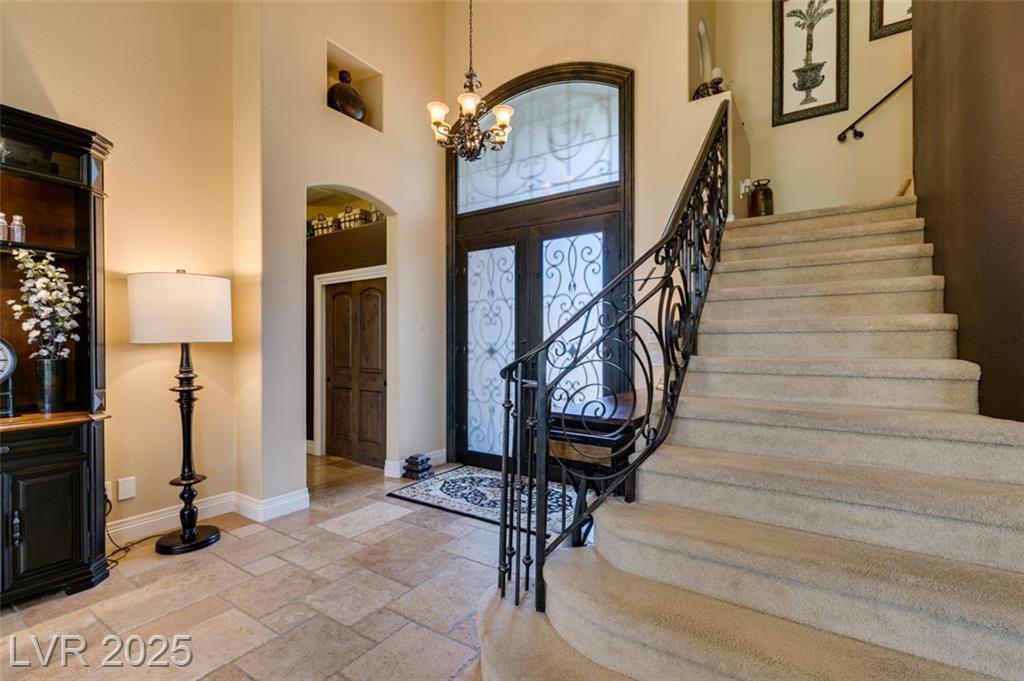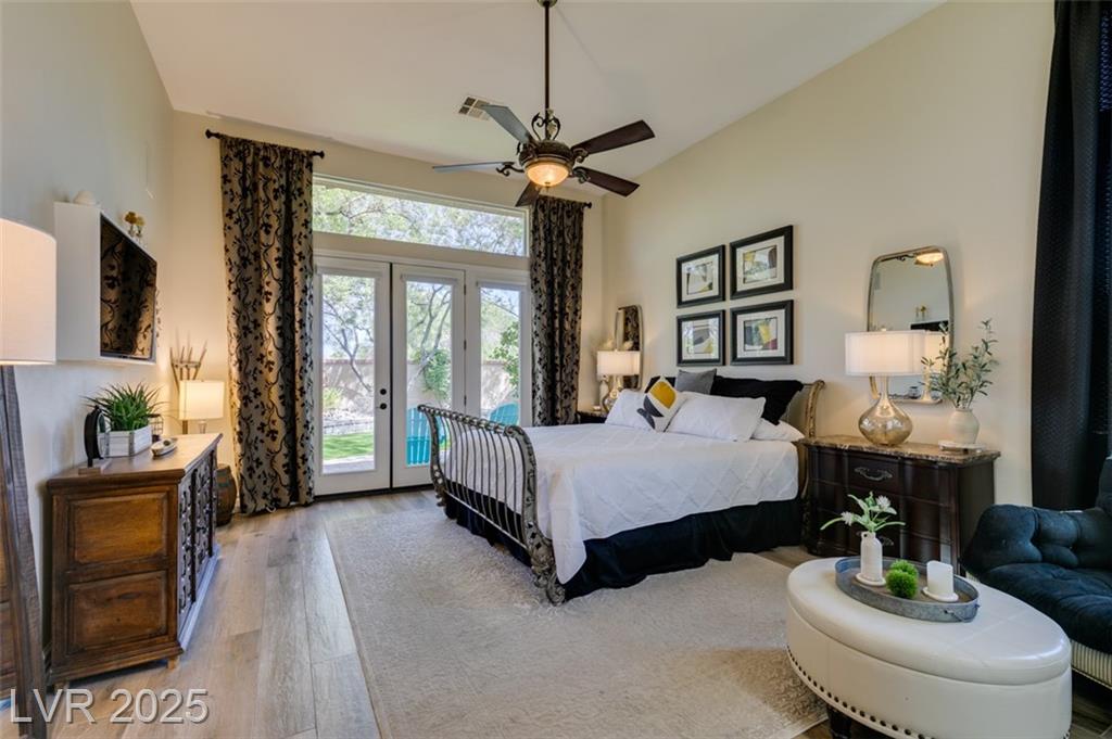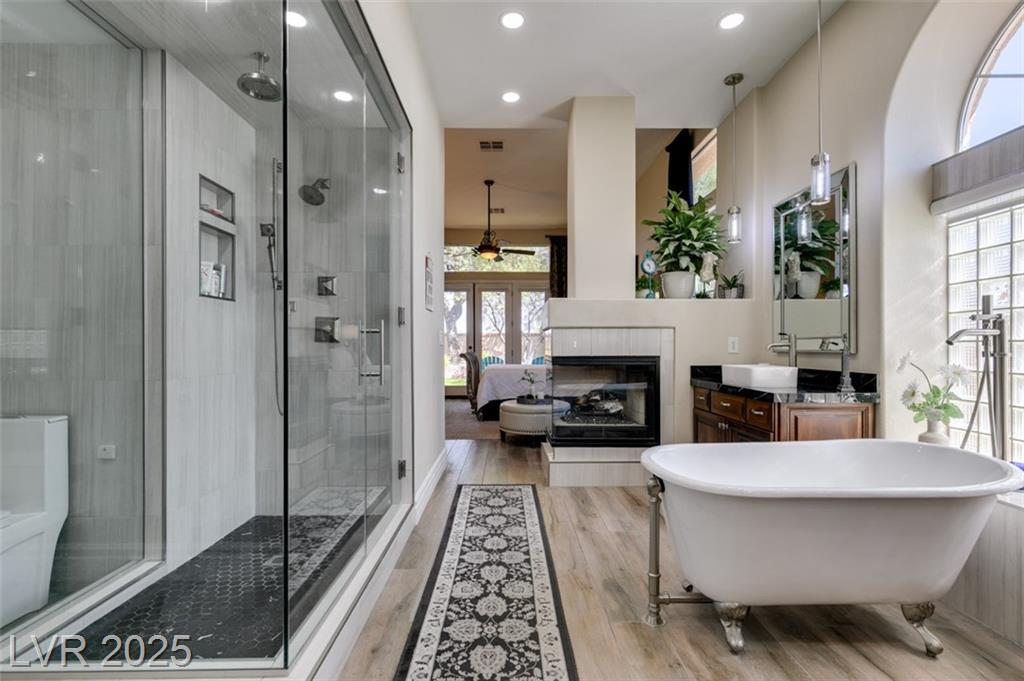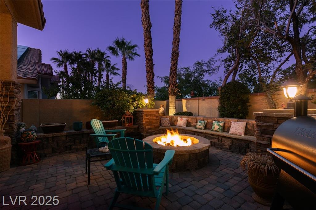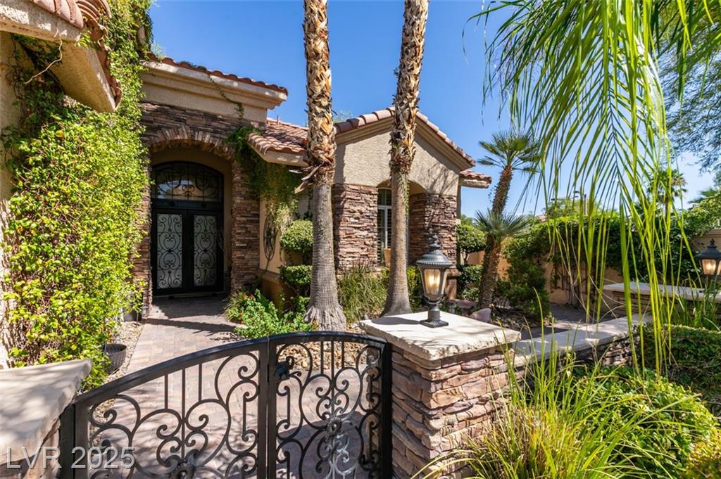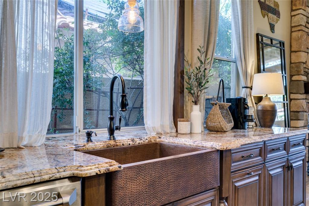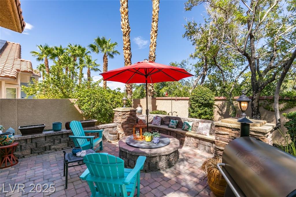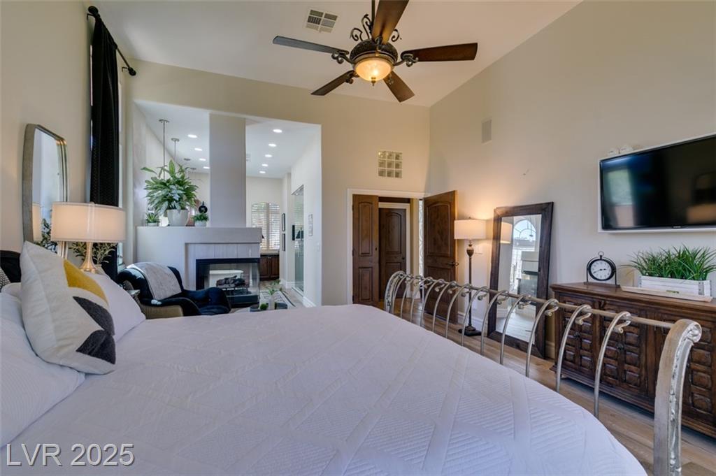 SUMMERLIN GEM IN THE TRAILS! This home features $$$ in Upgrades. Exceptional curb appeal welcomes you w/elegant front courtyard & beautifully manicured landscaping. Step through impressive custom-iron-and-glass double doors into a home filled w/refined upgrades. The interior showcases upgraded flooring, solid-core knotty alder doors, and a custom bar w/wine fridge. The chef's kitchen is a true highlight, featuring artisan cabinetry w/hidden spice racks, a decorative range hood, hammered copper sink, granite counters, GE Monogram SS appliances, and a pot filler. The downstairs primary suite offers a private retreat w/French doors leading outdoors, a three-way fireplace, an oversized peninsula-style rain shower w/frameless glass, and a built-in closet. Upstairs, you will find 2 guest bdrms, an enclosed glass loft, and a custom bath w/a walk-in shower. The backyard oasis is designed for relaxation and entertaining, complete w/ a lush landscaping, patio, a cozy firepit, and built-in BBQ.