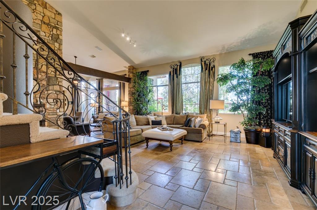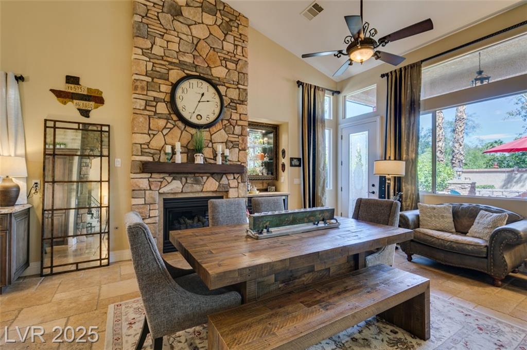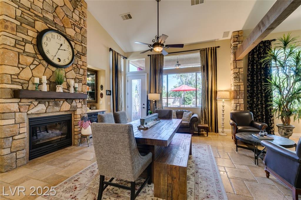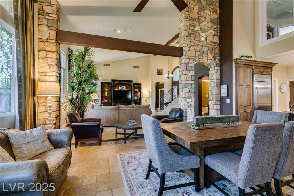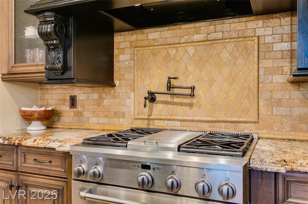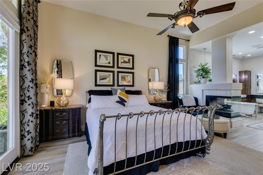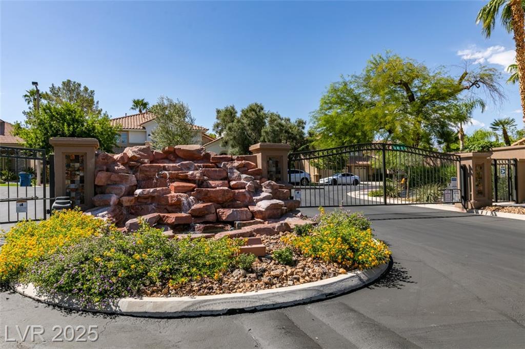 SUMMERLIN GEM IN THE TRAILS! This home features $$$ in Upgrades. Exceptional curb appeal welcomes you w/elegant front courtyard & beautifully manicured landscaping. Step through impressive custom-iron-and-glass double doors into a home filled w/refined upgrades. The interior showcases upgraded flooring, solid-core knotty alder doors, and a custom bar w/wine fridge. The chef's kitchen is a true highlight, featuring artisan cabinetry w/hidden spice racks, a decorative range hood, hammered copper sink, granite counters, GE Monogram SS appliances, and a pot filler. The downstairs primary suite offers a private retreat w/French doors leading outdoors, a three-way fireplace, an oversized peninsula-style rain shower w/frameless glass, and a built-in closet. Upstairs, you will find 2 guest bdrms, an enclosed glass loft, and a custom bath w/a walk-in shower. The backyard oasis is designed for relaxation and entertaining, complete w/ a lush landscaping, patio, a cozy firepit, and built-in BBQ.
