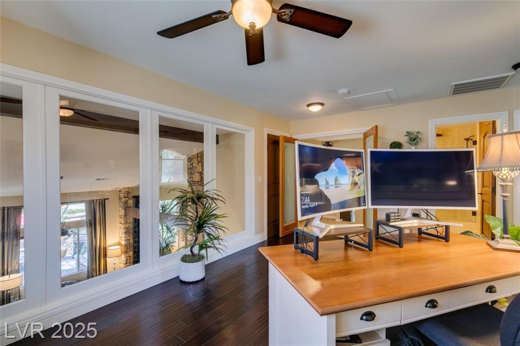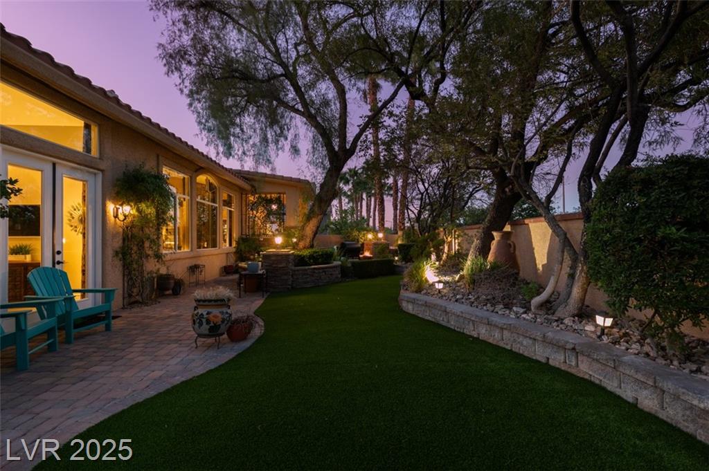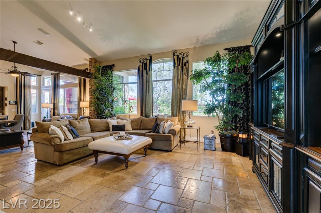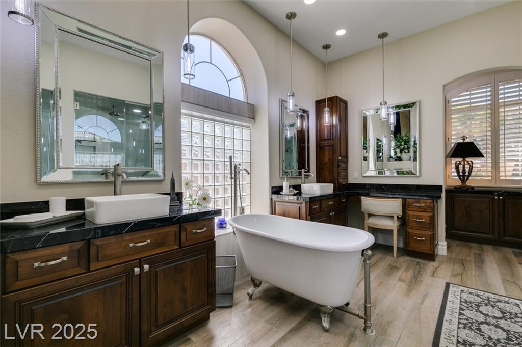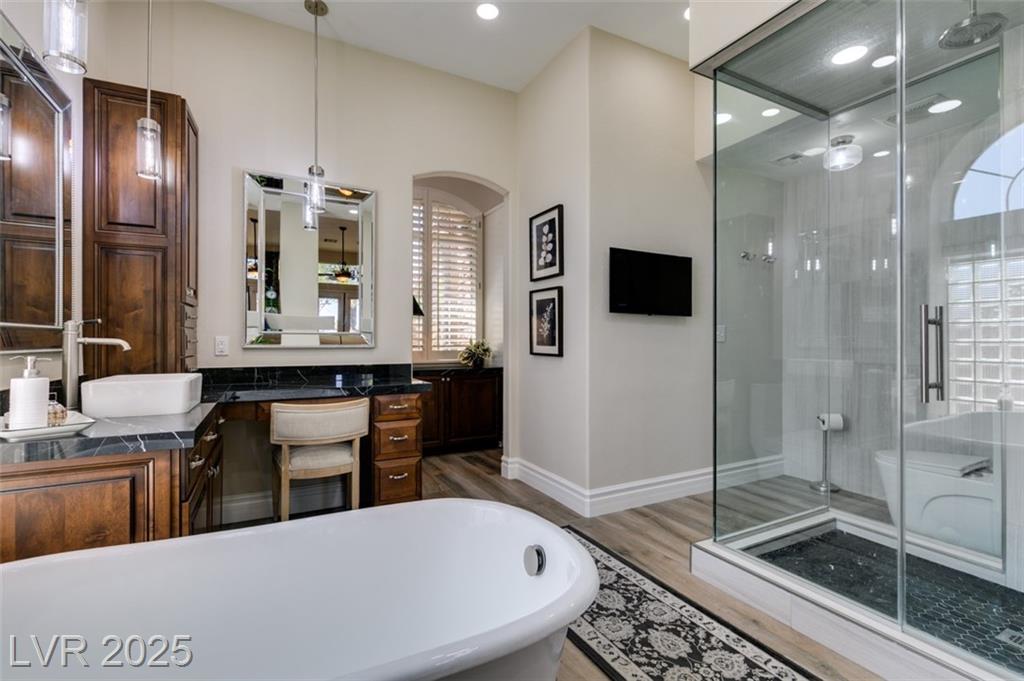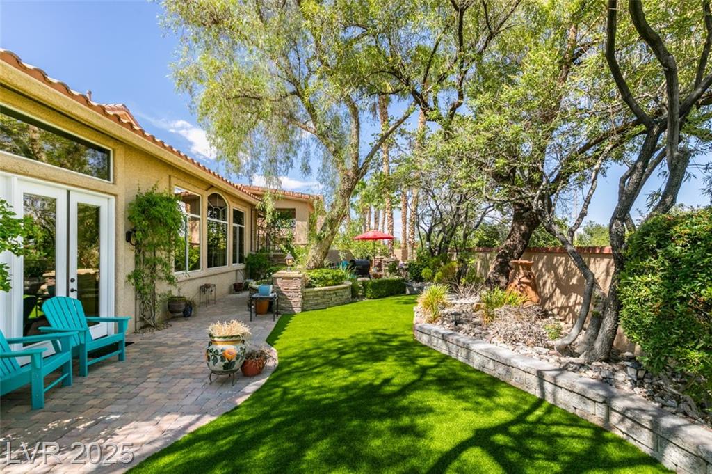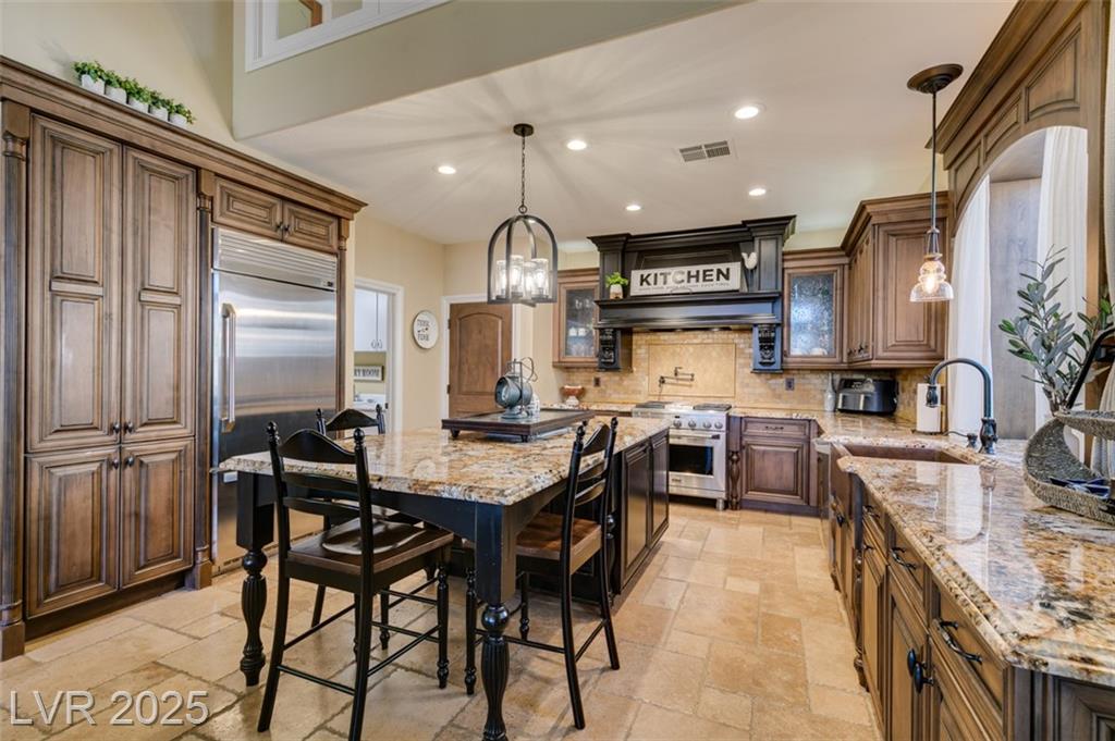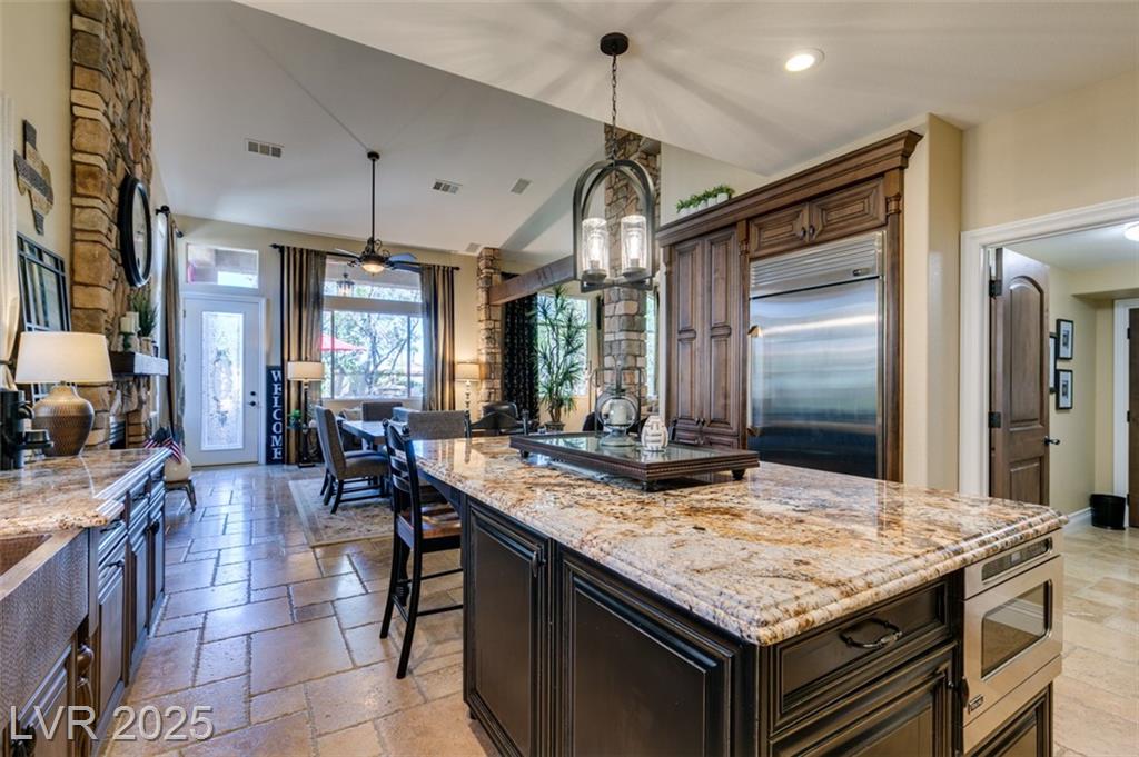 SUMMERLIN GEM IN THE TRAILS! This home features $$$ in Upgrades. Exceptional curb appeal welcomes you w/elegant front courtyard & beautifully manicured landscaping. Step through impressive custom-iron-and-glass double doors into a home filled w/refined upgrades. The interior showcases upgraded flooring, solid-core knotty alder doors, and a custom bar w/wine fridge. The chef's kitchen is a true highlight, featuring artisan cabinetry w/hidden spice racks, a decorative range hood, hammered copper sink, granite counters, GE Monogram SS appliances, and a pot filler. The downstairs primary suite offers a private retreat w/French doors leading outdoors, a three-way fireplace, an oversized peninsula-style rain shower w/frameless glass, and a built-in closet. Upstairs, you will find 2 guest bdrms, an enclosed glass loft, and a custom bath w/a walk-in shower. The backyard oasis is designed for relaxation and entertaining, complete w/ a lush landscaping, patio, a cozy firepit, and built-in BBQ.