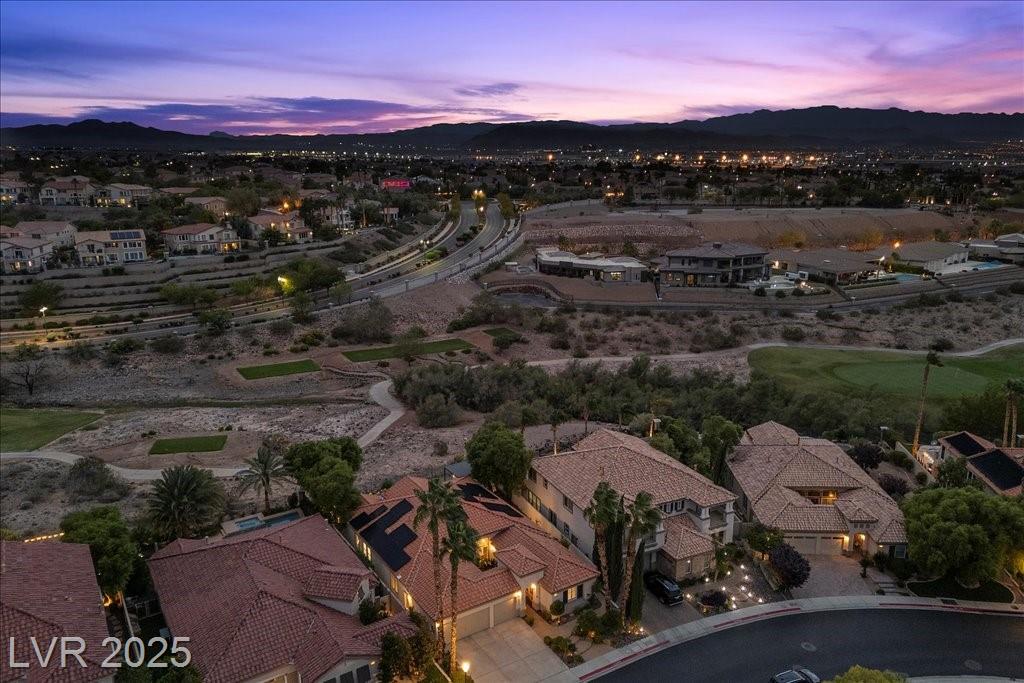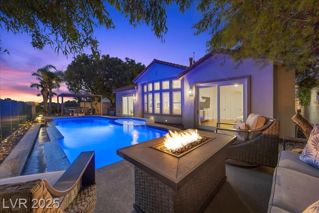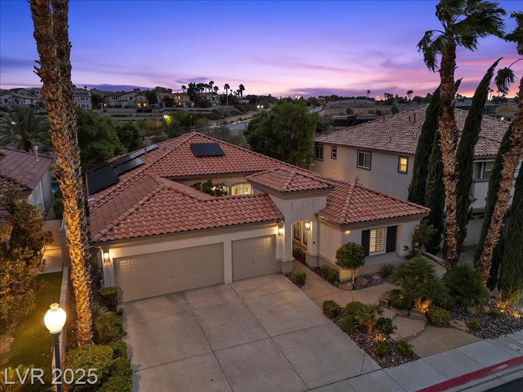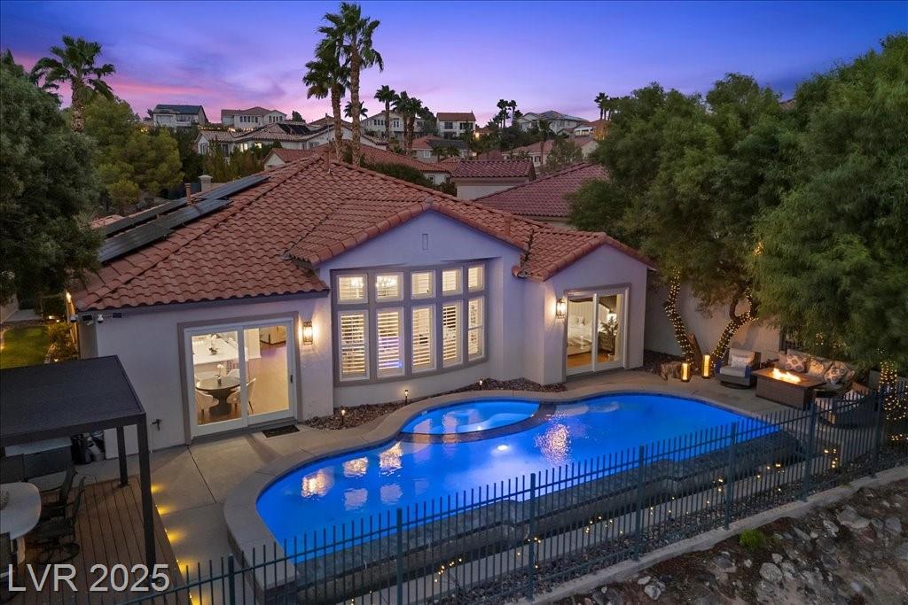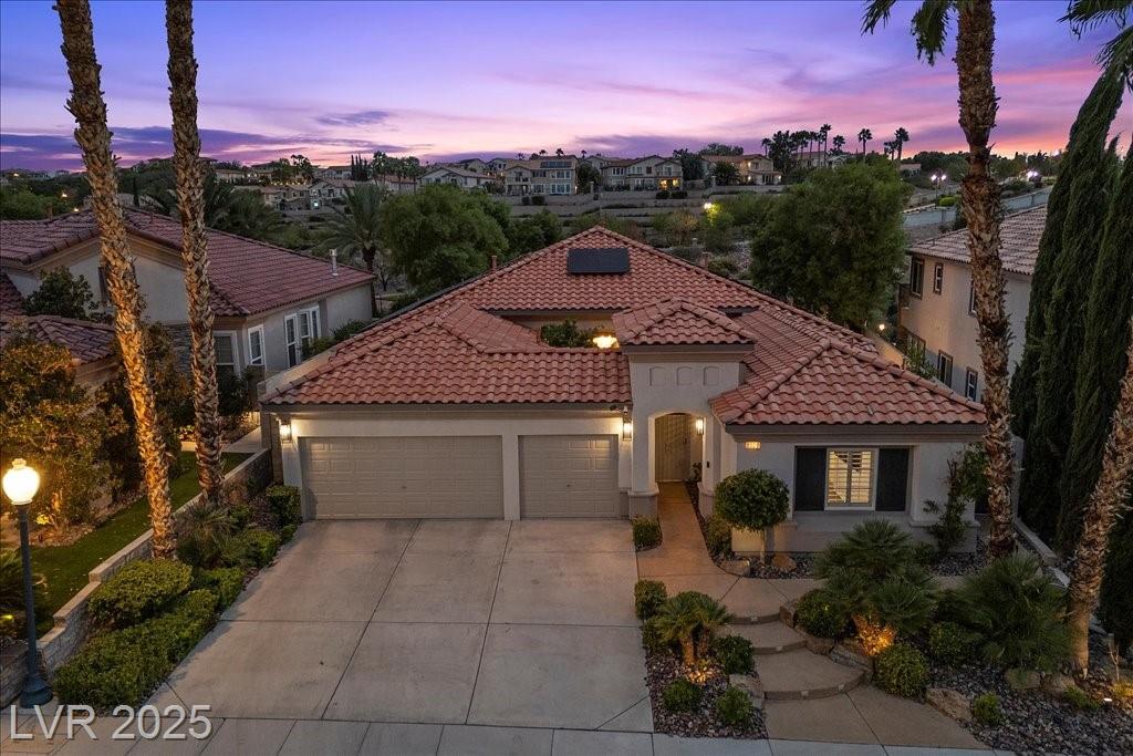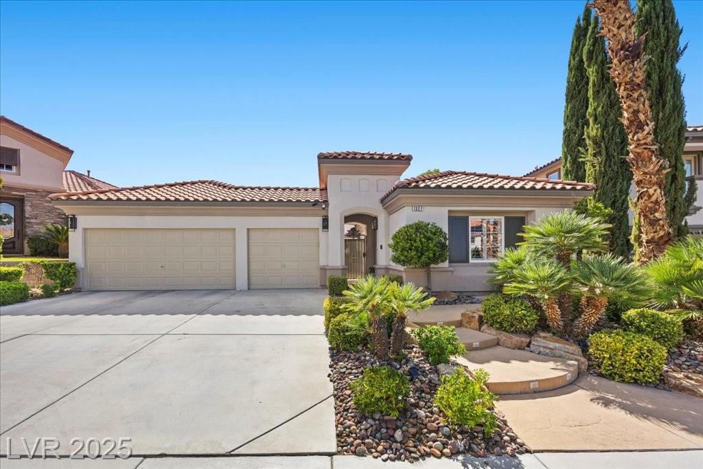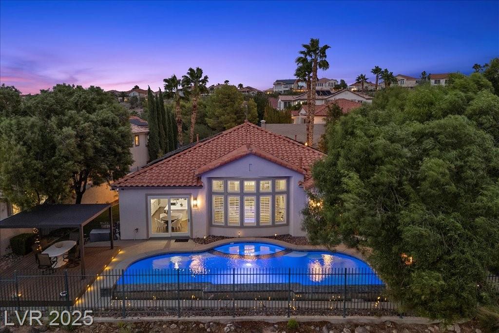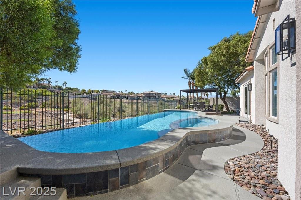 Guard-gated Renaissance at Seven Hills luxury! Elegant single-story home on the Rio Secco Golf Course with 12-ft ceilings, 3 beds + den, and 2.5 baths. Enter through a sunlit courtyard with French doors into open living spaces featuring two floor-to-ceiling gas fireplaces and plantation shutters. The gourmet kitchen offers granite counters, island, custom backsplash, and stainless appliances. The oversized primary suite has direct backyard access and a spa bath with dual vanities, soaking tub, walk-in shower, and closet. Step outside through new Andersen sliders to a resort-style backyard with infinity-edge pool & spa, new heating system, new deck, custom cabana, and mature trees framing breathtaking golf course & mountain views. Upgrades include two A/C units (one new) and whole-home water filtration. Minutes from The District at Green Valley Ranch and top schools—move-in ready elegance!