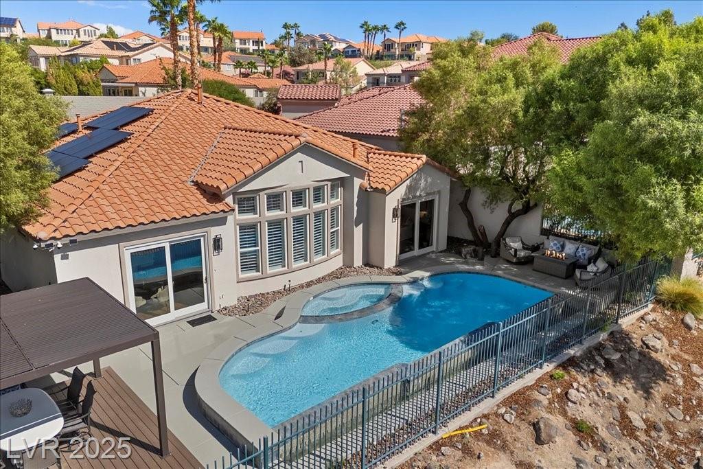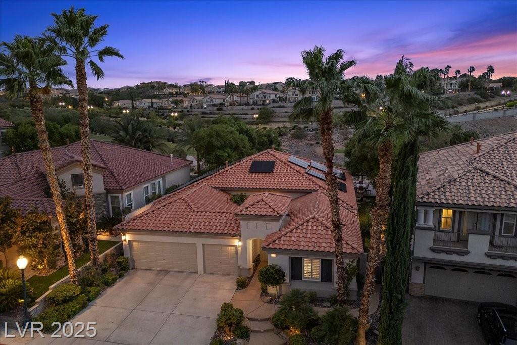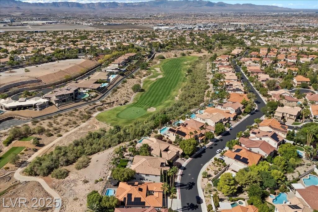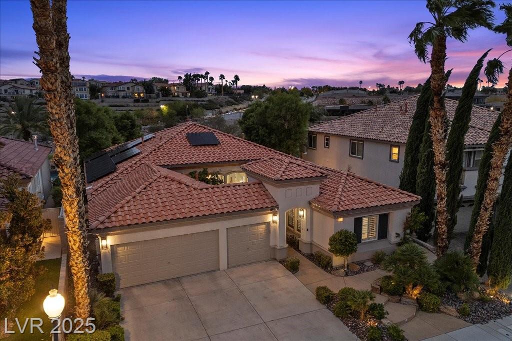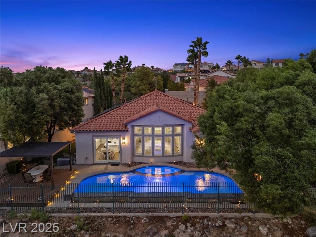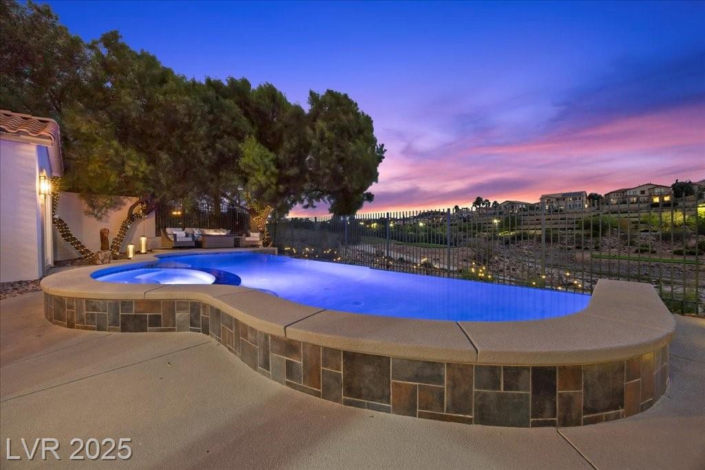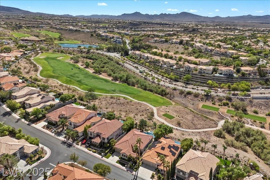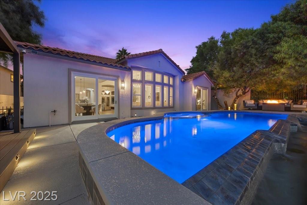 Guard-gated Renaissance at Seven Hills luxury! Elegant single-story home on the Rio Secco Golf Course with 12-ft ceilings, 3 beds + den, and 2.5 baths. Enter through a sunlit courtyard with French doors into open living spaces featuring two floor-to-ceiling gas fireplaces and plantation shutters. The gourmet kitchen offers granite counters, island, custom backsplash, and stainless appliances. The oversized primary suite has direct backyard access and a spa bath with dual vanities, soaking tub, walk-in shower, and closet. Step outside through new Andersen sliders to a resort-style backyard with infinity-edge pool & spa, new heating system, new deck, custom cabana, and mature trees framing breathtaking golf course & mountain views. Upgrades include two A/C units (one new) and whole-home water filtration. Minutes from The District at Green Valley Ranch and top schools—move-in ready elegance!