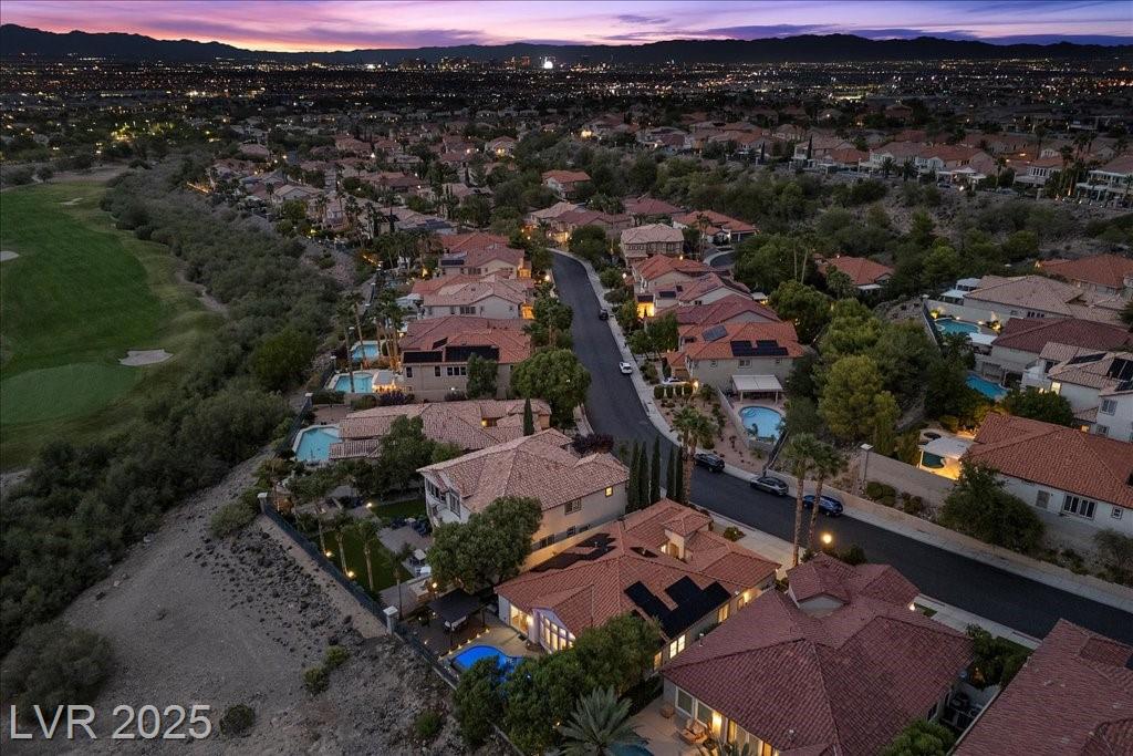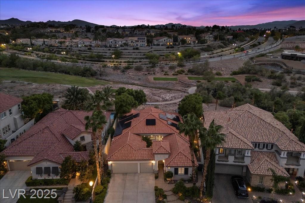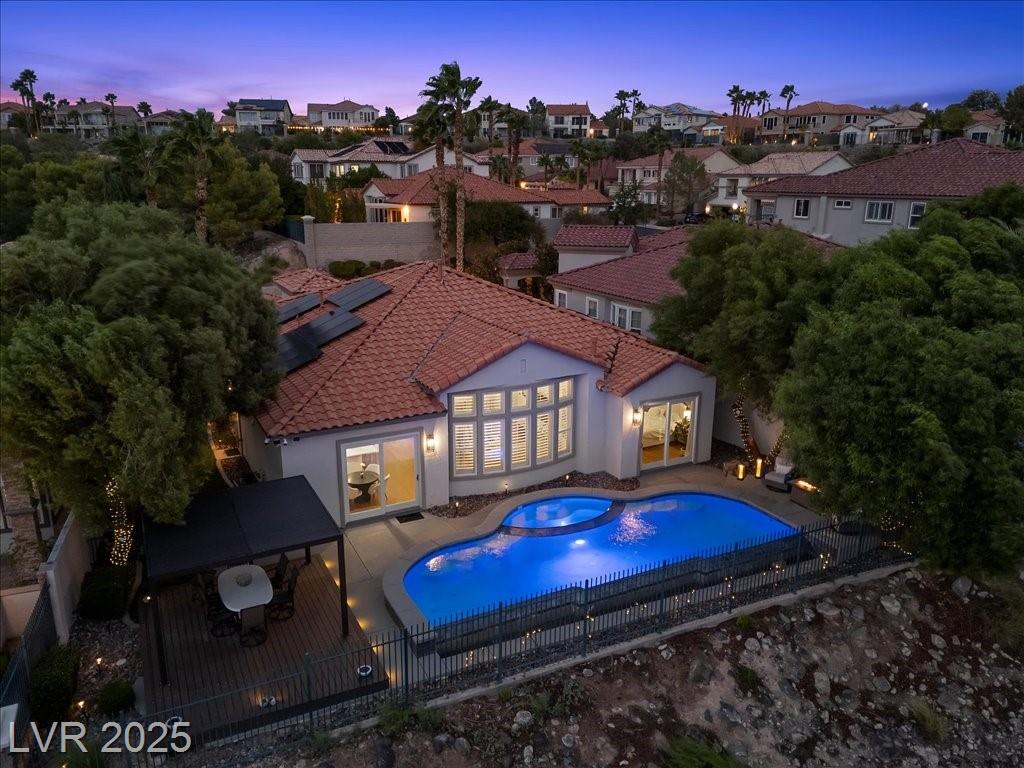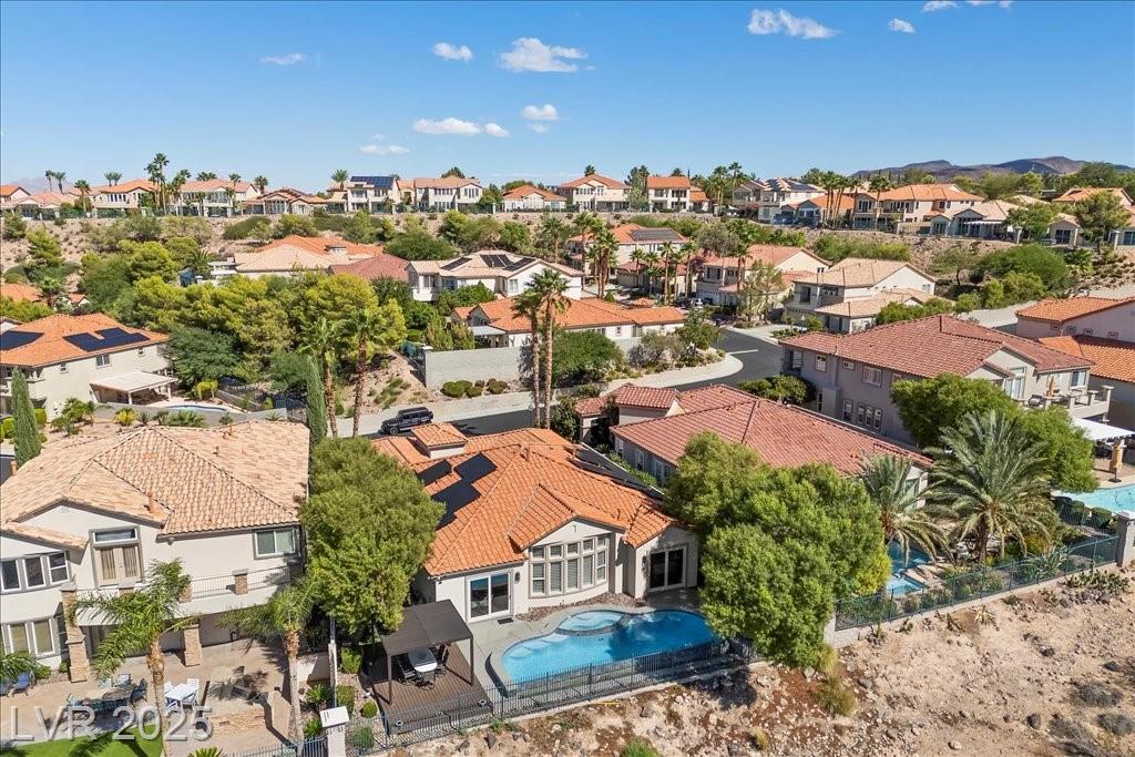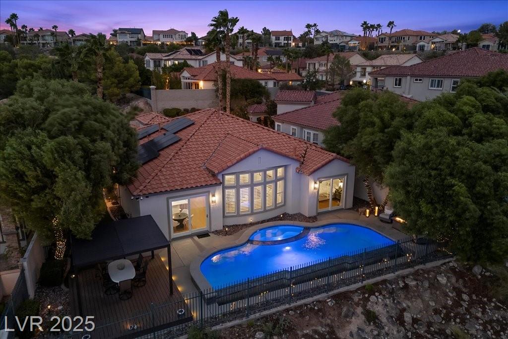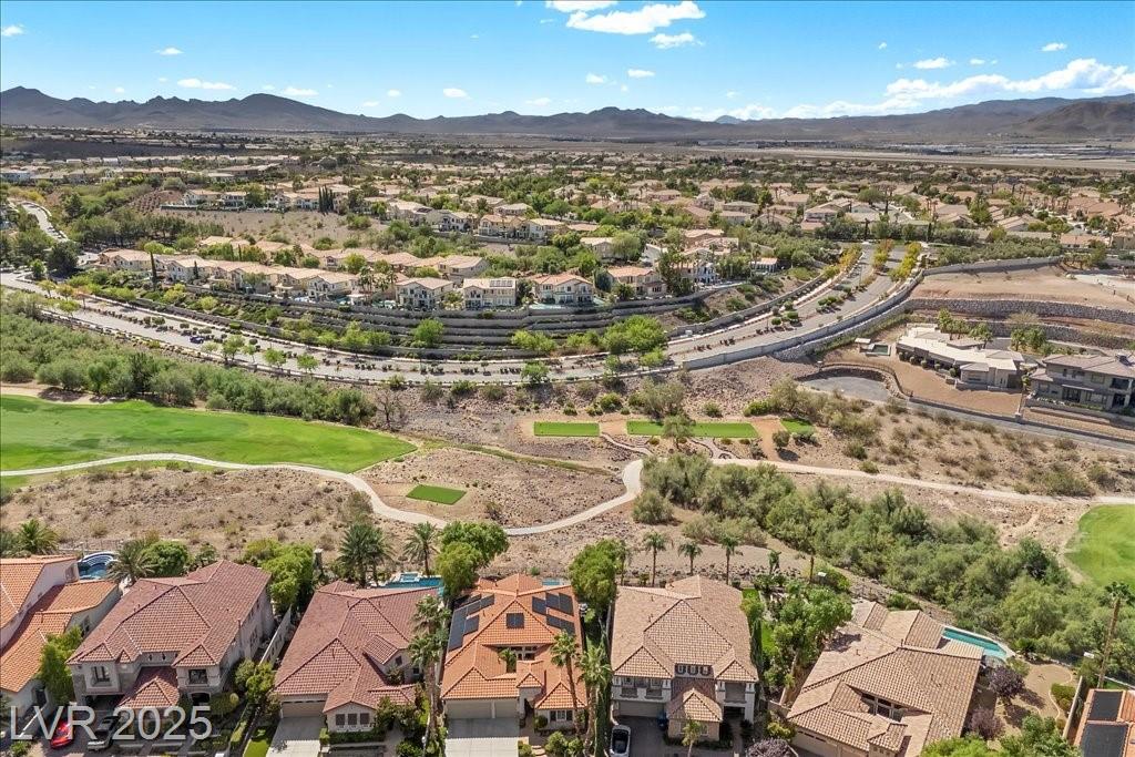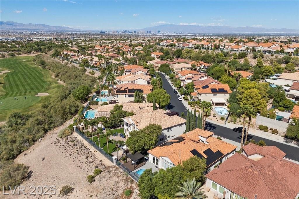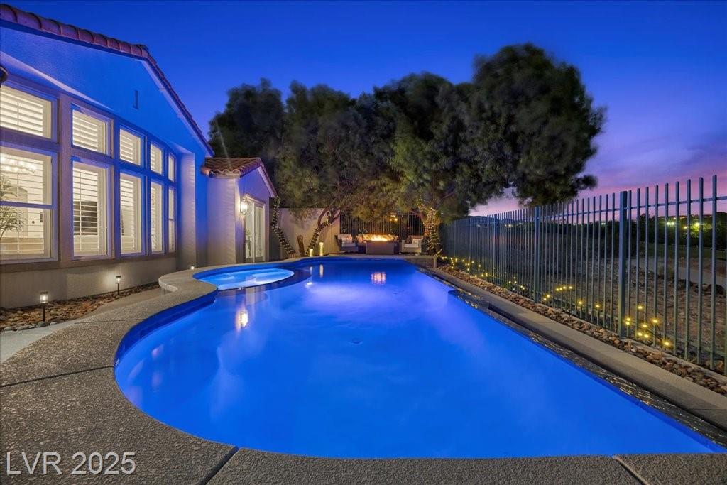 Guard-gated Renaissance at Seven Hills luxury! Elegant single-story home on the Rio Secco Golf Course with 12-ft ceilings, 3 beds + den, and 2.5 baths. Enter through a sunlit courtyard with French doors into open living spaces featuring two floor-to-ceiling gas fireplaces and plantation shutters. The gourmet kitchen offers granite counters, island, custom backsplash, and stainless appliances. The oversized primary suite has direct backyard access and a spa bath with dual vanities, soaking tub, walk-in shower, and closet. Step outside through new Andersen sliders to a resort-style backyard with infinity-edge pool & spa, new heating system, new deck, custom cabana, and mature trees framing breathtaking golf course & mountain views. Upgrades include two A/C units (one new) and whole-home water filtration. Minutes from The District at Green Valley Ranch and top schools—move-in ready elegance!