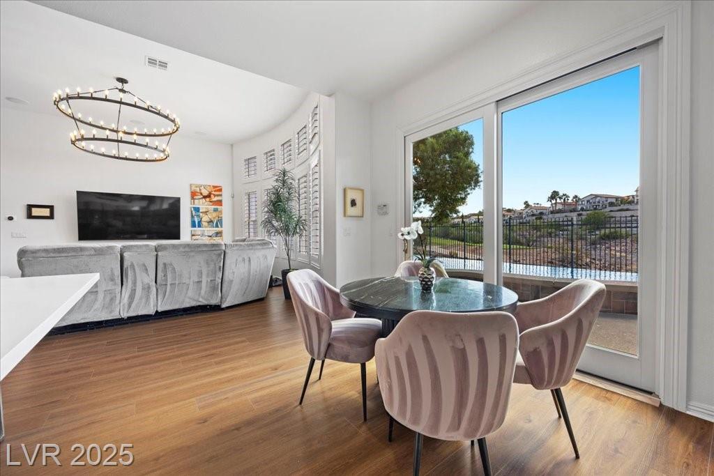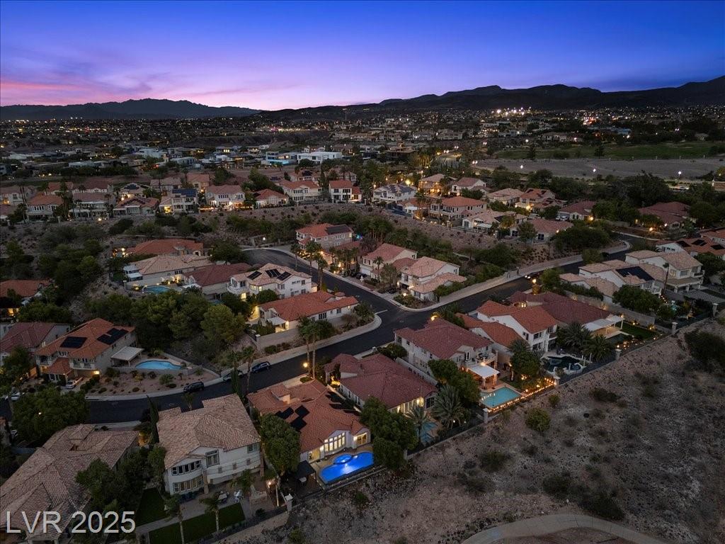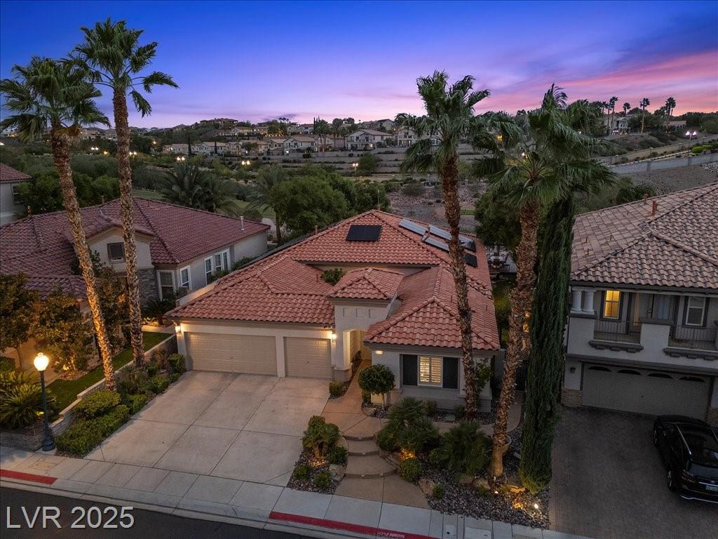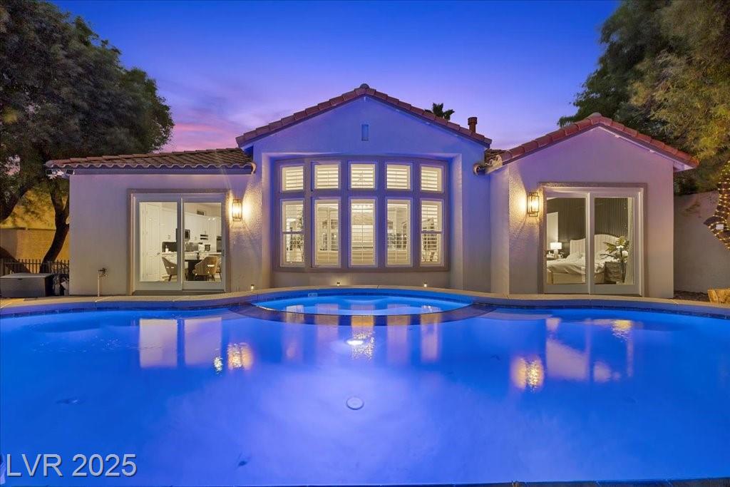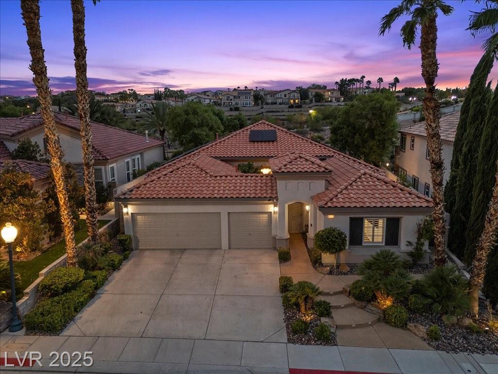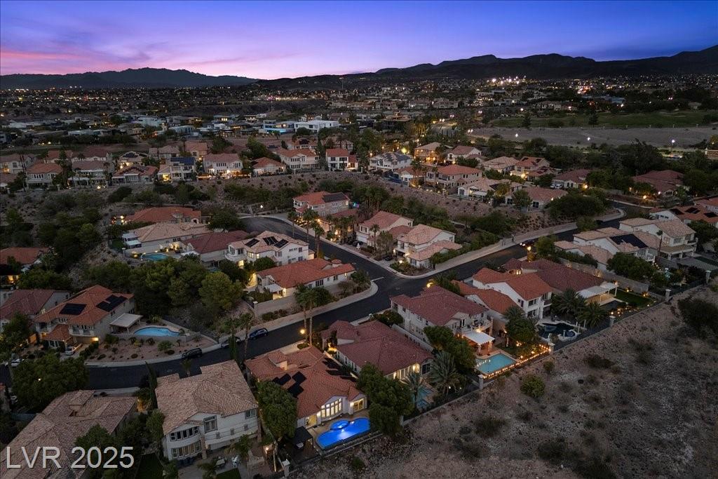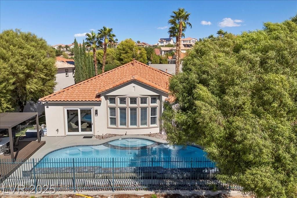 Guard-gated Renaissance at Seven Hills luxury! Elegant single-story home on the Rio Secco Golf Course with 12-ft ceilings, 3 beds + den, and 2.5 baths. Enter through a sunlit courtyard with French doors into open living spaces featuring two floor-to-ceiling gas fireplaces and plantation shutters. The gourmet kitchen offers granite counters, island, custom backsplash, and stainless appliances. The oversized primary suite has direct backyard access and a spa bath with dual vanities, soaking tub, walk-in shower, and closet. Step outside through new Andersen sliders to a resort-style backyard with infinity-edge pool & spa, new heating system, new deck, custom cabana, and mature trees framing breathtaking golf course & mountain views. Upgrades include two A/C units (one new) and whole-home water filtration. Minutes from The District at Green Valley Ranch and top schools—move-in ready elegance!