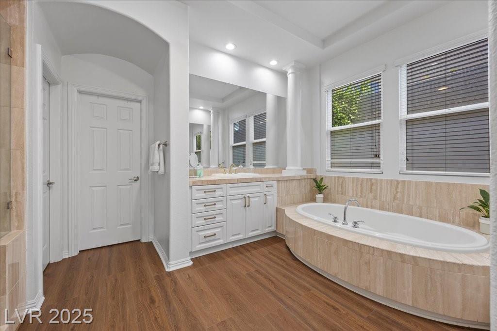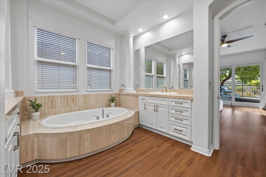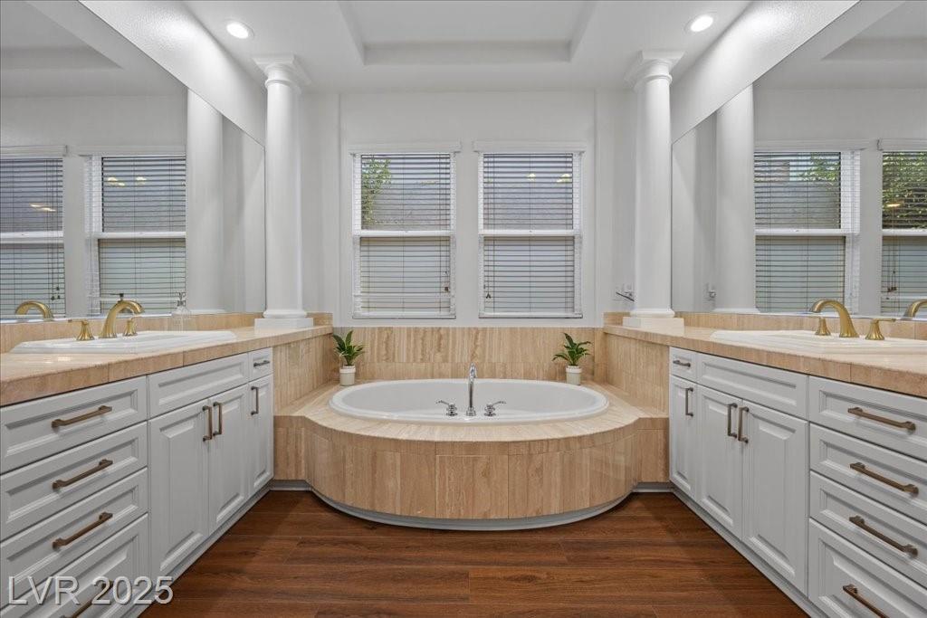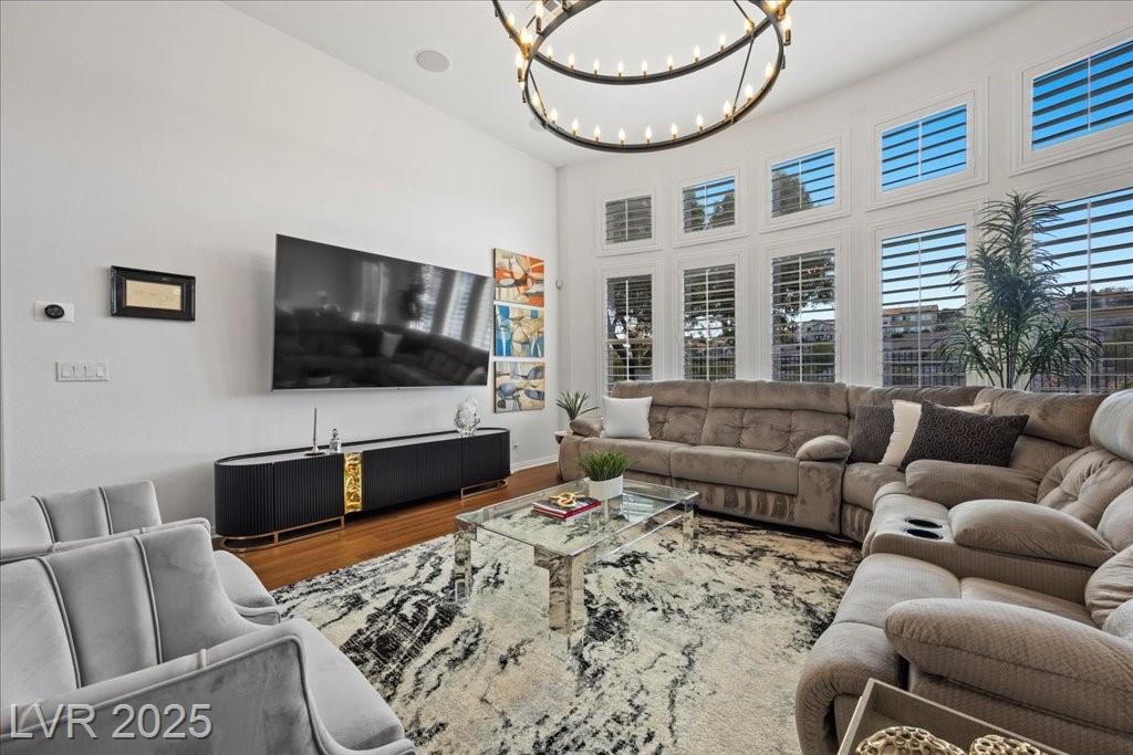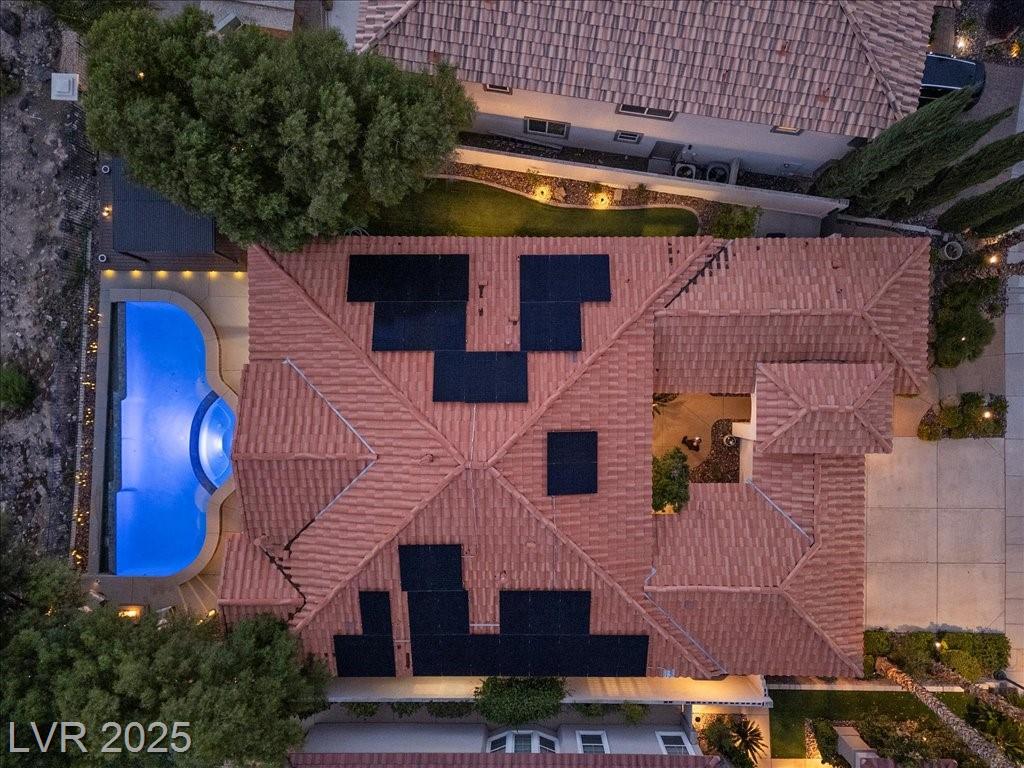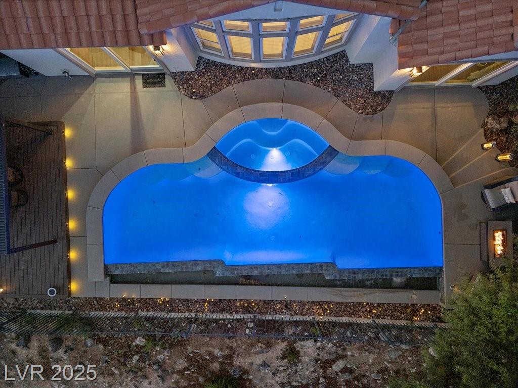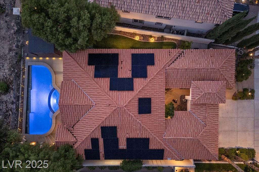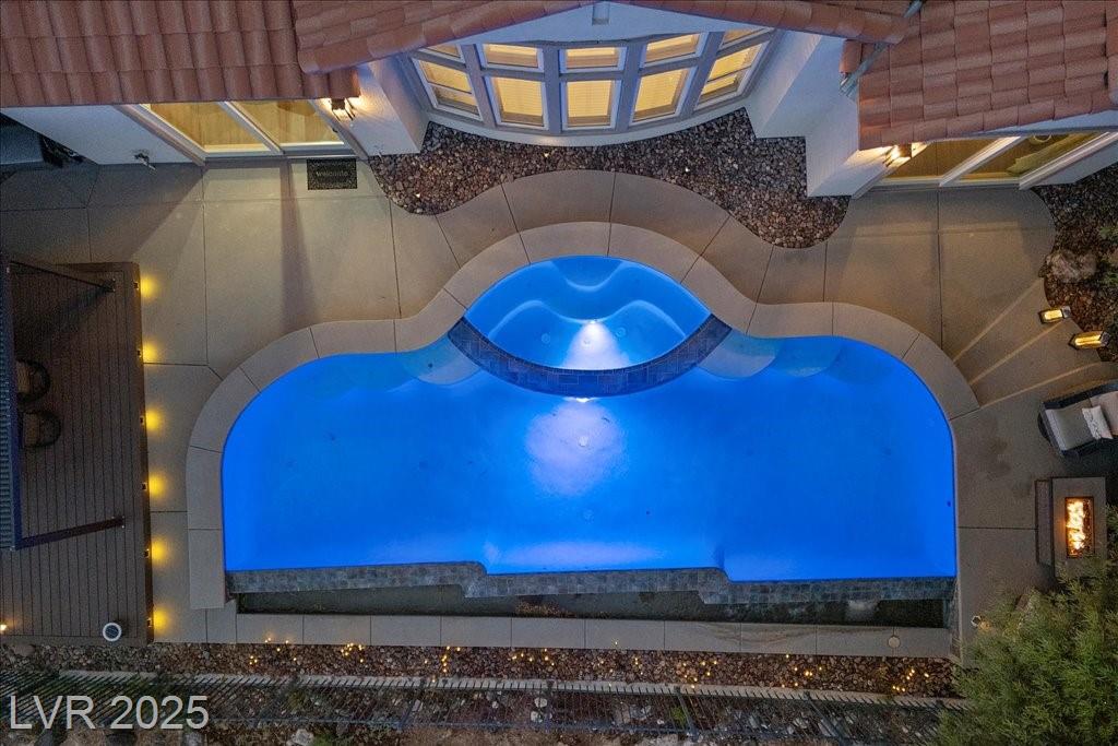 Guard-gated Renaissance at Seven Hills luxury! Elegant single-story home on the Rio Secco Golf Course with 12-ft ceilings, 3 beds + den, and 2.5 baths. Enter through a sunlit courtyard with French doors into open living spaces featuring two floor-to-ceiling gas fireplaces and plantation shutters. The gourmet kitchen offers granite counters, island, custom backsplash, and stainless appliances. The oversized primary suite has direct backyard access and a spa bath with dual vanities, soaking tub, walk-in shower, and closet. Step outside through new Andersen sliders to a resort-style backyard with infinity-edge pool & spa, new heating system, new deck, custom cabana, and mature trees framing breathtaking golf course & mountain views. Upgrades include two A/C units (one new) and whole-home water filtration. Minutes from The District at Green Valley Ranch and top schools—move-in ready elegance!