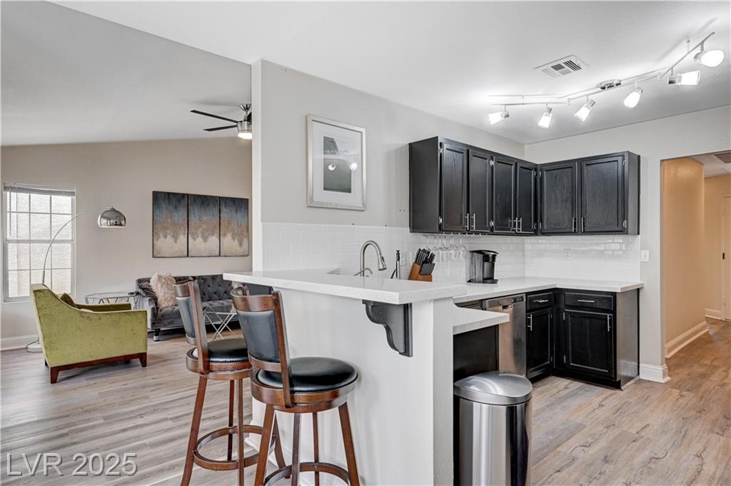 Three bedroom two bathroom single story house in Desert Shores Community with spacious living room featuring updated décor, laminate floors, and views of the backyard. Enjoy dining area is enhanced by bay windows. Updated kitchen has quartz countertops, dark stylish cabinets, and stainless steel appliances. Comfortable primary suite has a walk-in closet and updated bathroom with two sinks, a stylish large walkin shower, and decorative tiles. Includes full size washer and dryer, and attached two car garage.