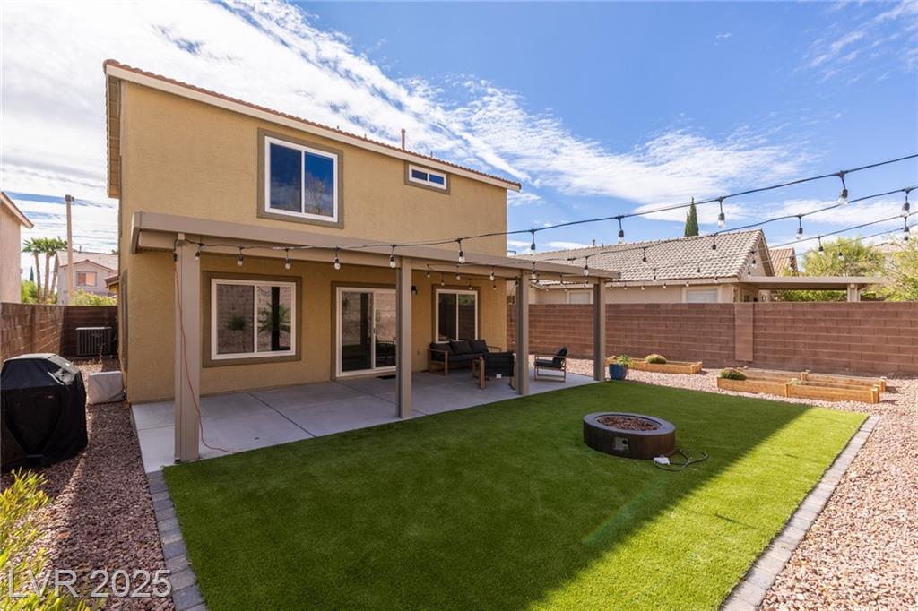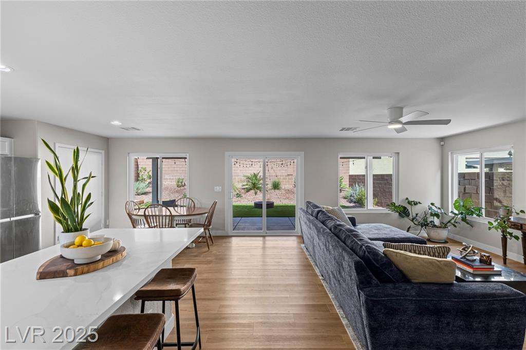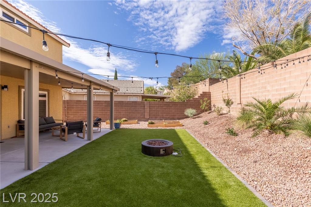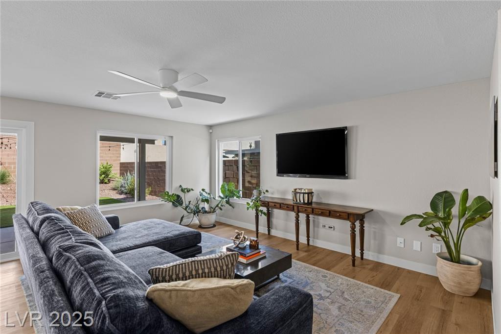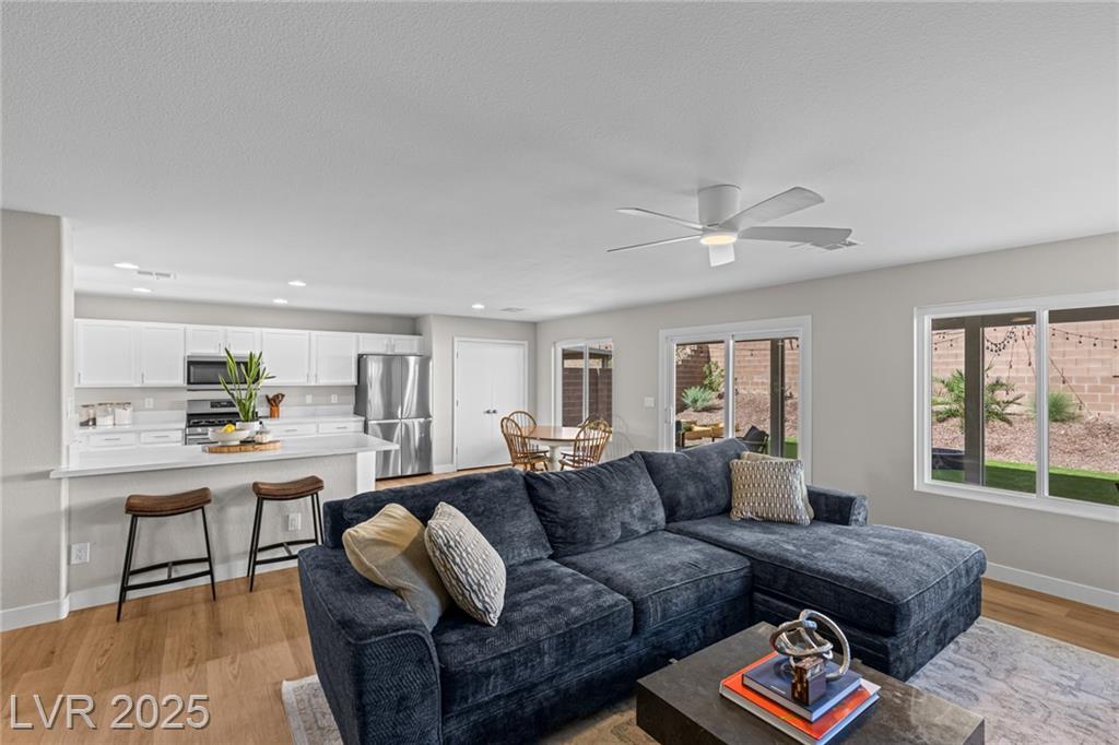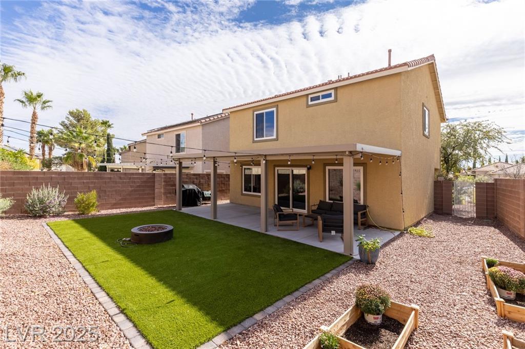 This thoughtfully updated 2-story is located in Fallbrook, a friendly Summerlin community w/neighborhood park & picnic area—just a short walk from Staton Elementary School & less than 10 minutes from premier shopping & dining at Downtown Summerlin, Boca Park, & Tivoli Village. Blending comfort & convenience, the interior boasts new flooring & baseboards, Nest thermostats, & blackout shades in all the bedrooms. The open-concept main level is ideal for everyday living & entertaining. In the kitchen, Samsung appliances, marbled quartz countertops, & a peninsula w/seating make both cooking & conversation easy. Unwind in the family room, complete w/mounted TV & glass sliders that open to the patio for seamless indoor/outdoor living. In the backyard, enjoy a low-maintenance retreat w/new pet-treated turf, raised garden beds, & a large covered patio. A collection of fruit trees—apple, plum, lemon, mandarin orange, & fig—adds natural beauty throughout the property.