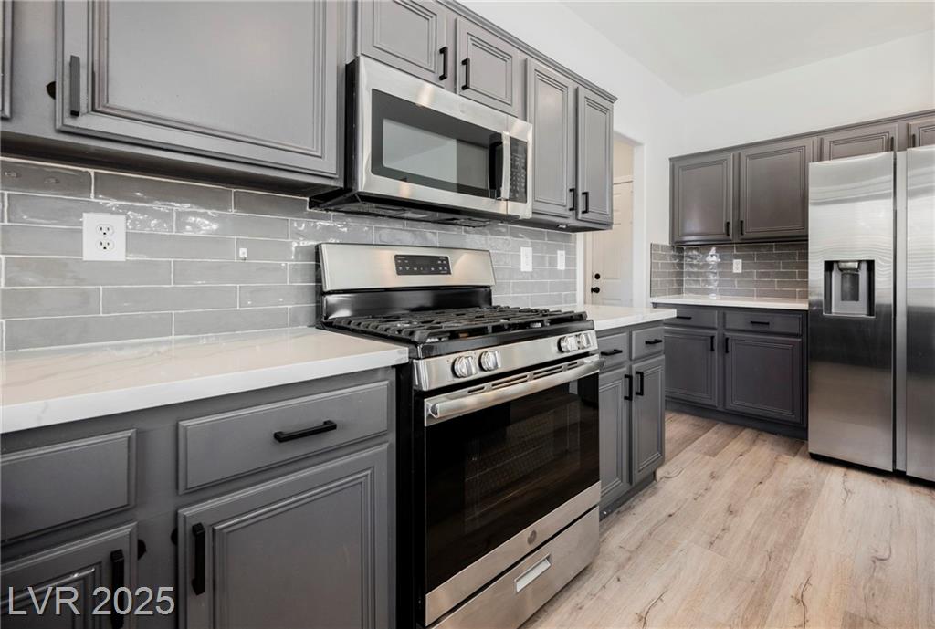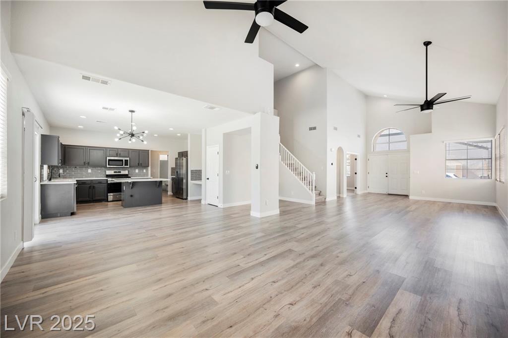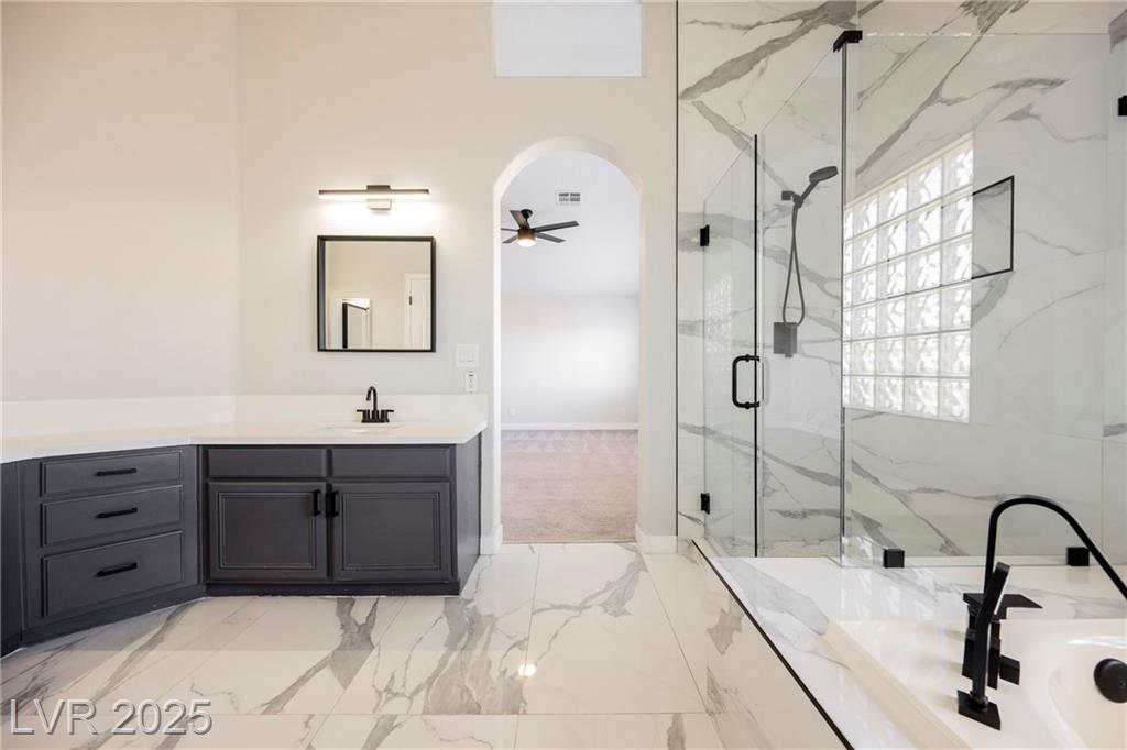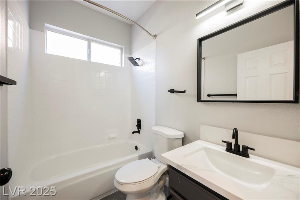 Beautifully updated 4-bedroom + den home with 4 full bathrooms and fresh interior paint throughout. The first floor features stylish laminate flooring and a spacious living area with soaring vaulted ceilings and ceiling fans. Enjoy a sleek, modern kitchen with quartz countertops, stainless steel appliances, walk-in pantry, and an island with breakfast bar. Two full bathrooms and one bedroom are located downstairs—perfect for guests or multigenerational living. The den/office offers flexibility and can easily be converted into a 5th bedroom. Upstairs, you’ll find two primary suites—ideal for a large or extended family. All bedrooms are generously sized and include ceiling fan lights. The large main primary suite offers a walk-in closet and spa-like bath with dual sinks, soaking tub, and walk-in shower. Step outside to a private backyard with a patio and low-maintenance landscaping. Located close to shopping, dining, and schools. Stylish, spacious, and move-in ready—don’t miss it!