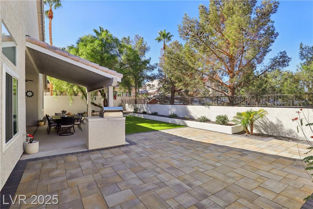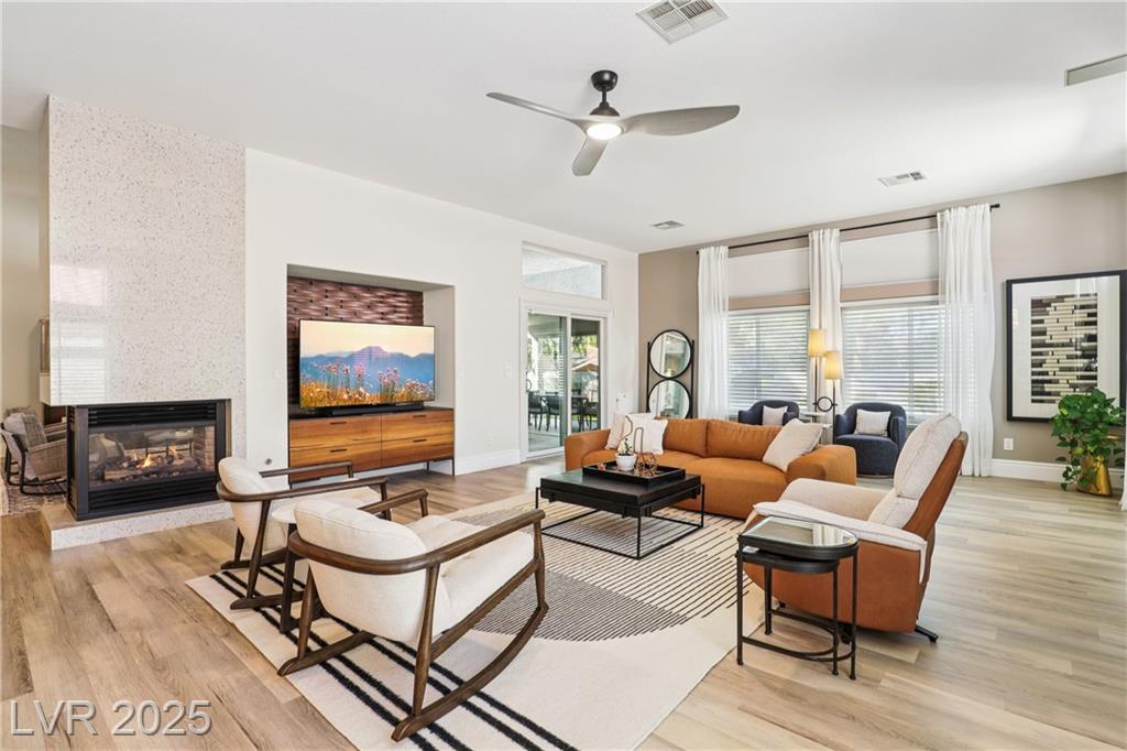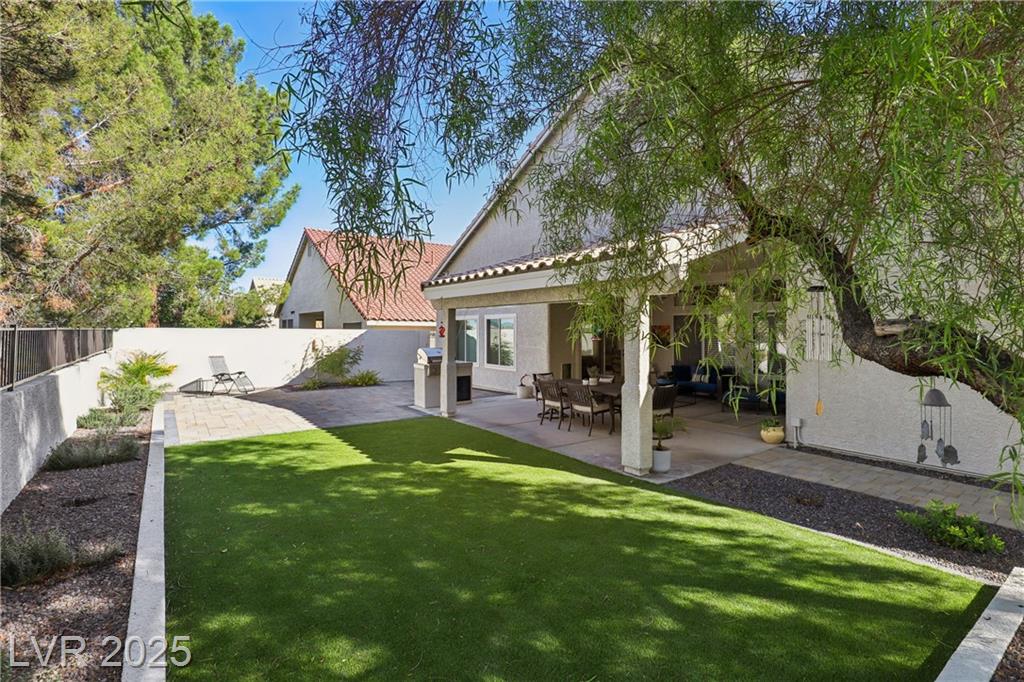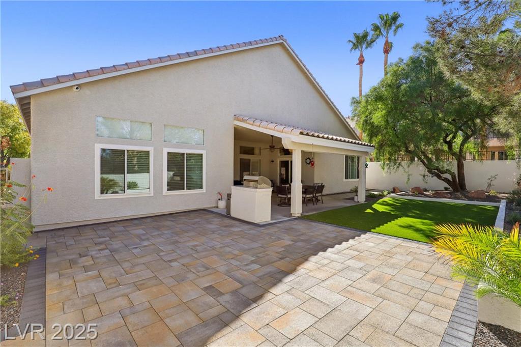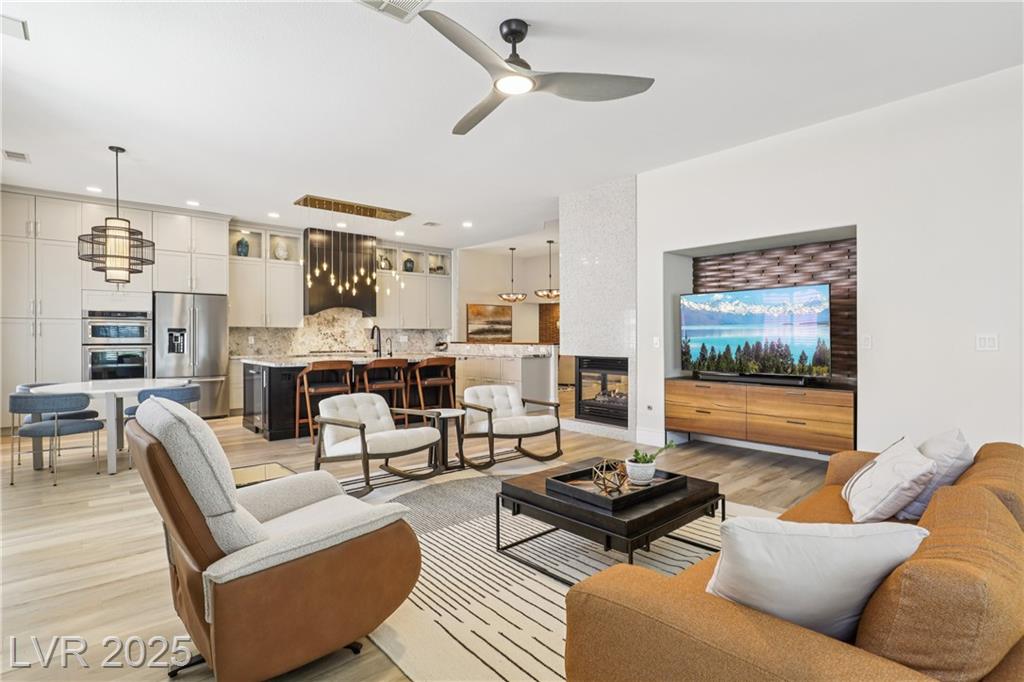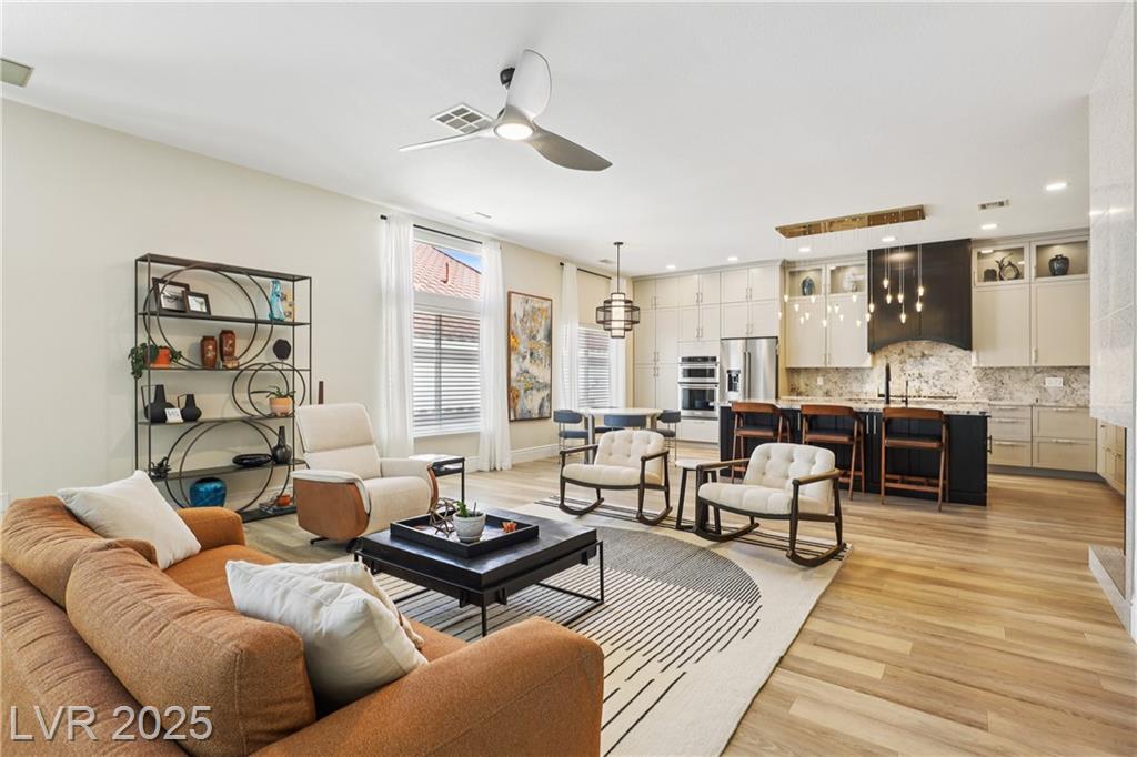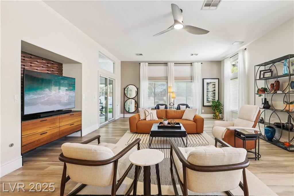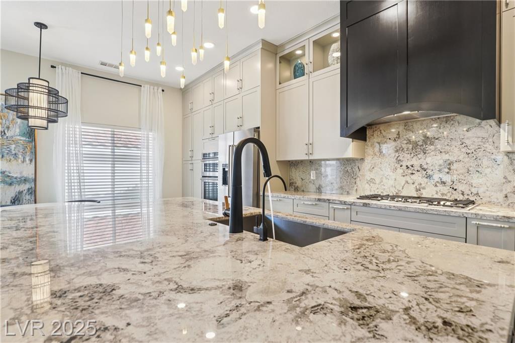 Modern elegance meets prime Green Valley living! This beautifully updated 4-bed, 2.5-bath home offers 2,956 sq ft, a 3-car garage, and OWNED SOLAR. Professionally designed with custom cabinetry in the baths and kitchen, including large drawers, stainless steel appliances, and an under-counter ice maker. Enjoy a large primary suite with a sitting room and a luxurious bathroom. Designer lighting, new flooring, tiled bathroom walls, black walnut accent walls, and curated finishes create a polished, elevated feel throughout. Enjoy newer A/C units, new west-facing windows, and an extended patio cover overlooking a spacious backyard with room for a pool. Move into a newly epoxied garage floor, plus fresh pavers and landscaping, both front and rear. Perfectly located within walking distance to The District, Lifetime Fitness, and Green Valley Ranch Resort, and zoned for top-rated schools. Experience the best of Green Valley living in a home that blends comfort, style, & unbeatable convenience.