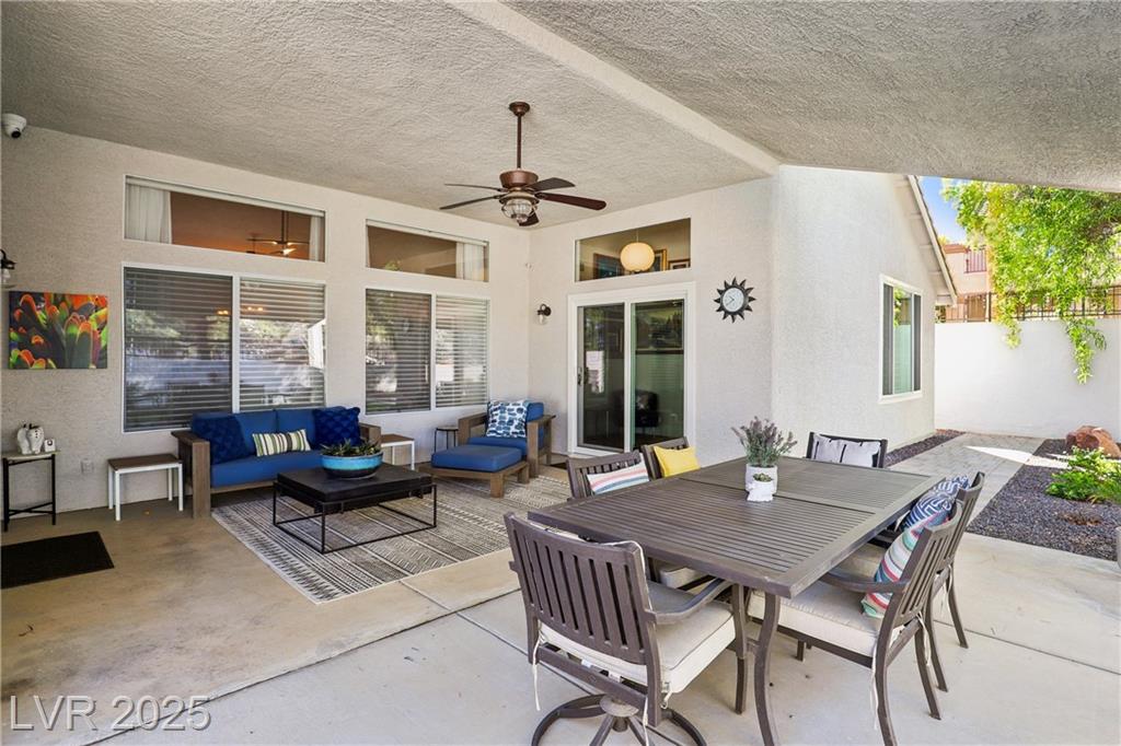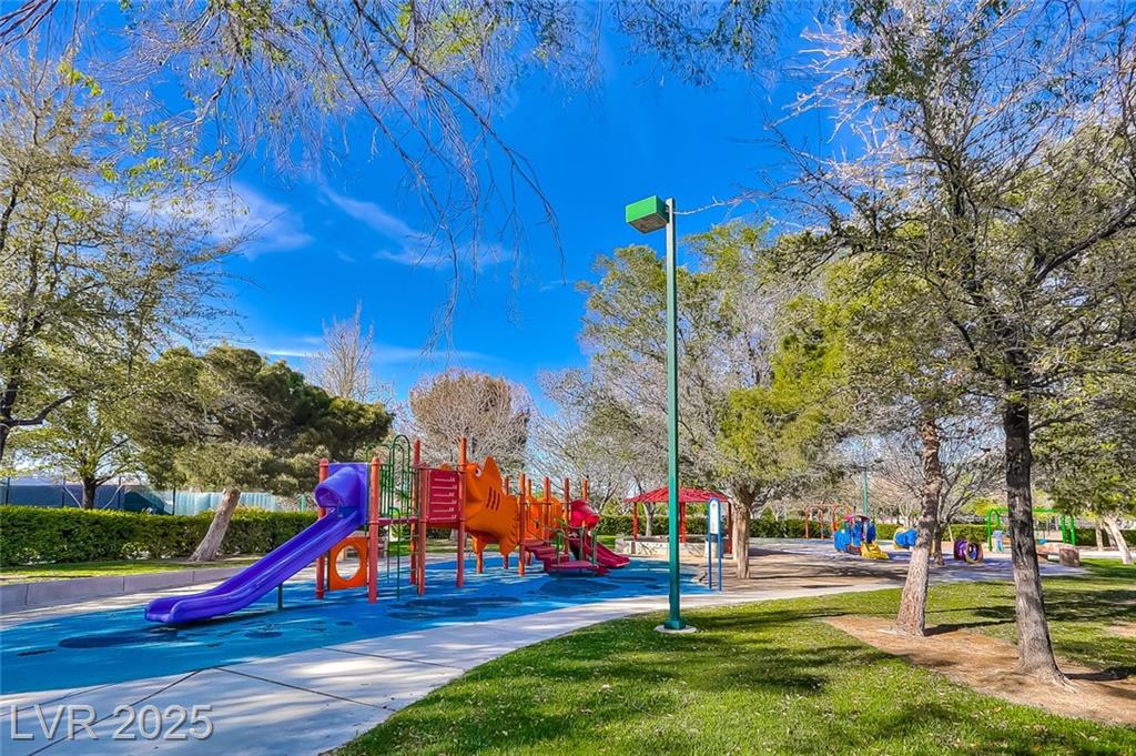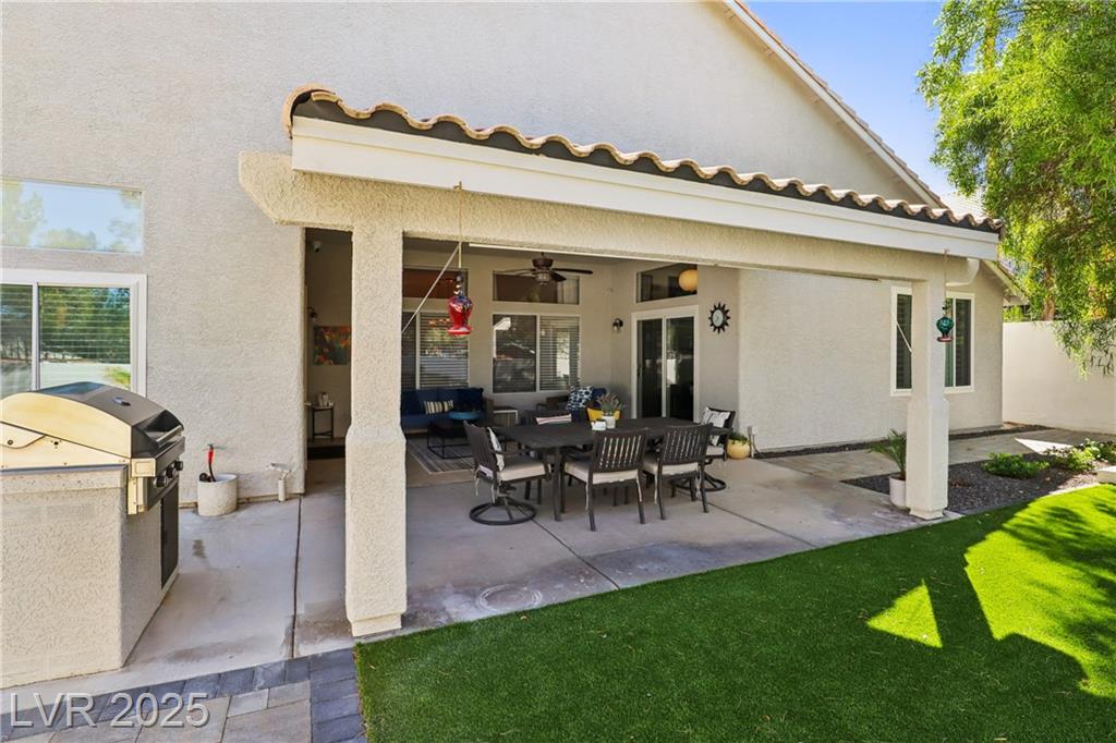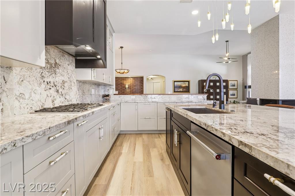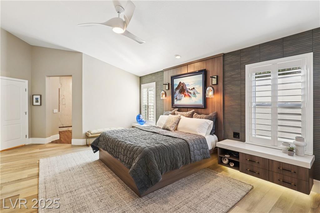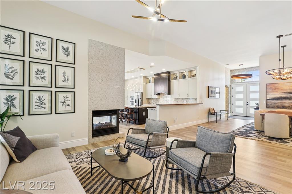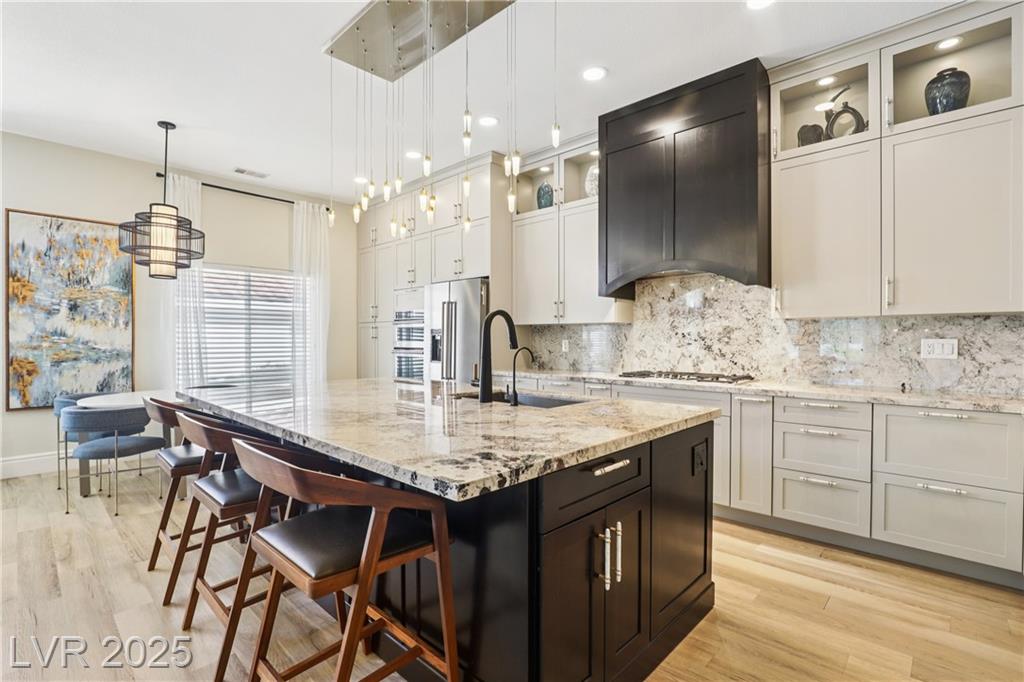 Modern elegance meets prime Green Valley living! This beautifully updated 4-bed, 2.5-bath home offers 2,956 sq ft, a 3-car garage, and OWNED SOLAR. Professionally designed with custom cabinetry in the baths and kitchen, including large drawers, stainless steel appliances, and an under-counter ice maker. Enjoy a large primary suite with a sitting room and a luxurious bathroom. Designer lighting, new flooring, tiled bathroom walls, black walnut accent walls, and curated finishes create a polished, elevated feel throughout. Enjoy newer A/C units, new west-facing windows, and an extended patio cover overlooking a spacious backyard with room for a pool. Move into a newly epoxied garage floor, plus fresh pavers and landscaping, both front and rear. Perfectly located within walking distance to The District, Lifetime Fitness, and Green Valley Ranch Resort, and zoned for top-rated schools. Experience the best of Green Valley living in a home that blends comfort, style, & unbeatable convenience.