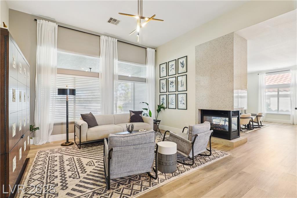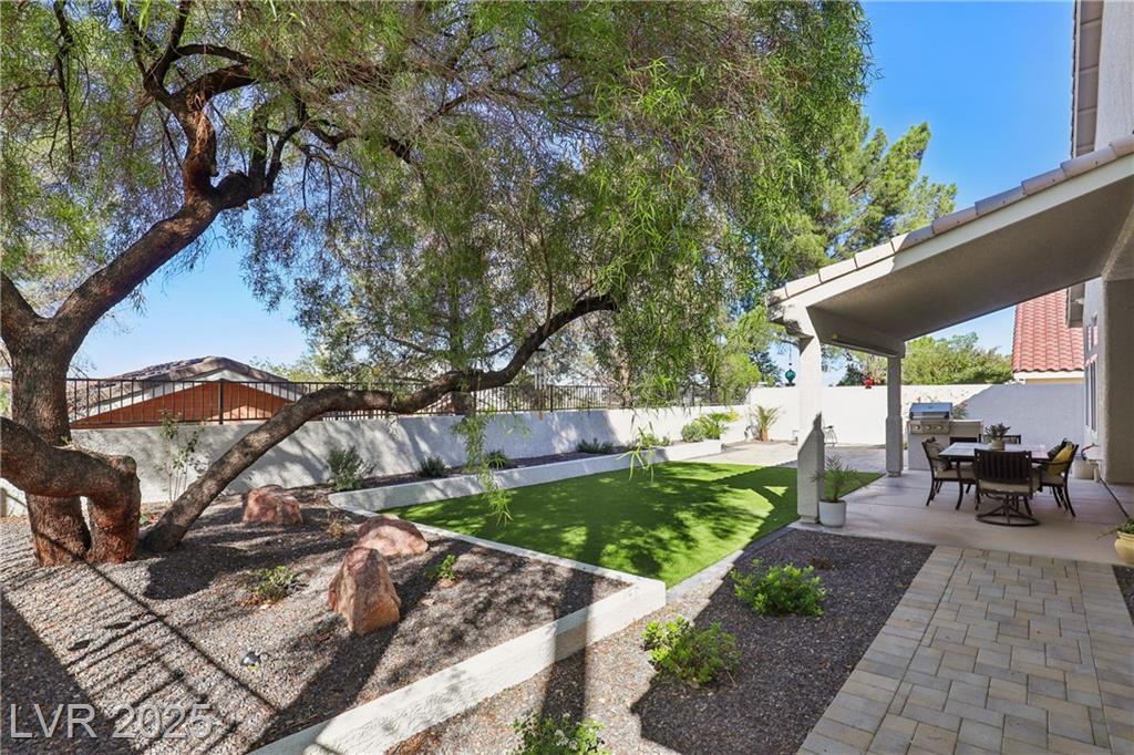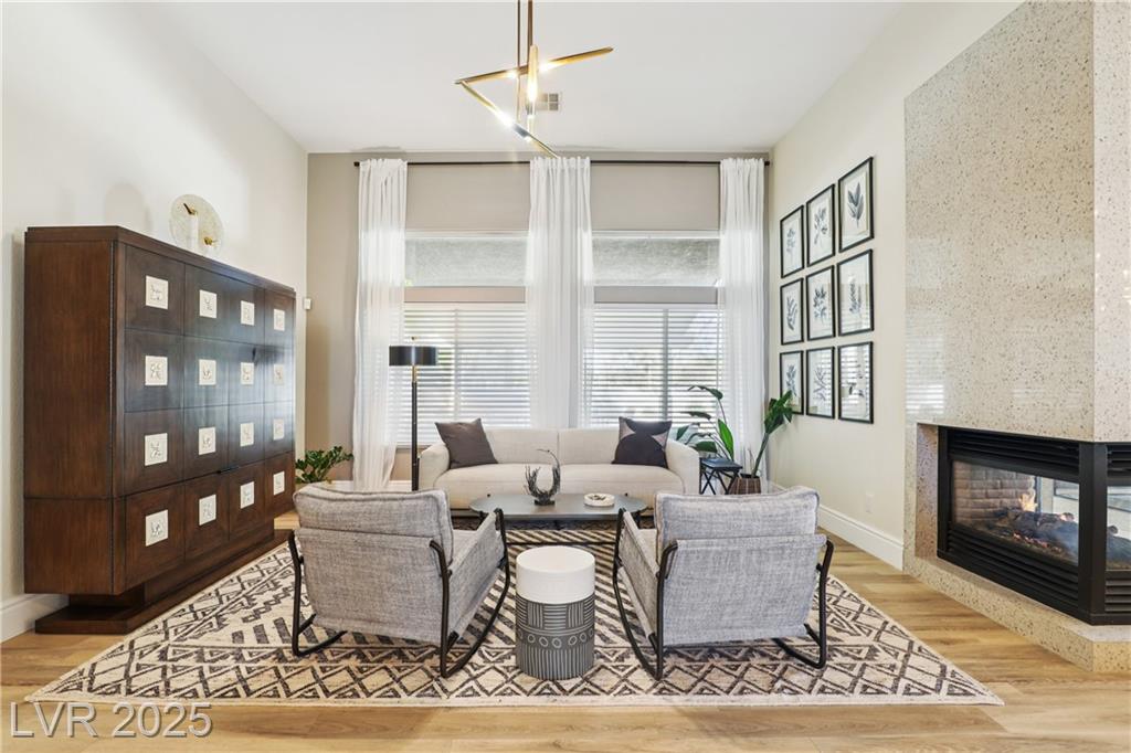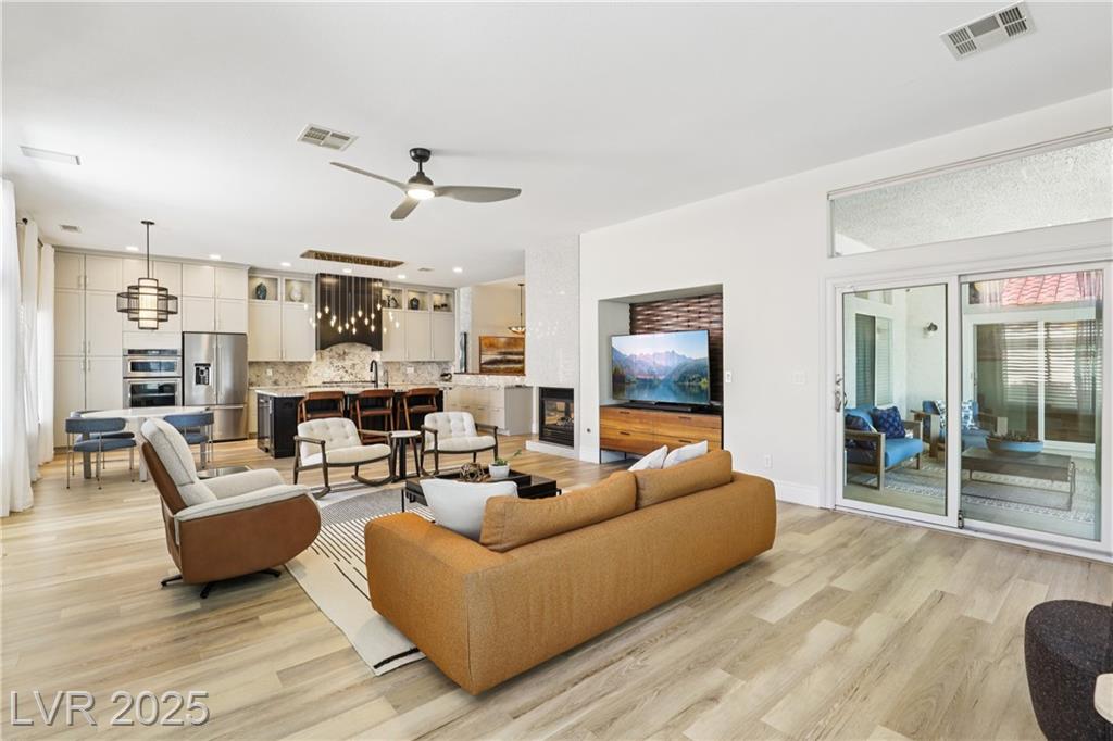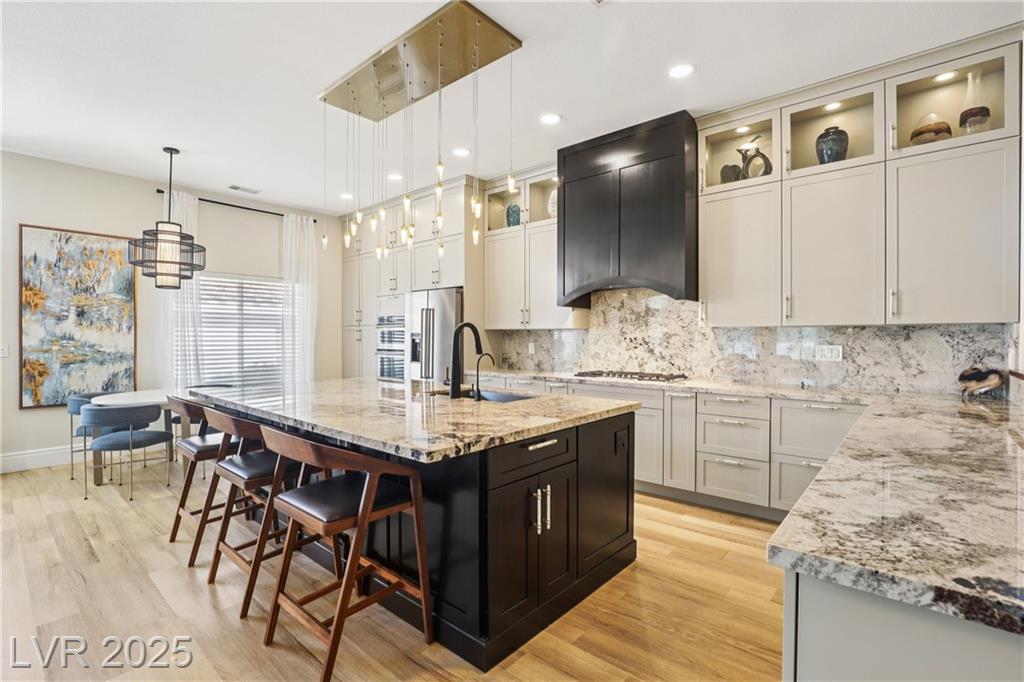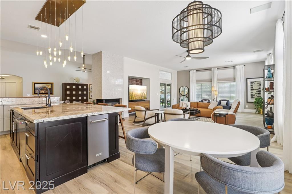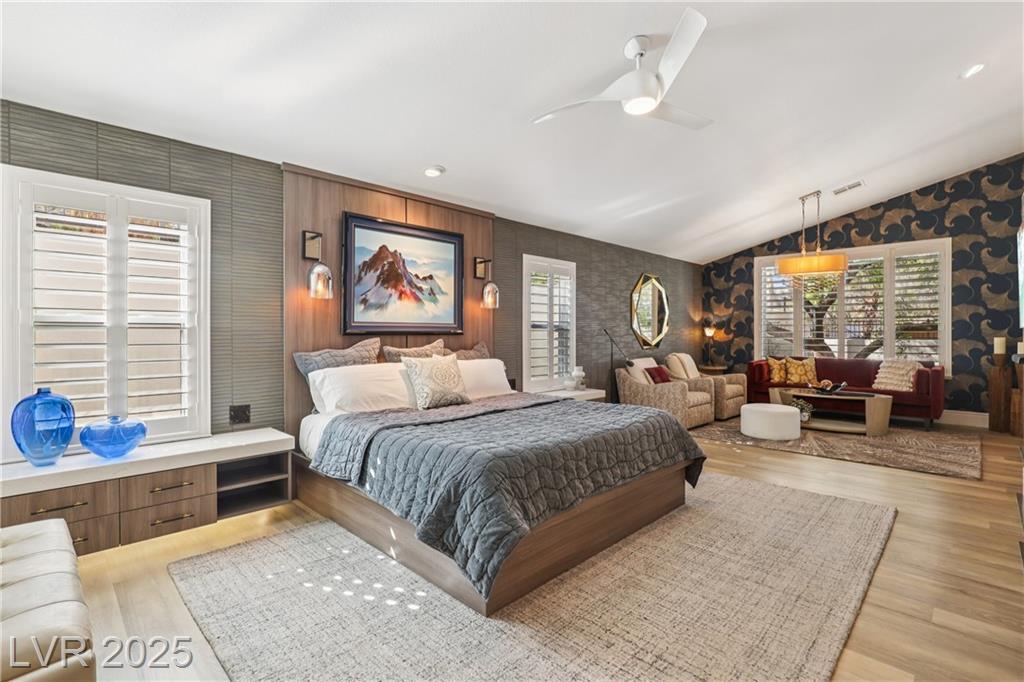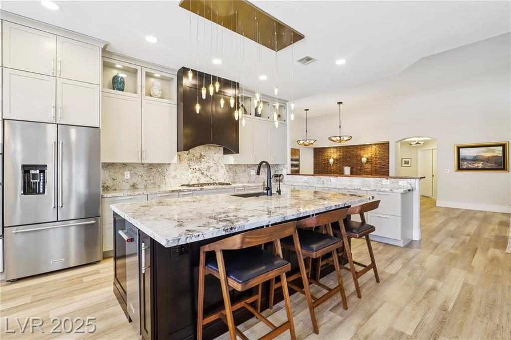 Modern elegance meets prime Green Valley living! This beautifully updated 4-bed, 2.5-bath home offers 2,956 sq ft, a 3-car garage, and OWNED SOLAR. Professionally designed with custom cabinetry in the baths and kitchen, including large drawers, stainless steel appliances, and an under-counter ice maker. Enjoy a large primary suite with a sitting room and a luxurious bathroom. Designer lighting, new flooring, tiled bathroom walls, black walnut accent walls, and curated finishes create a polished, elevated feel throughout. Enjoy newer A/C units, new west-facing windows, and an extended patio cover overlooking a spacious backyard with room for a pool. Move into a newly epoxied garage floor, plus fresh pavers and landscaping, both front and rear. Perfectly located within walking distance to The District, Lifetime Fitness, and Green Valley Ranch Resort, and zoned for top-rated schools. Experience the best of Green Valley living in a home that blends comfort, style, & unbeatable convenience.