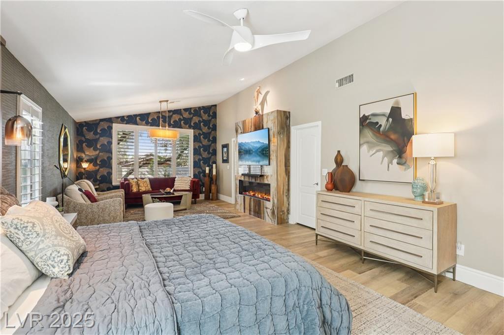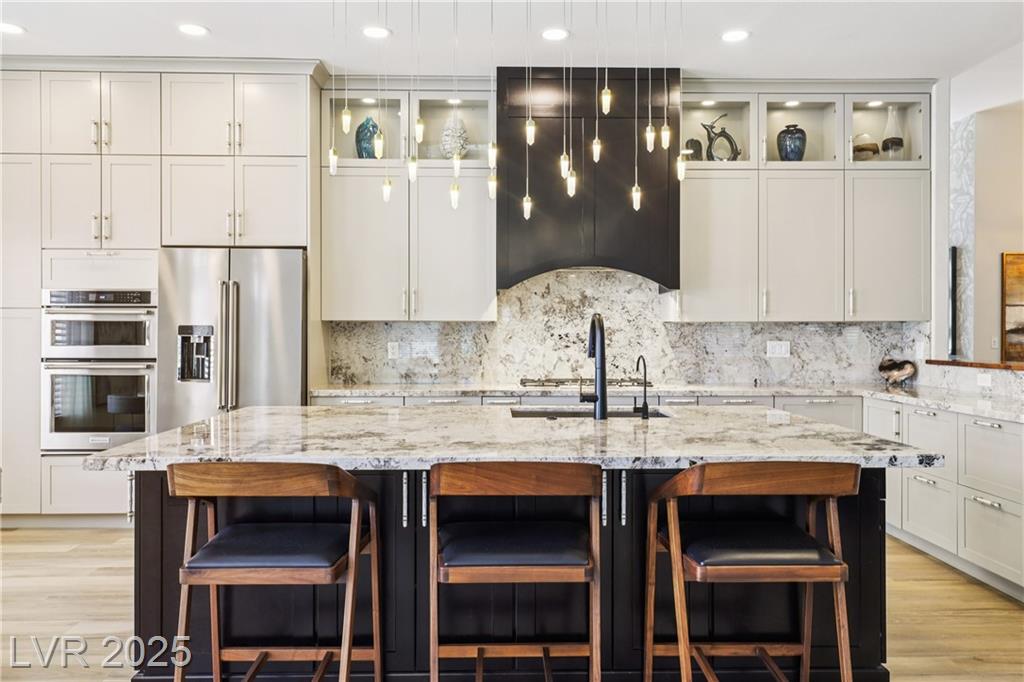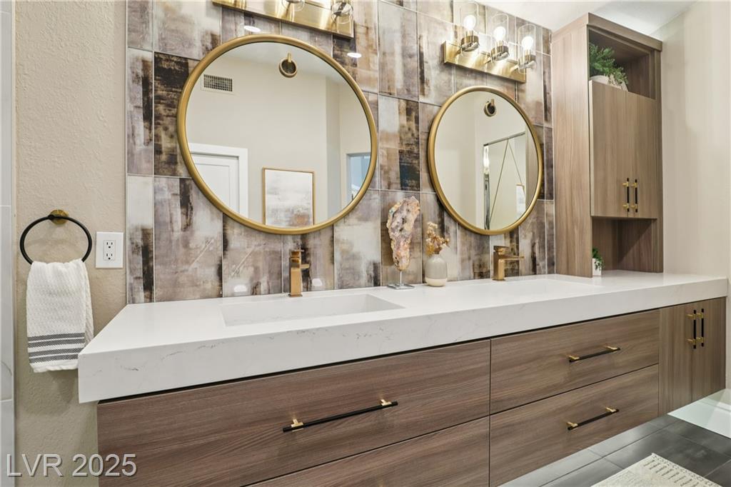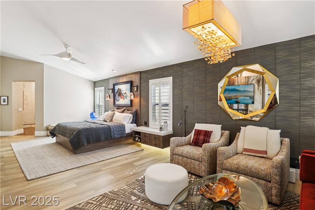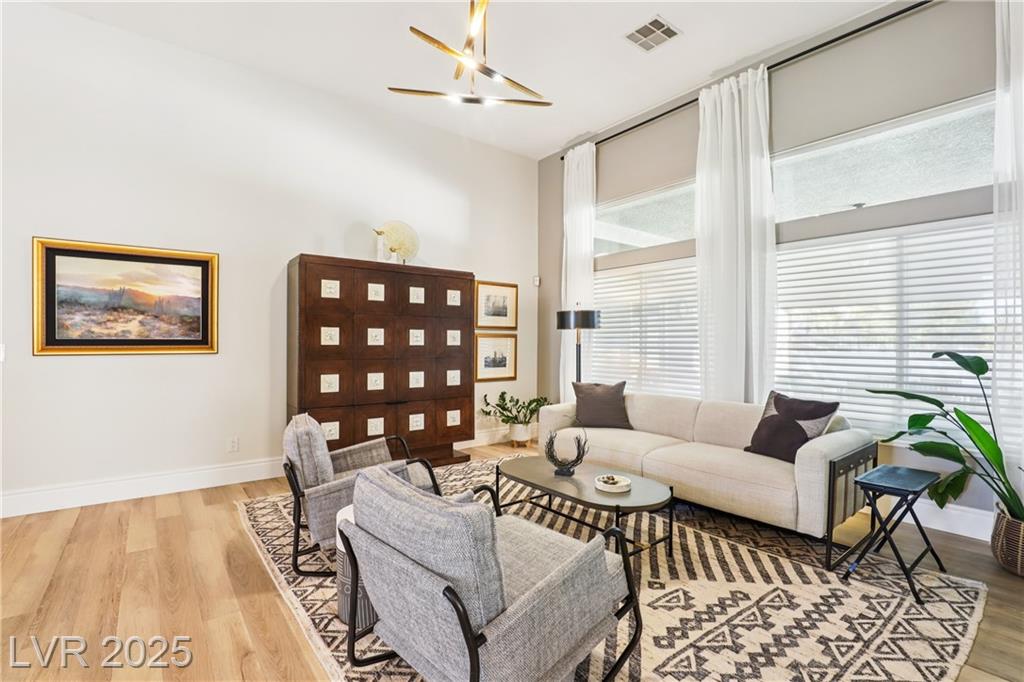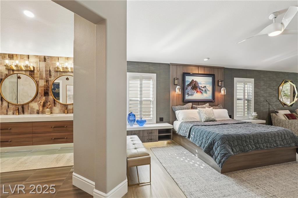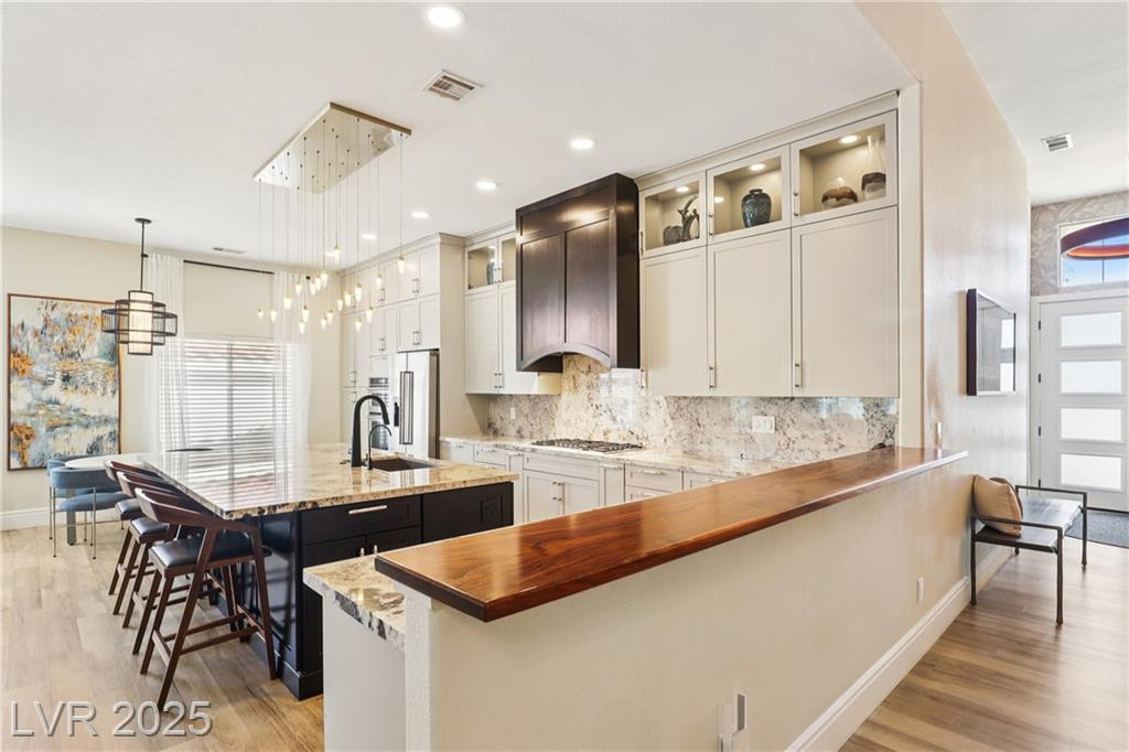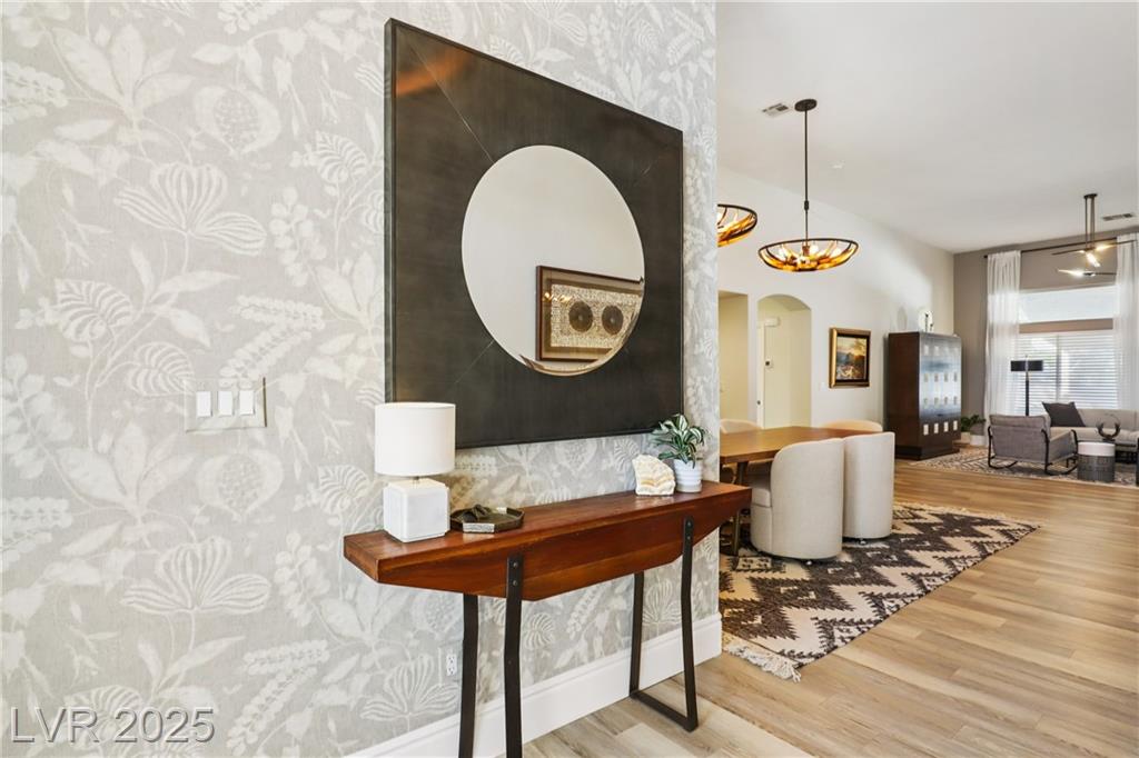 Modern elegance meets prime Green Valley living! This beautifully updated 4-bed, 2.5-bath home offers 2,956 sq ft, a 3-car garage, and OWNED SOLAR. Professionally designed with custom cabinetry in the baths and kitchen, including large drawers, stainless steel appliances, and an under-counter ice maker. Enjoy a large primary suite with a sitting room and a luxurious bathroom. Designer lighting, new flooring, tiled bathroom walls, black walnut accent walls, and curated finishes create a polished, elevated feel throughout. Enjoy newer A/C units, new west-facing windows, and an extended patio cover overlooking a spacious backyard with room for a pool. Move into a newly epoxied garage floor, plus fresh pavers and landscaping, both front and rear. Perfectly located within walking distance to The District, Lifetime Fitness, and Green Valley Ranch Resort, and zoned for top-rated schools. Experience the best of Green Valley living in a home that blends comfort, style, & unbeatable convenience.