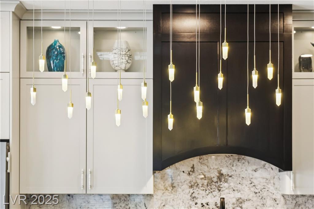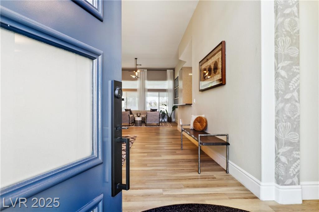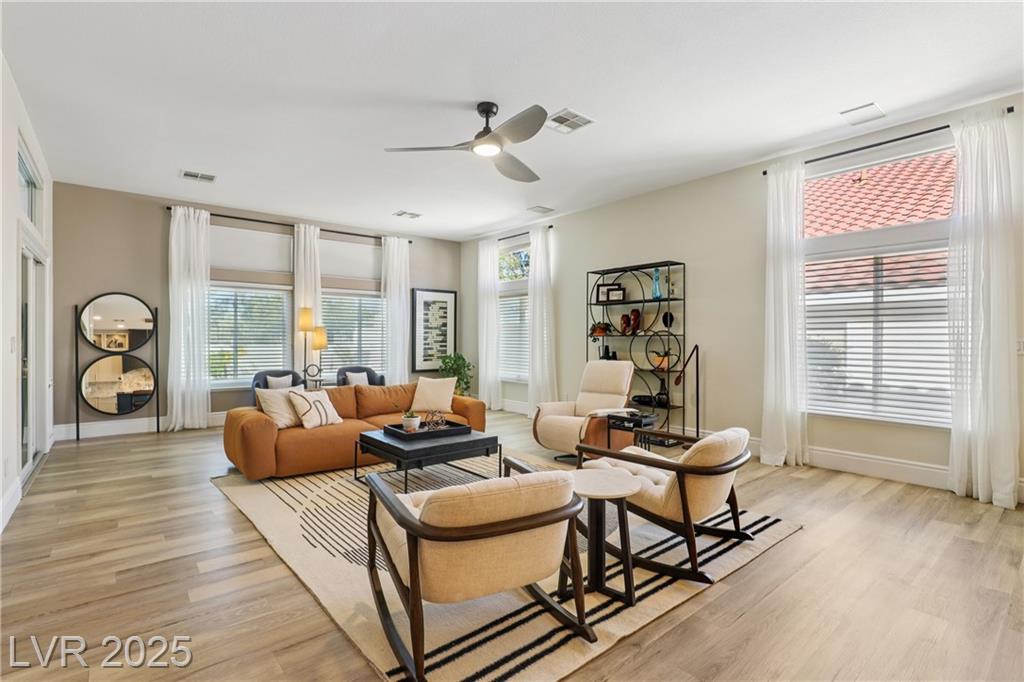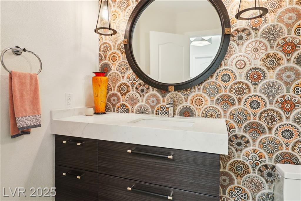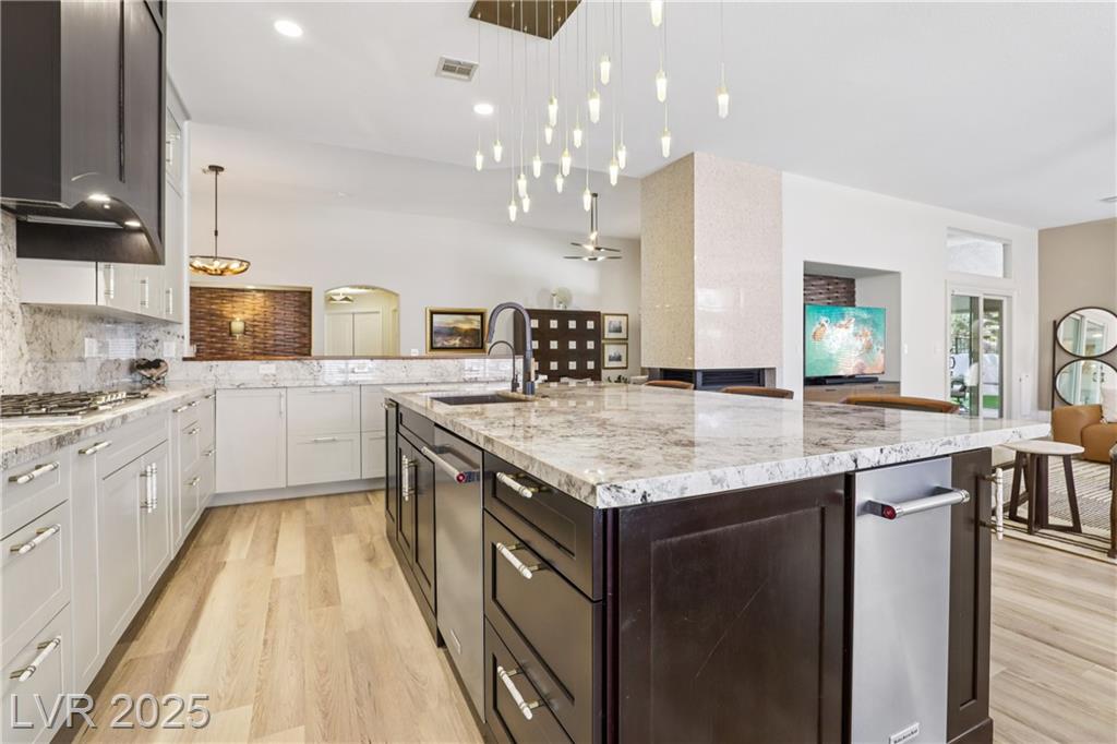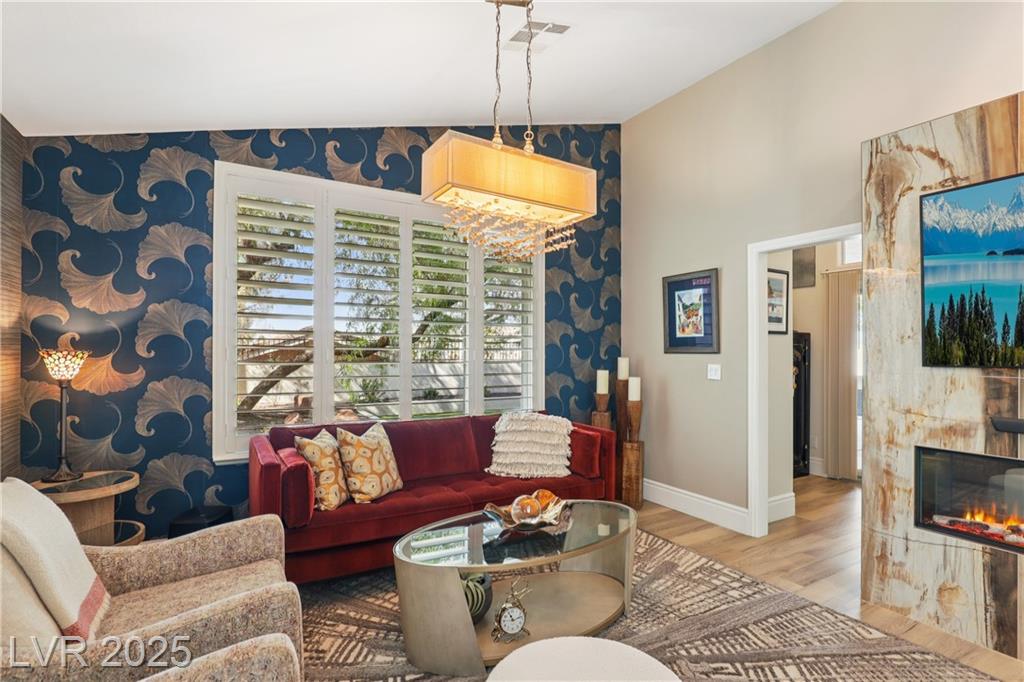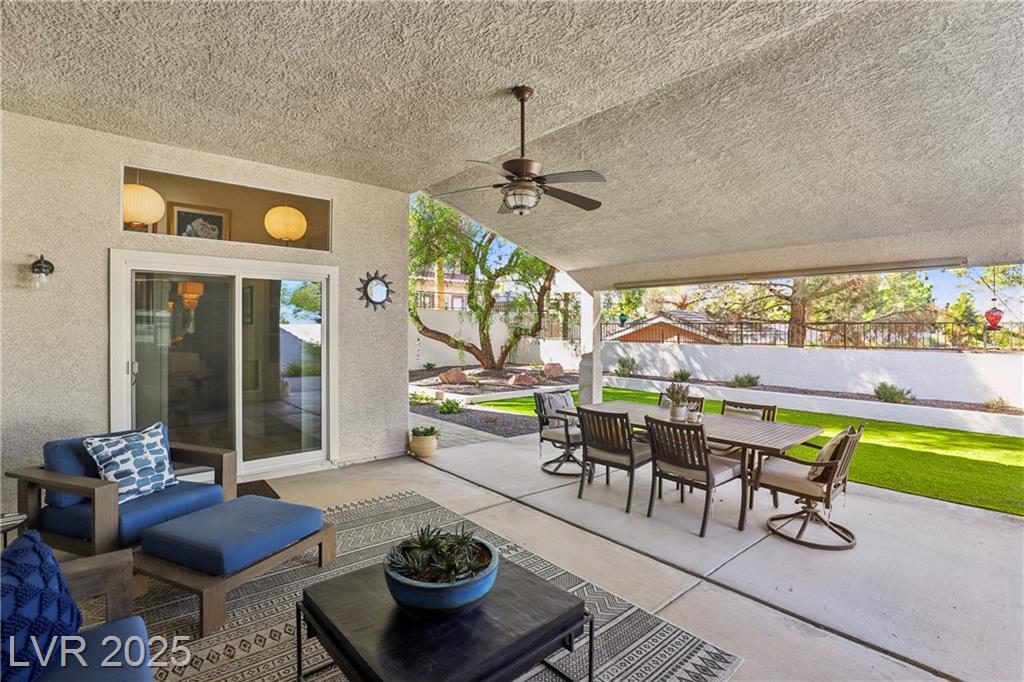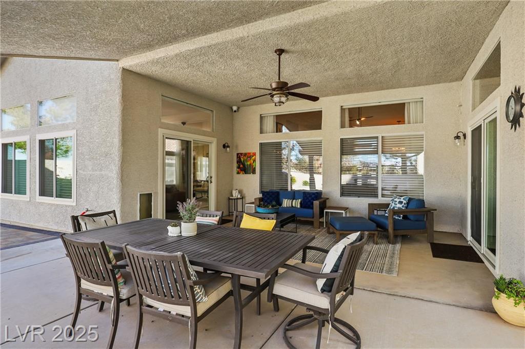 Modern elegance meets prime Green Valley living! This beautifully updated 4-bed, 2.5-bath home offers 2,956 sq ft, a 3-car garage, and OWNED SOLAR. Professionally designed with custom cabinetry in the baths and kitchen, including large drawers, stainless steel appliances, and an under-counter ice maker. Enjoy a large primary suite with a sitting room and a luxurious bathroom. Designer lighting, new flooring, tiled bathroom walls, black walnut accent walls, and curated finishes create a polished, elevated feel throughout. Enjoy newer A/C units, new west-facing windows, and an extended patio cover overlooking a spacious backyard with room for a pool. Move into a newly epoxied garage floor, plus fresh pavers and landscaping, both front and rear. Perfectly located within walking distance to The District, Lifetime Fitness, and Green Valley Ranch Resort, and zoned for top-rated schools. Experience the best of Green Valley living in a home that blends comfort, style, & unbeatable convenience.