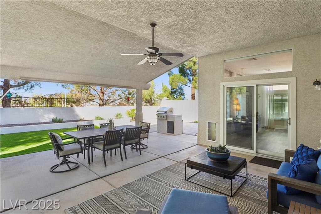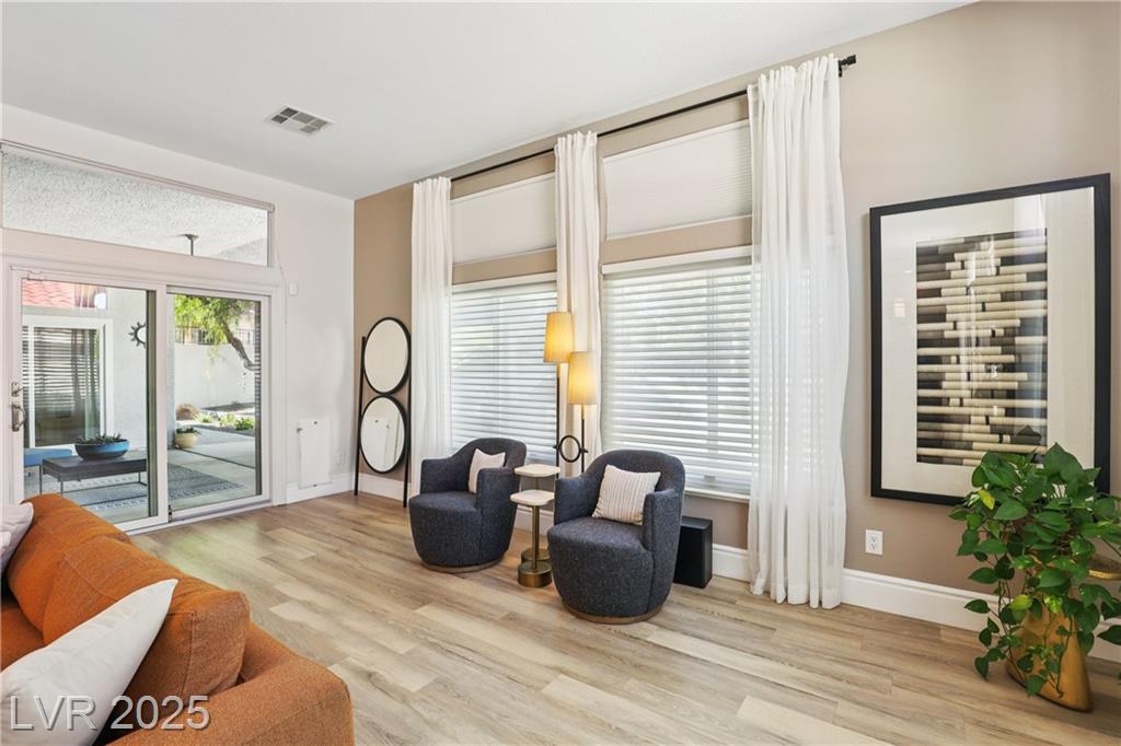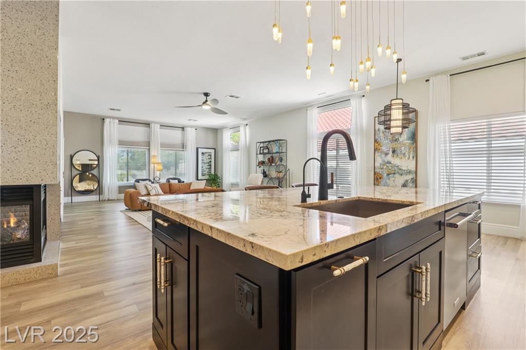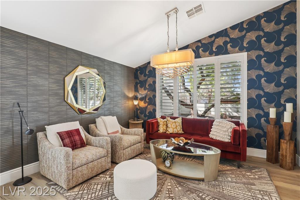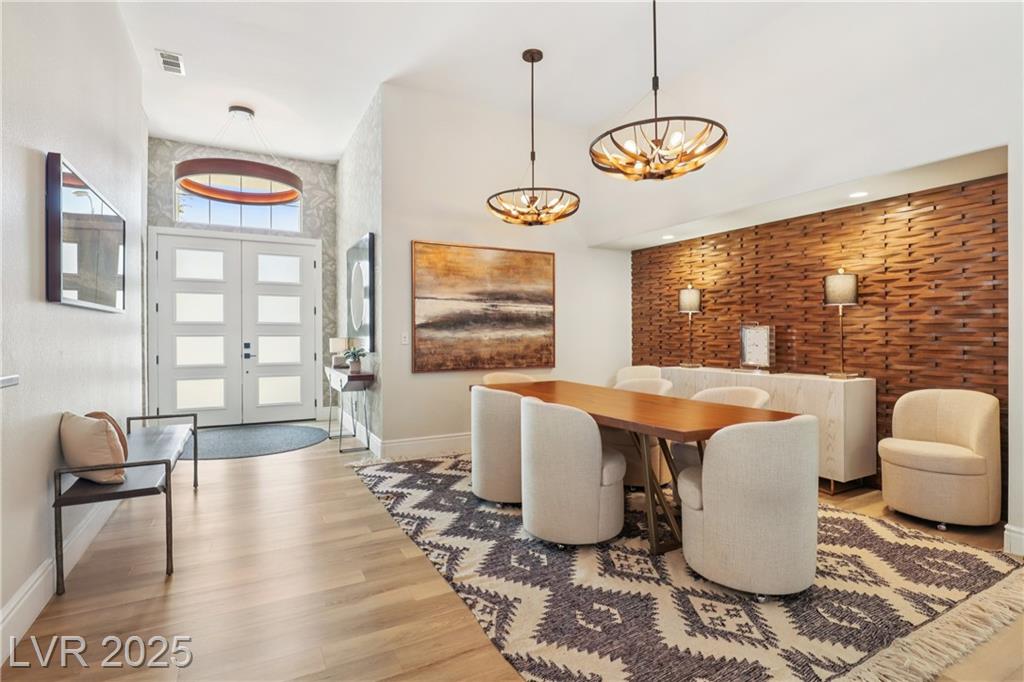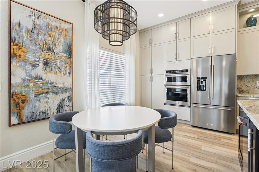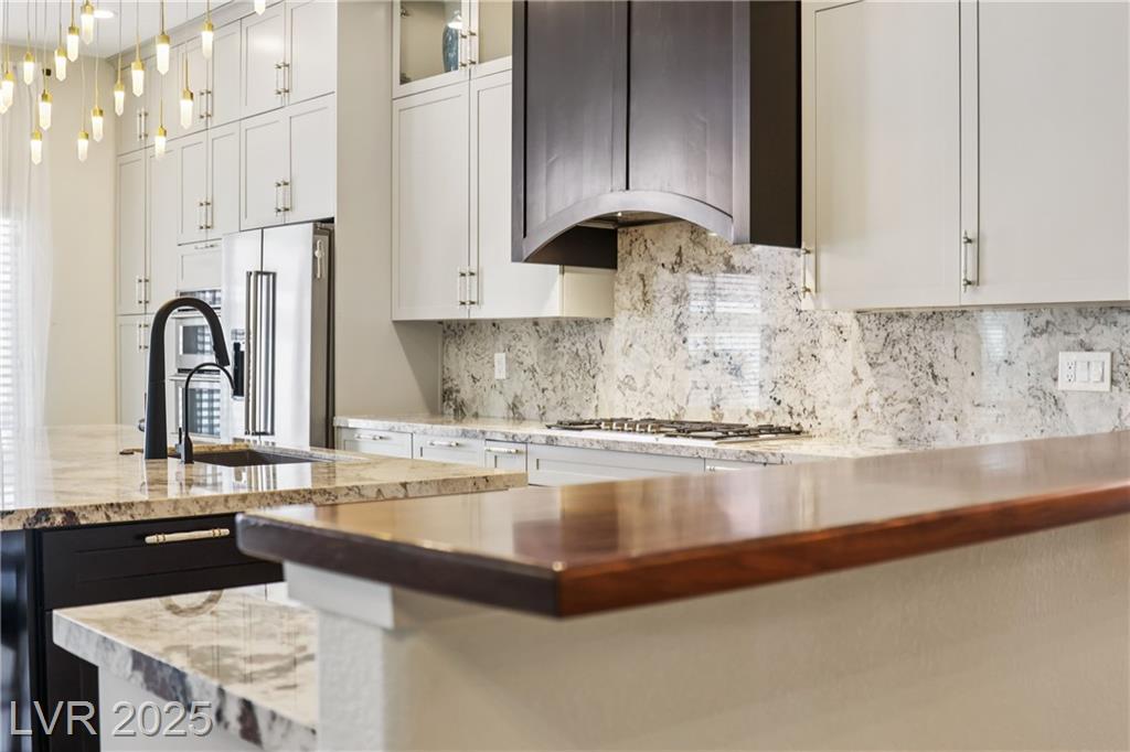 Modern elegance meets prime Green Valley living! This beautifully updated 4-bed, 2.5-bath home offers 2,956 sq ft, a 3-car garage, and OWNED SOLAR. Professionally designed with custom cabinetry in the baths and kitchen, including large drawers, stainless steel appliances, and an under-counter ice maker. Enjoy a large primary suite with a sitting room and a luxurious bathroom. Designer lighting, new flooring, tiled bathroom walls, black walnut accent walls, and curated finishes create a polished, elevated feel throughout. Enjoy newer A/C units, new west-facing windows, and an extended patio cover overlooking a spacious backyard with room for a pool. Move into a newly epoxied garage floor, plus fresh pavers and landscaping, both front and rear. Perfectly located within walking distance to The District, Lifetime Fitness, and Green Valley Ranch Resort, and zoned for top-rated schools. Experience the best of Green Valley living in a home that blends comfort, style, & unbeatable convenience.