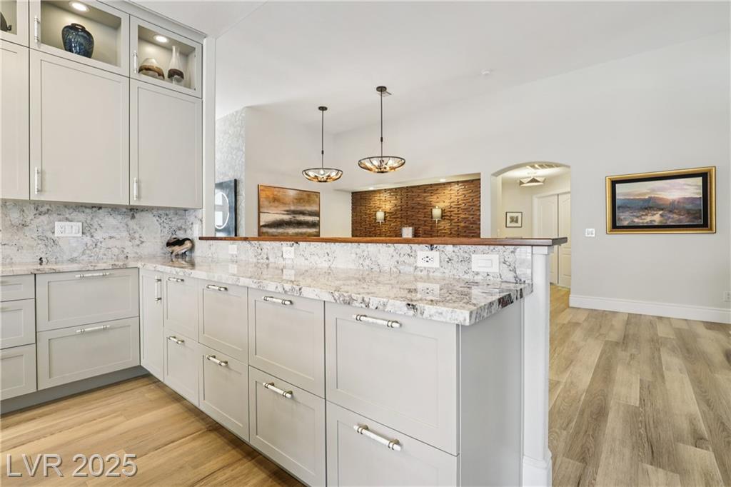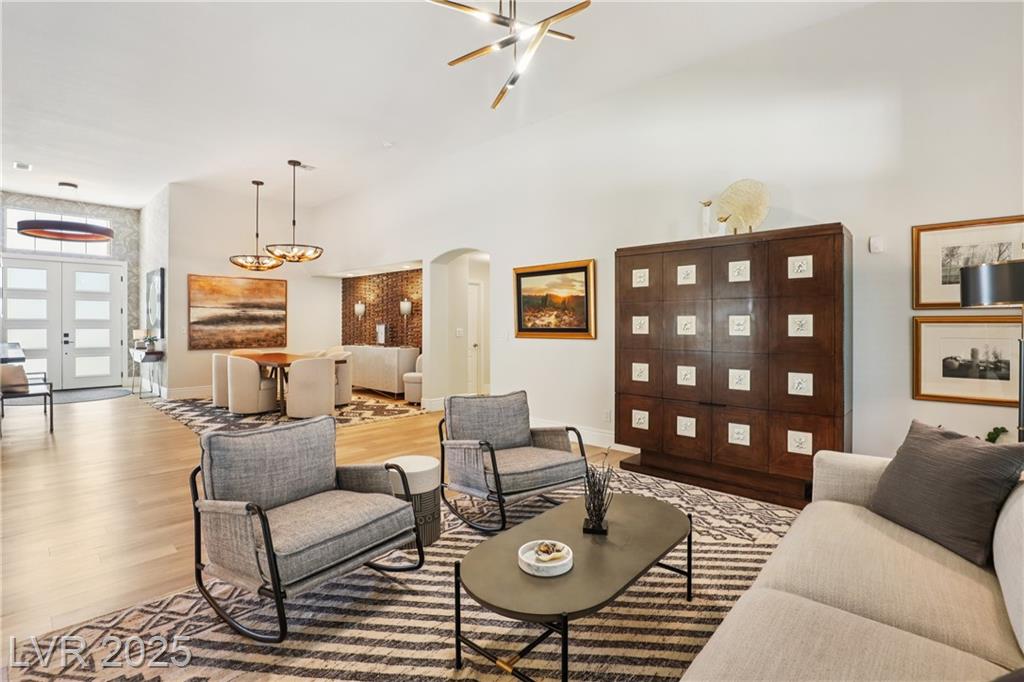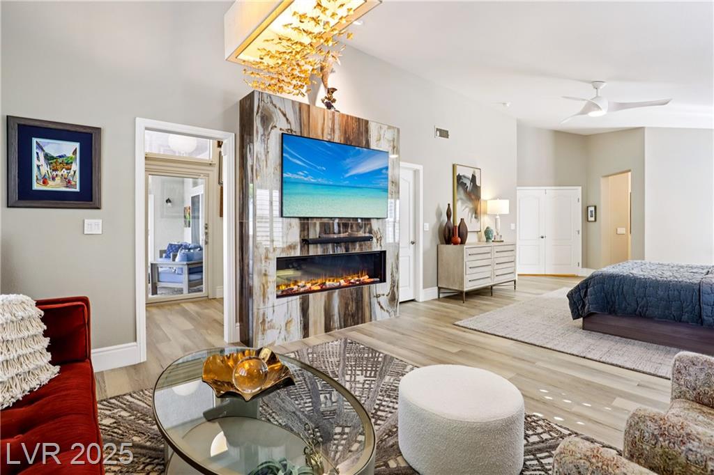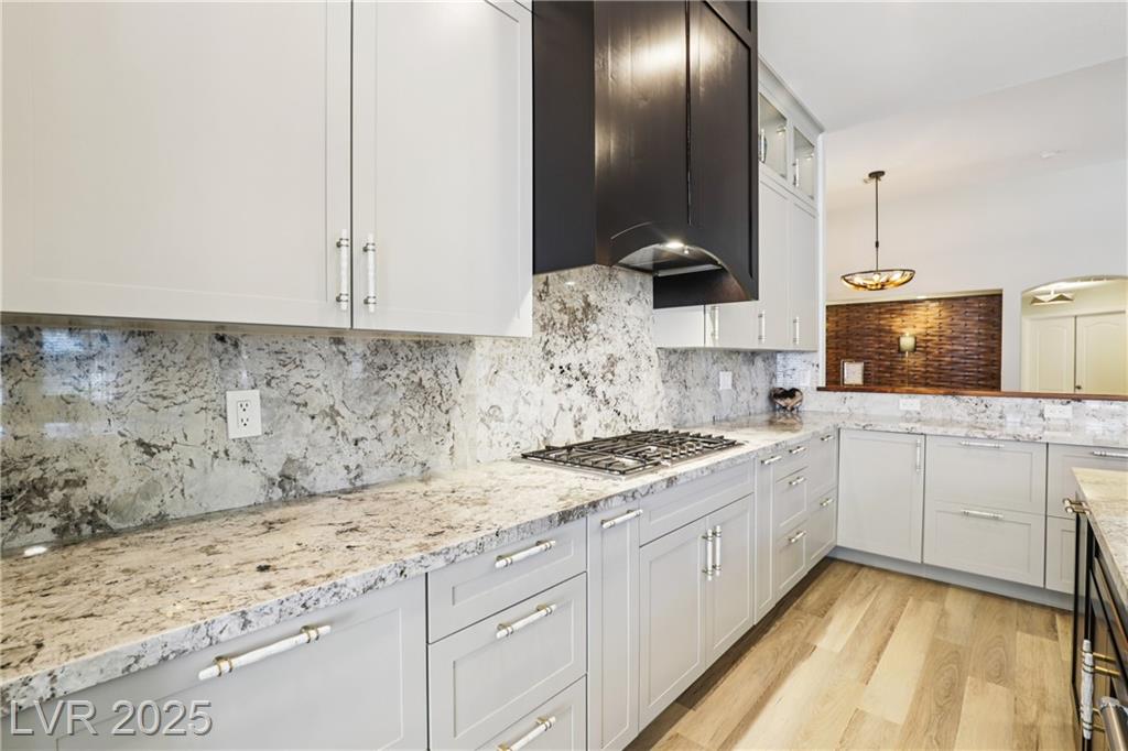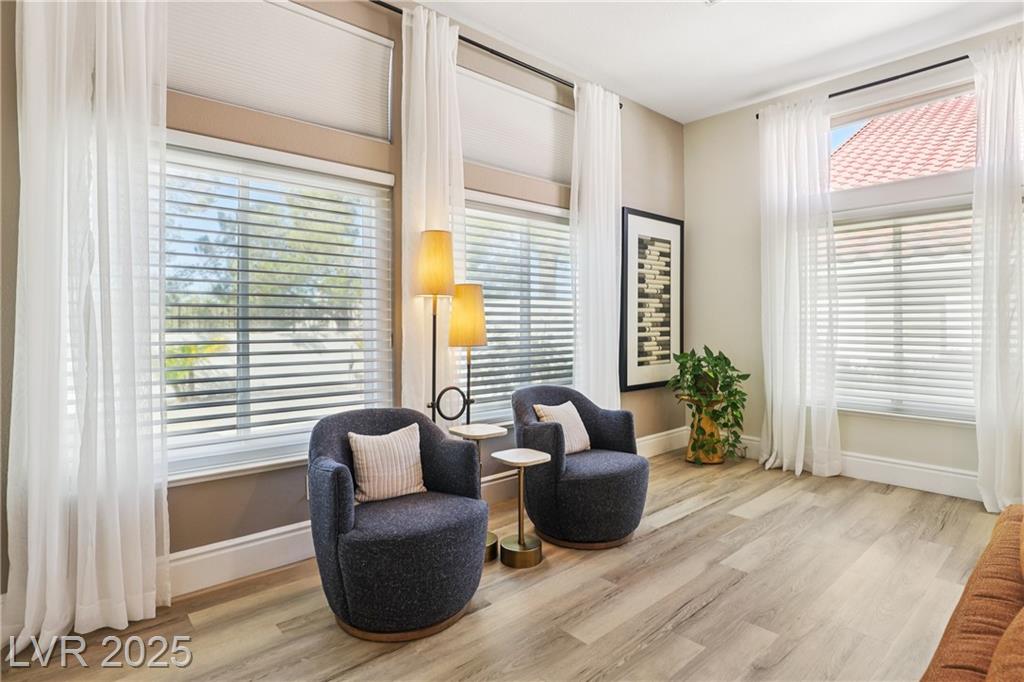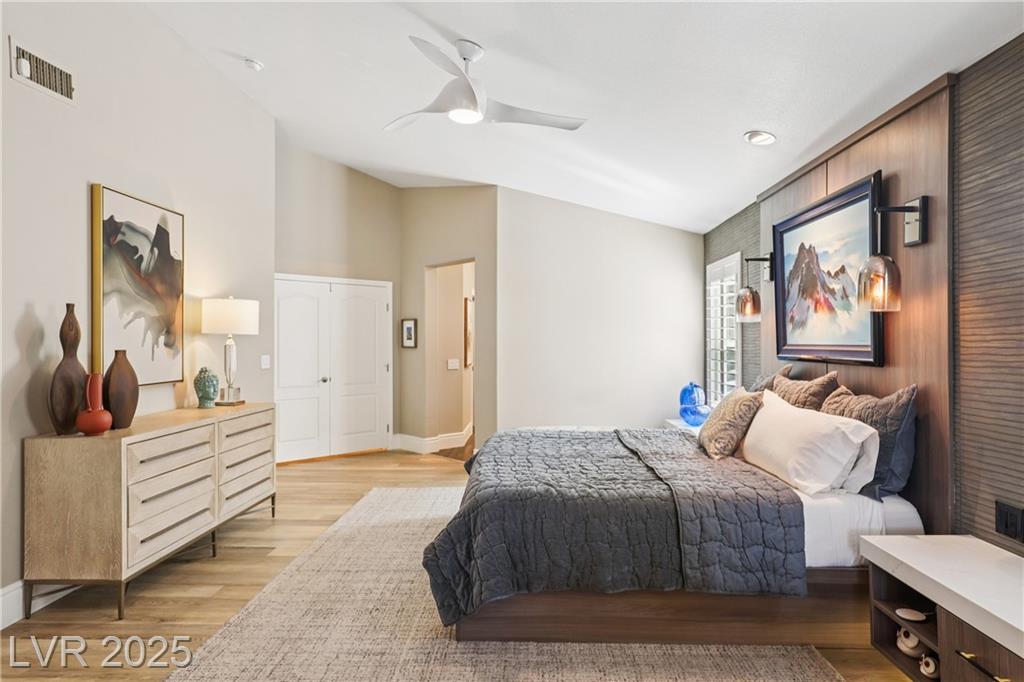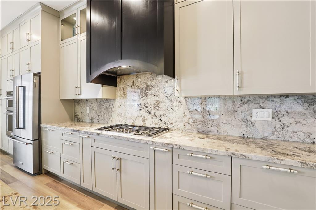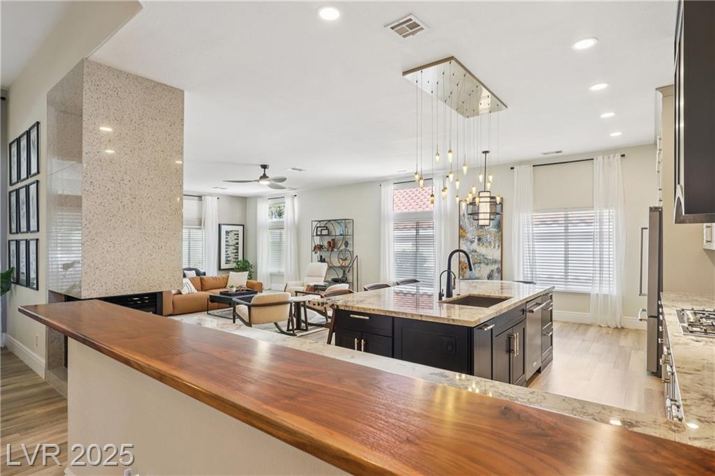 Modern elegance meets prime Green Valley living! This beautifully updated 4-bed, 2.5-bath home offers 2,956 sq ft, a 3-car garage, and OWNED SOLAR. Professionally designed with custom cabinetry in the baths and kitchen, including large drawers, stainless steel appliances, and an under-counter ice maker. Enjoy a large primary suite with a sitting room and a luxurious bathroom. Designer lighting, new flooring, tiled bathroom walls, black walnut accent walls, and curated finishes create a polished, elevated feel throughout. Enjoy newer A/C units, new west-facing windows, and an extended patio cover overlooking a spacious backyard with room for a pool. Move into a newly epoxied garage floor, plus fresh pavers and landscaping, both front and rear. Perfectly located within walking distance to The District, Lifetime Fitness, and Green Valley Ranch Resort, and zoned for top-rated schools. Experience the best of Green Valley living in a home that blends comfort, style, & unbeatable convenience.